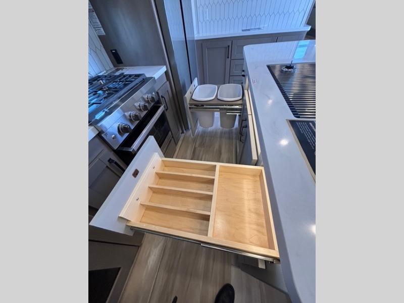 This fifth wheel might be your perfect retreat! The private rear bedroom comes with a standard queen bed, or upgrade to a king for even more room to relax. Up front you'll find a living room perfect for entertaining, with dual tri-fold sofas plus a pair of theater seats. The focal point is the entertainment center which is equipped with a 50" TV on a lift. The central kitchen is well-equipped for cooking, with a 16 cu. ft. refrigerator and a center island. A booth dinette provides great seating, or opt for the swivel dinette.