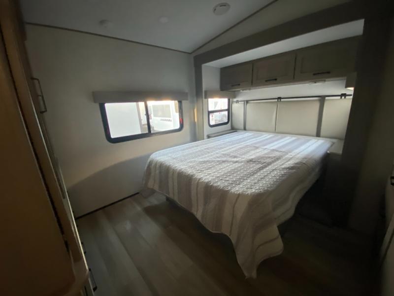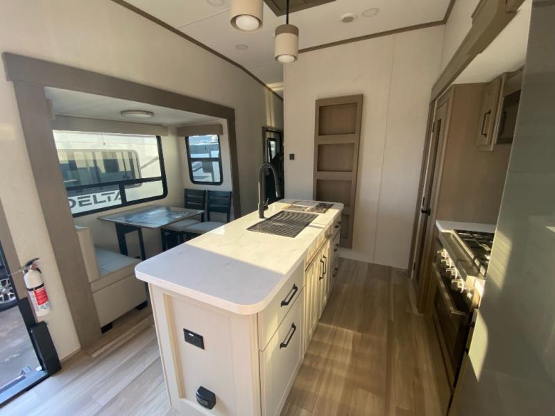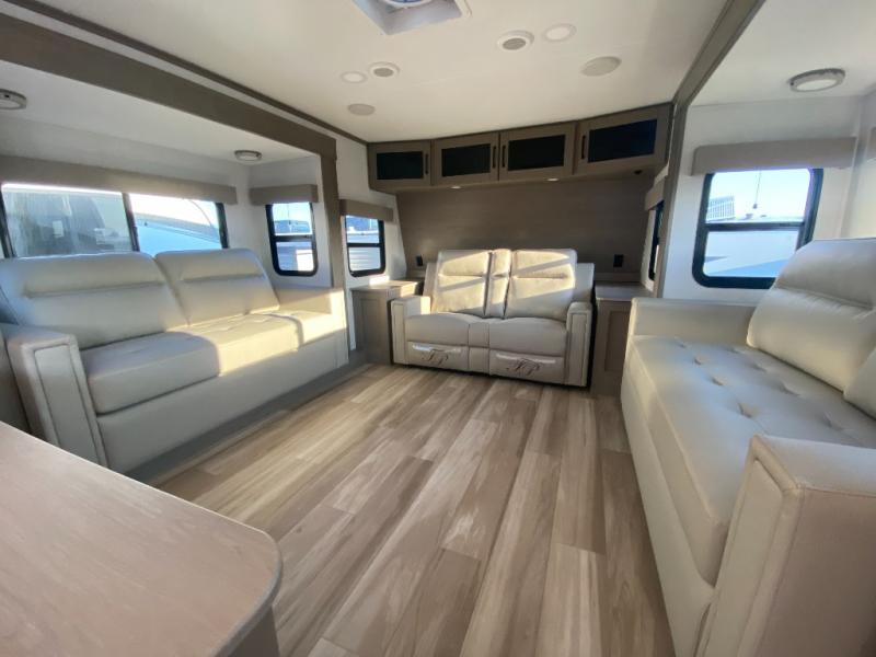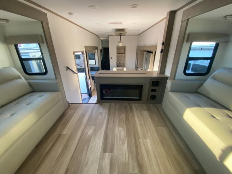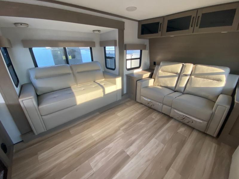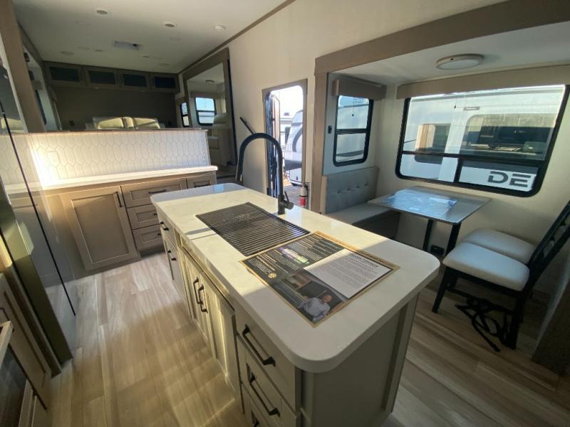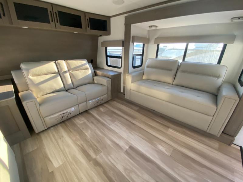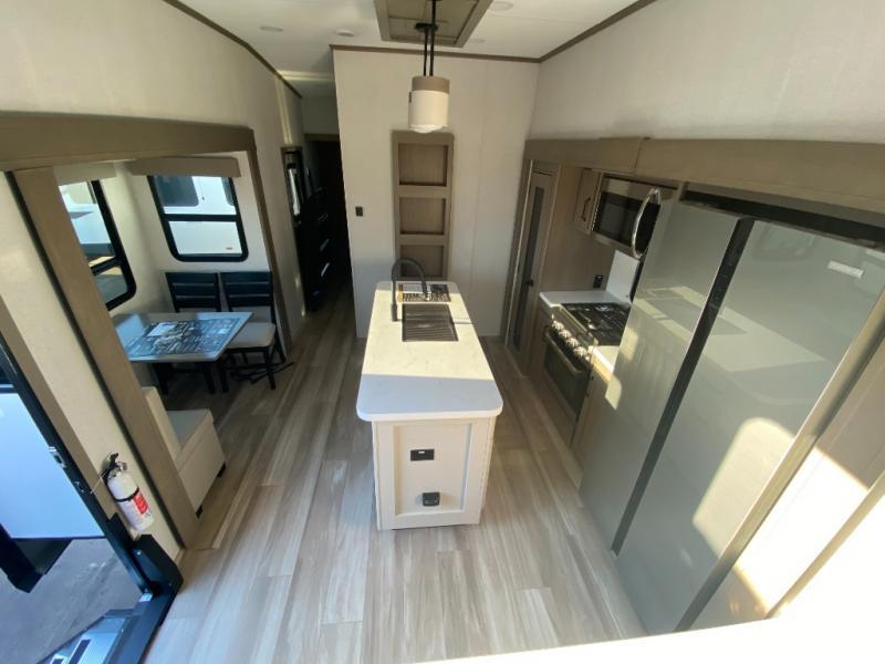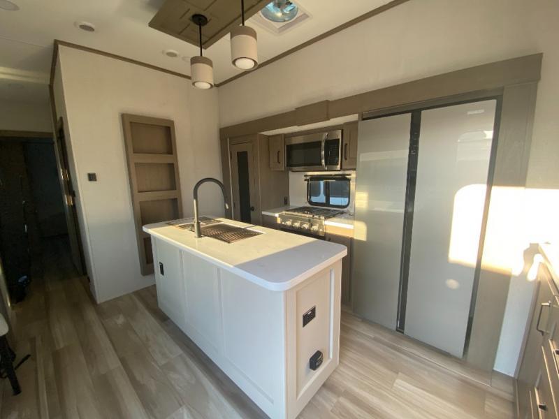 This fifth wheel might be your perfect retreat! The private rear bedroom comes with a standard queen bed, or upgrade to a king for even more room to relax. Up front you'll find a living room perfect for entertaining, with dual tri-fold sofas plus a pair of theater seats. The focal point is the entertainment center which is equipped with a 50" TV on a lift. The central kitchen is well-equipped for cooking, with a 16 cu. ft. refrigerator and a center island. A booth dinette provides great seating, or opt for the swivel dinette.