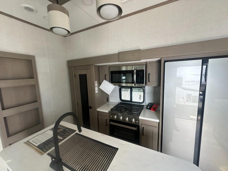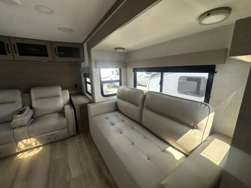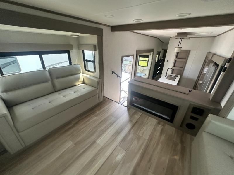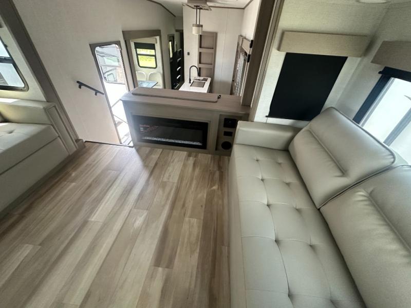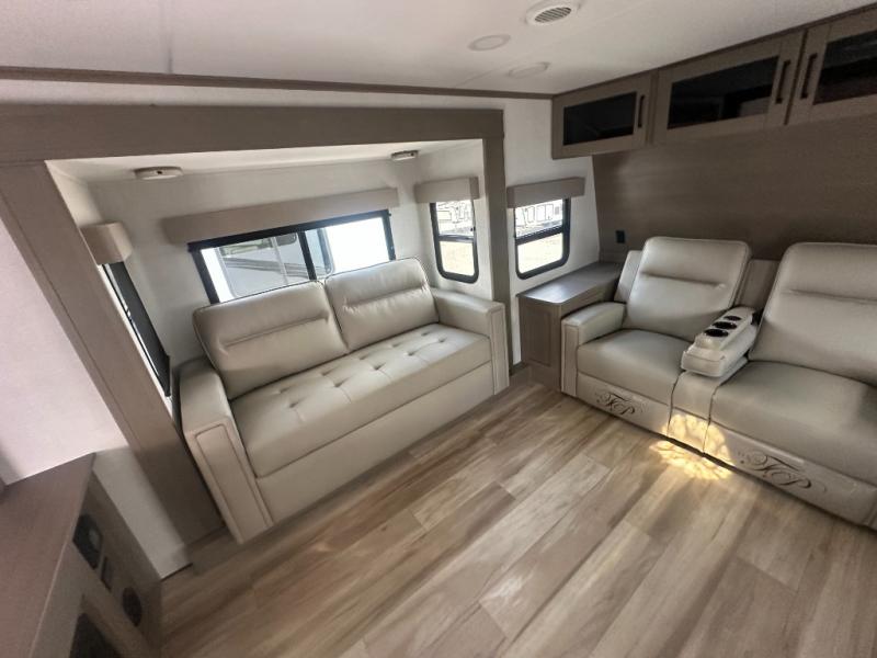 This fifth wheel might be your perfect retreat! The private rear bedroom comes with a standard queen bed, or upgrade to a king for even more room to relax. Up front you'll find a living room perfect for entertaining, with dual tri-fold sofas plus a pair of theater seats. The focal point is the entertainment center which is equipped with a 50" TV on a lift. The central kitchen is well-equipped for cooking, with a 16 cu. ft. refrigerator and a center island. A booth dinette provides great seating, or opt for the swivel dinette.
