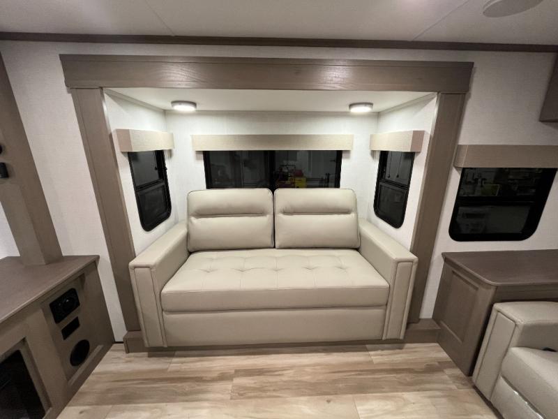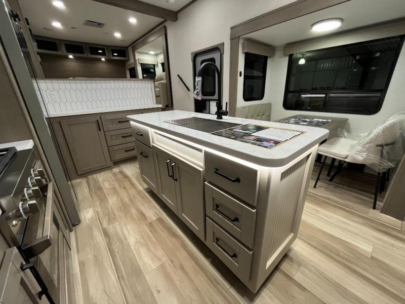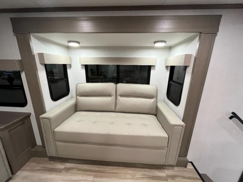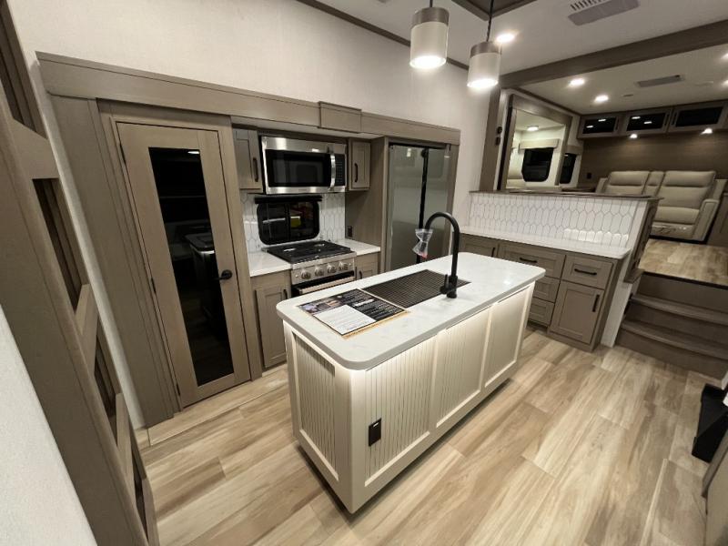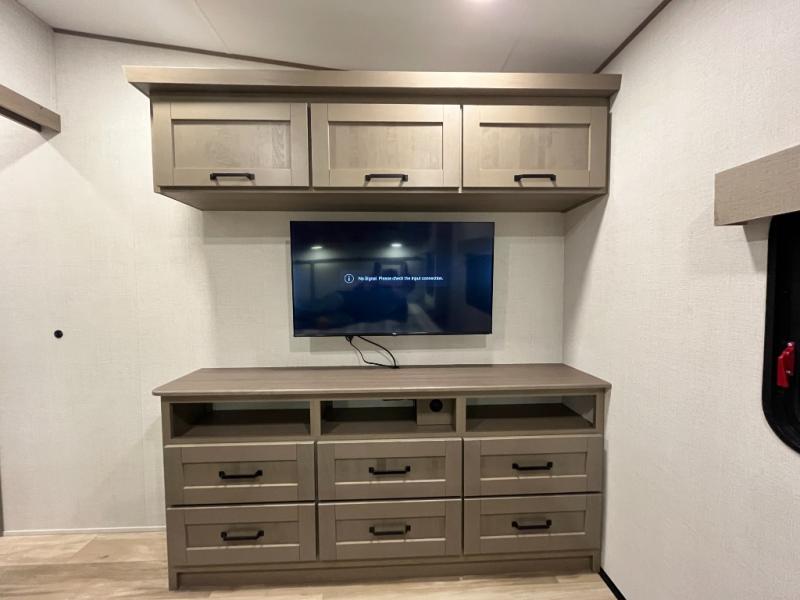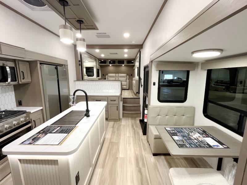 This fifth wheel might be your perfect retreat! The private rear bedroom comes with a standard queen bed, or upgrade to a king for even more room to relax. Up front you'll find a living room perfect for entertaining, with dual tri-fold sofas plus a pair of theater seats. The focal point is the entertainment center which is equipped with a 50" TV on a lift. The central kitchen is well-equipped for cooking, with a 16 cu. ft. refrigerator and a center island. A booth dinette provides great seating, or opt for the swivel dinette.