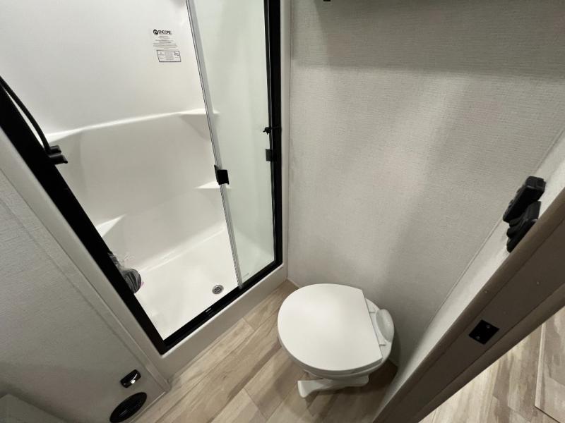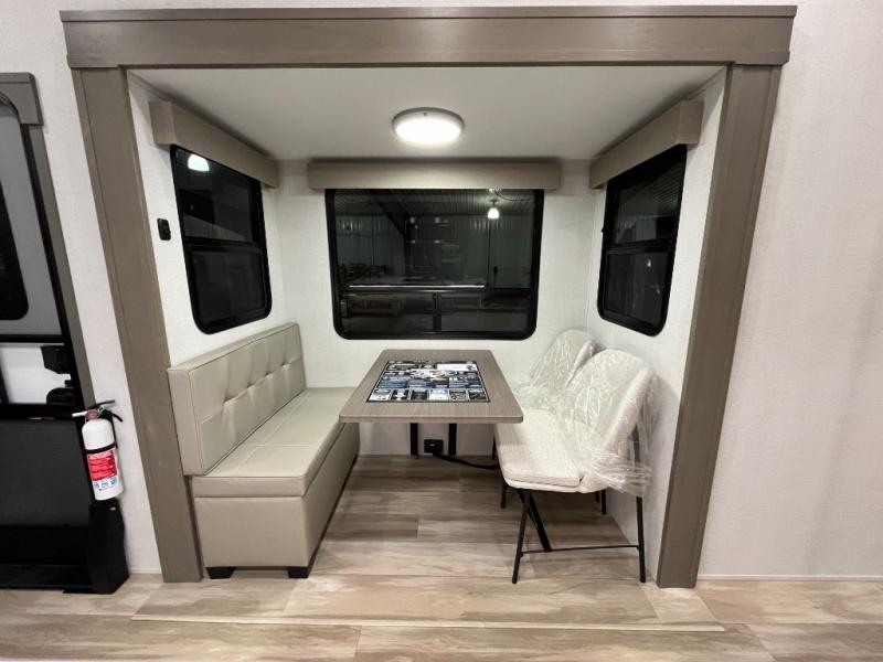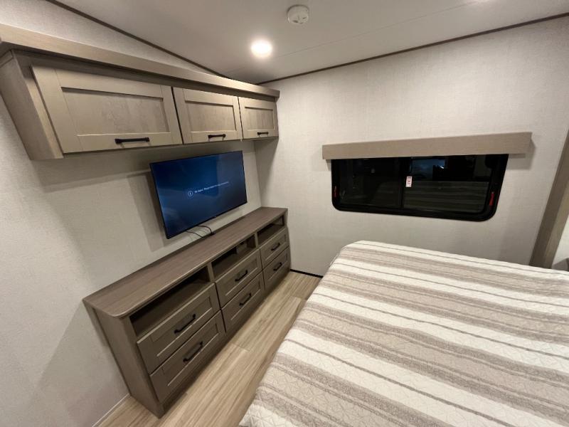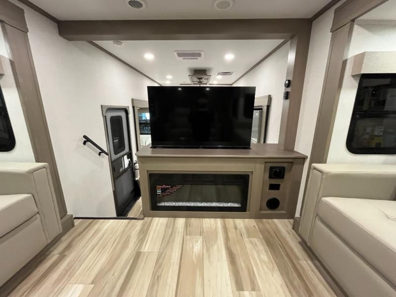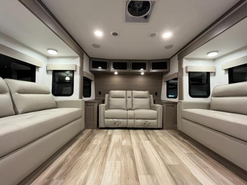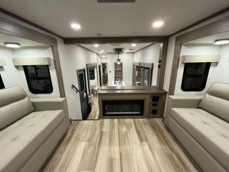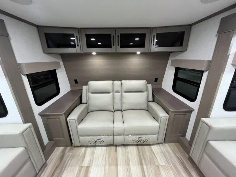 This fifth wheel might be your perfect retreat! The private rear bedroom comes with a standard queen bed, or upgrade to a king for even more room to relax. Up front you'll find a living room perfect for entertaining, with dual tri-fold sofas plus a pair of theater seats. The focal point is the entertainment center which is equipped with a 50" TV on a lift. The central kitchen is well-equipped for cooking, with a 16 cu. ft. refrigerator and a center island. A booth dinette provides great seating, or opt for the swivel dinette.