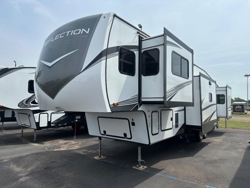 With any Reflection fifth wheel by Grand Design, you will have a solar panel for off-grid camping and a 60 amp charge controller and inverter prep, a Universal All-In-One docking station, unobstructed pass-through storage, and Goodyear Endurance tires. Each is constructed of gel coat exterior sidewalls, residential 5" truss rafters, walk-on roof decking, a fiberglass and radiant foil roof and front cap insulation plus laminated aluminum framed side walls, roof and end walls in slide rooms. Head inside to enjoy residential hardwood cabinet doors, premium Congoleum flooring, a spacious shower with a glass door, and many more comforts!