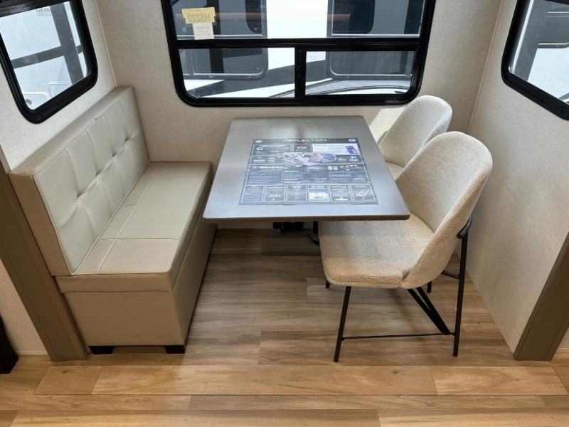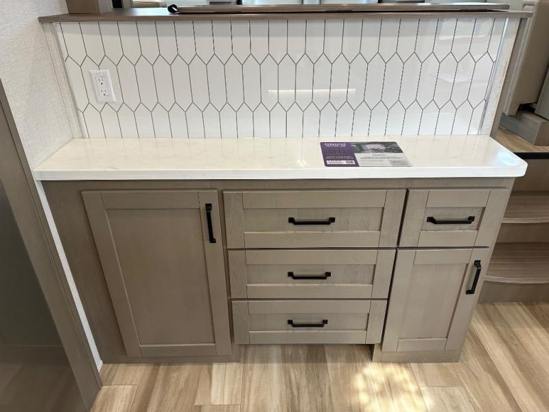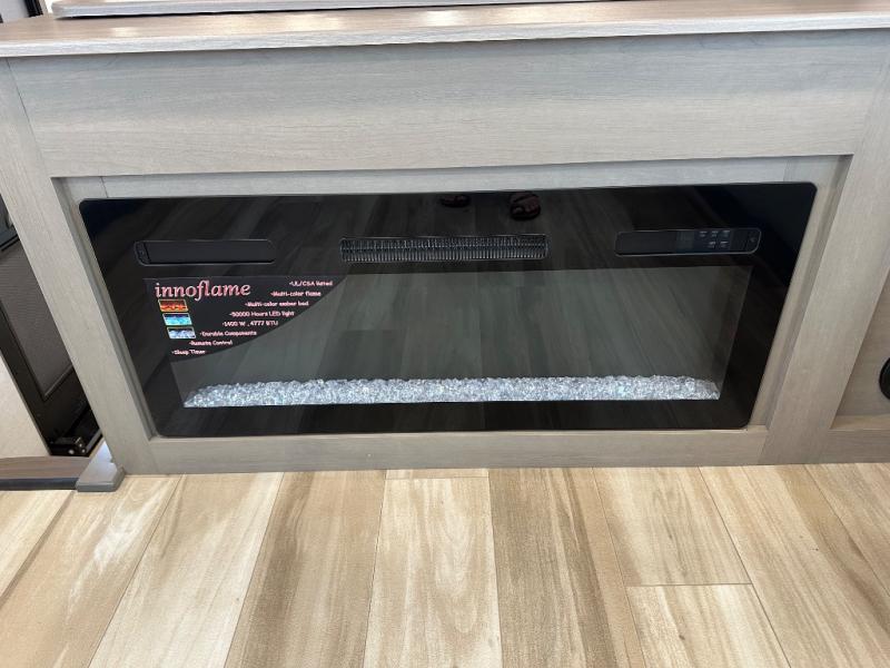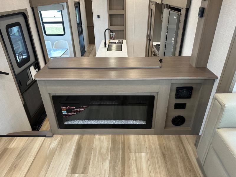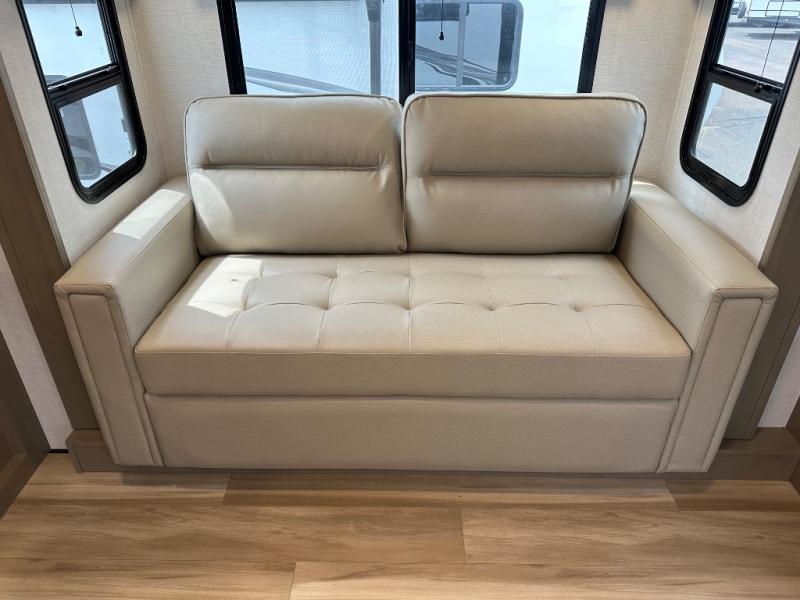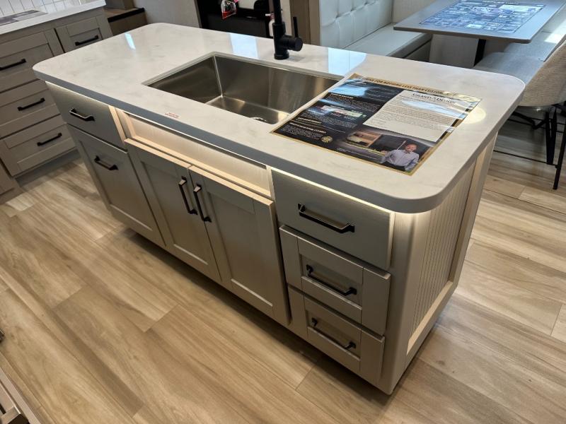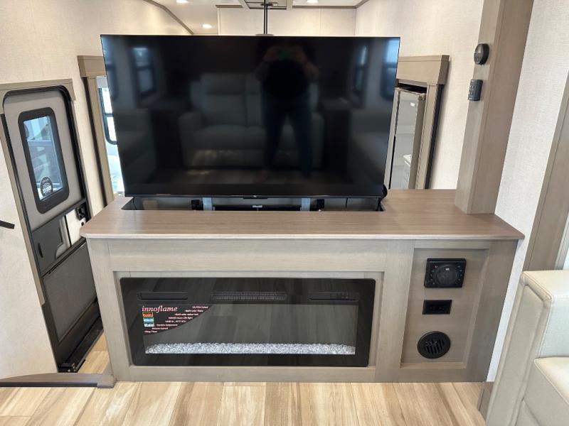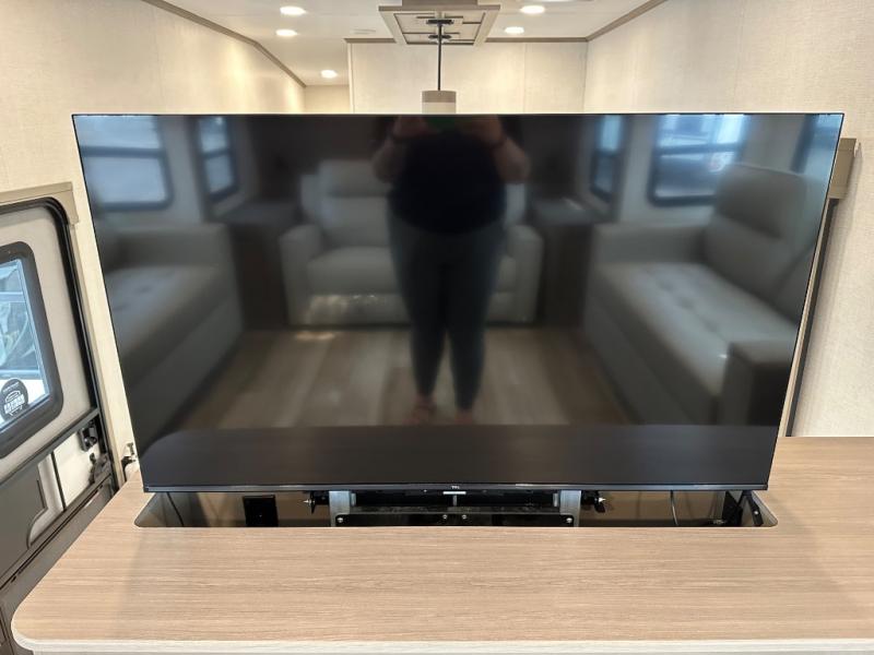 This fifth wheel might be your perfect retreat! The private rear bedroom comes with a standard queen bed, or upgrade to a king for even more room to relax. Up front you'll find a living room perfect for entertaining, with dual tri-fold sofas plus a pair of theater seats. The focal point is the entertainment center which is equipped with a 50" TV on a lift. The central kitchen is well-equipped for cooking, with a 16 cu. ft. refrigerator and a center island. A booth dinette provides great seating, or opt for the swivel dinette.