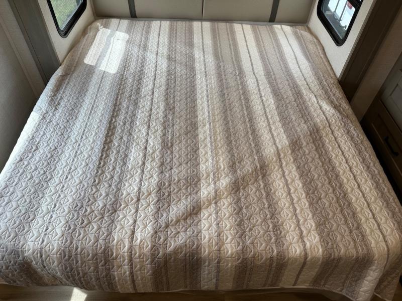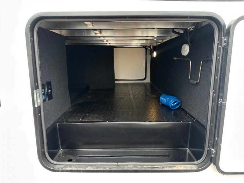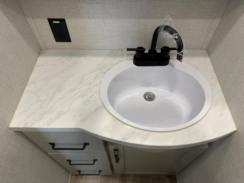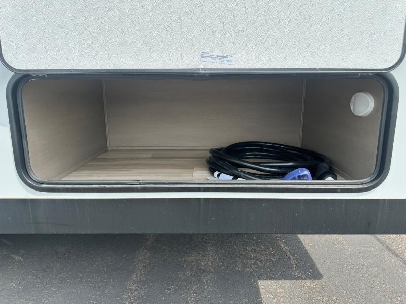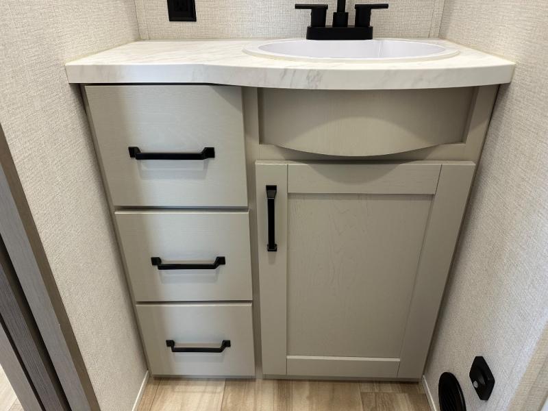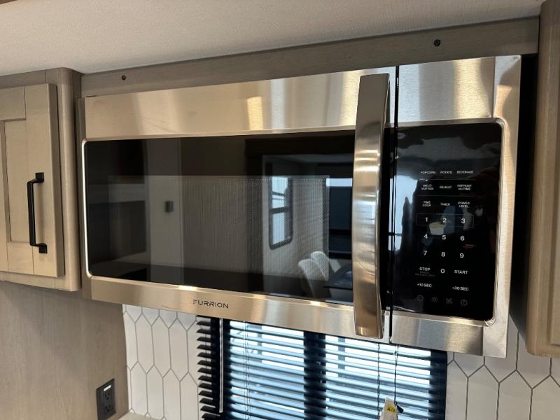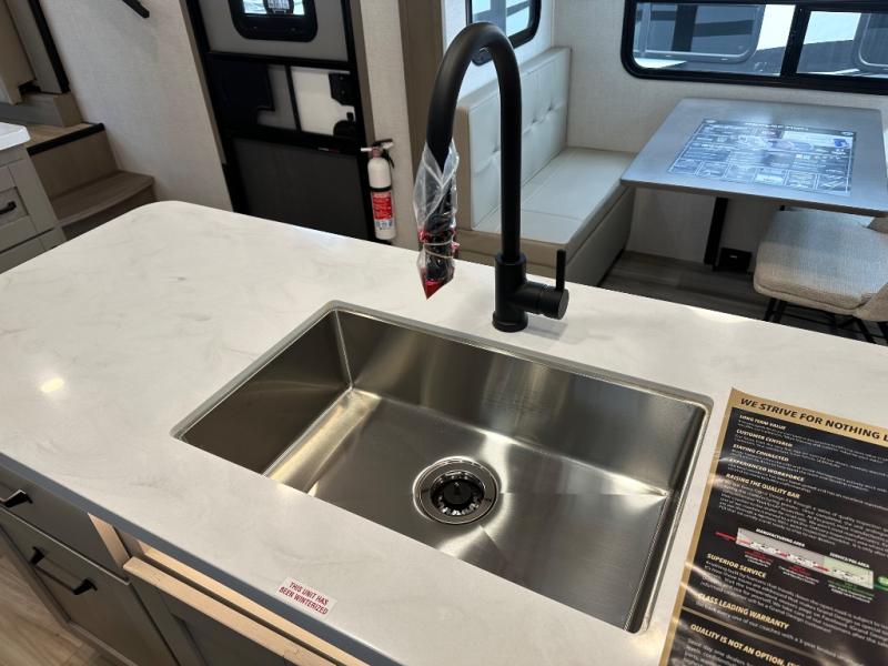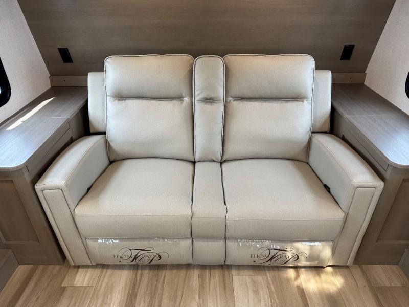 This fifth wheel might be your perfect retreat! The private rear bedroom comes with a standard queen bed, or upgrade to a king for even more room to relax. Up front you'll find a living room perfect for entertaining, with dual tri-fold sofas plus a pair of theater seats. The focal point is the entertainment center which is equipped with a 50" TV on a lift. The central kitchen is well-equipped for cooking, with a 16 cu. ft. refrigerator and a center island. A booth dinette provides great seating, or opt for the swivel dinette.