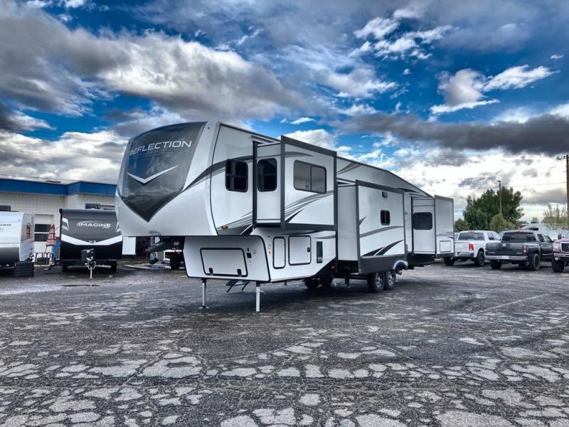 With any Reflection fifth wheel by Grand Design, you will have a solar panel for off-grid camping and a 60 amp charge controller and inverter prep, a Universal All-In-One docking station, unobstructed pass-through storage, and Goodyear Endurance tires. Each is constructed of gel coat exterior sidewalls, residential 5" truss rafters, walk-on roof decking, a fiberglass and radiant foil roof and front cap insulation plus laminated aluminum framed side walls, roof and end walls in slide rooms. Head inside to enjoy residential hardwood cabinet doors, premium Congoleum flooring, a spacious shower with a glass door, and many more comforts!