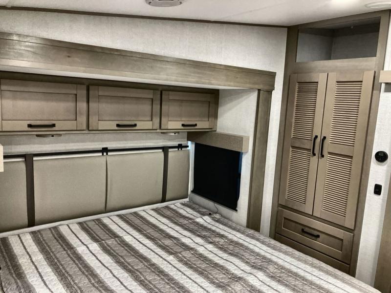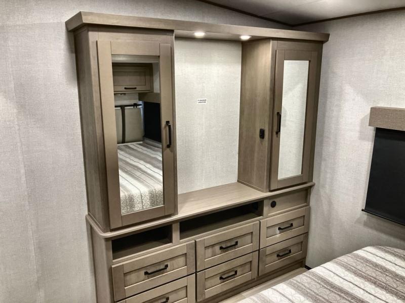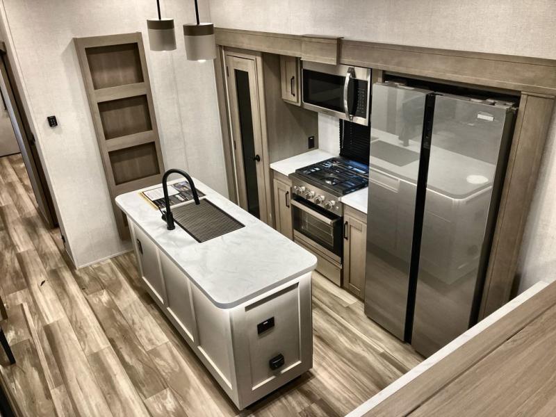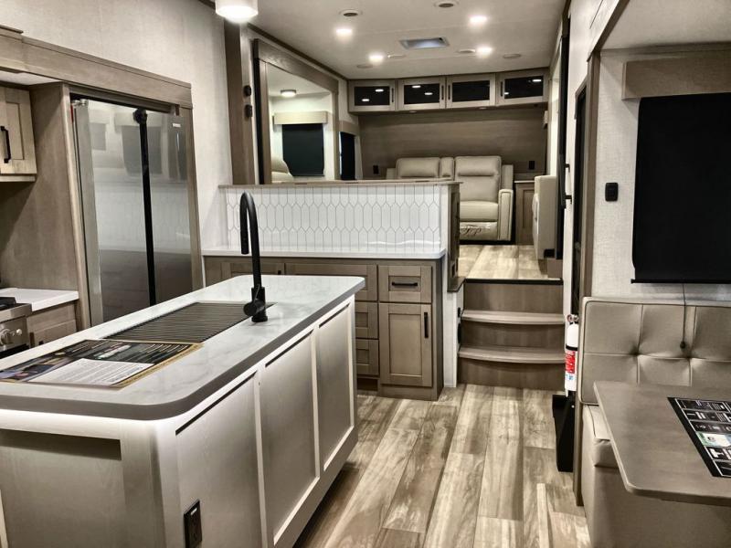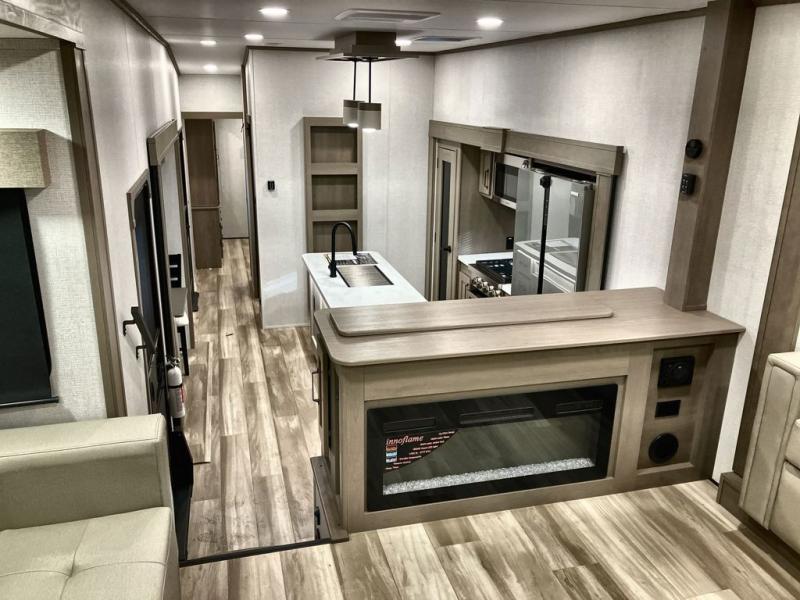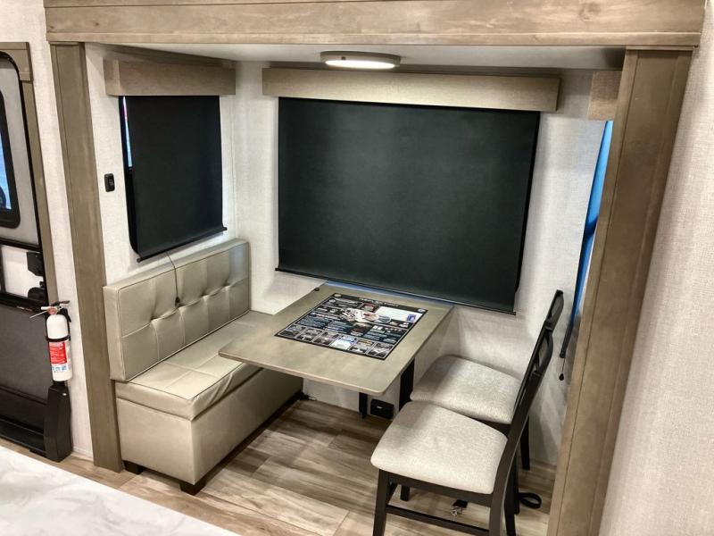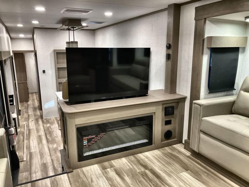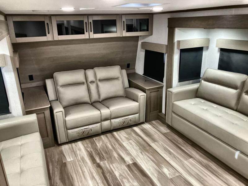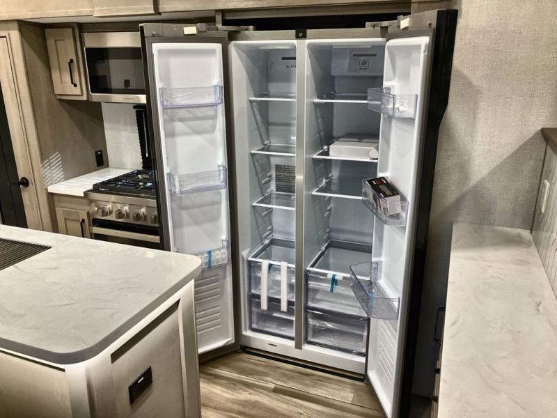 This fifth wheel might be your perfect retreat! The private rear bedroom comes with a standard queen bed, or upgrade to a king for even more room to relax. Up front you'll find a living room perfect for entertaining, with dual tri-fold sofas plus a pair of theater seats. The focal point is the entertainment center which is equipped with a 50" TV on a lift. The central kitchen is well-equipped for cooking, with a 16 cu. ft. refrigerator and a center island. A booth dinette provides great seating, or opt for the swivel dinette.