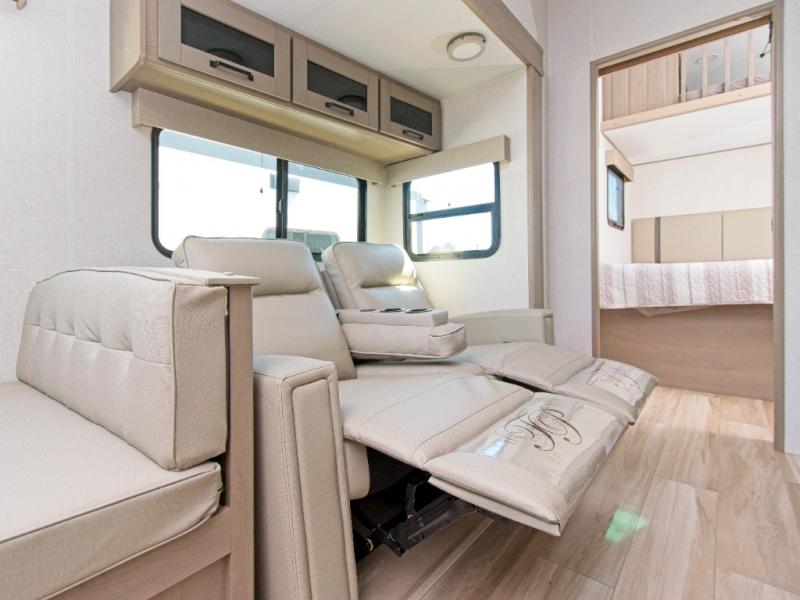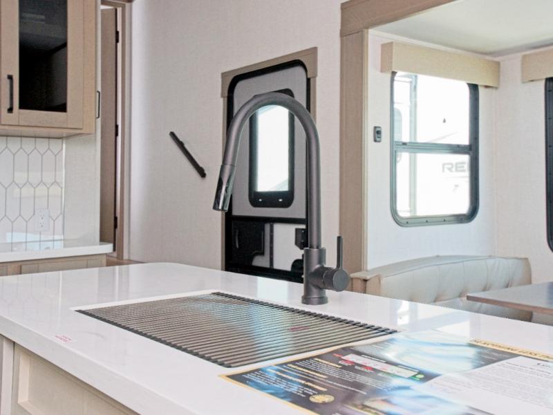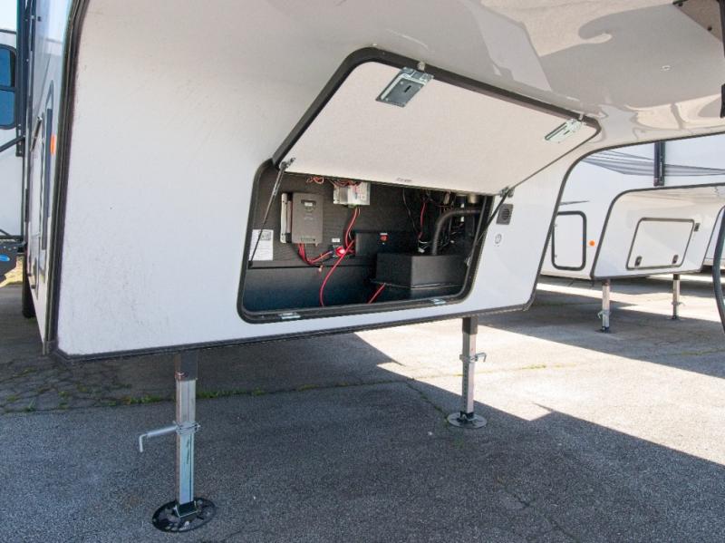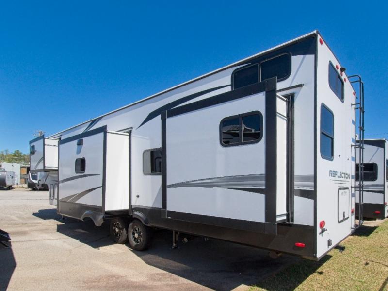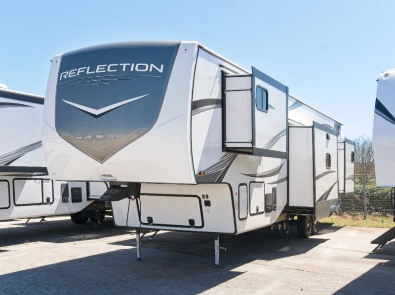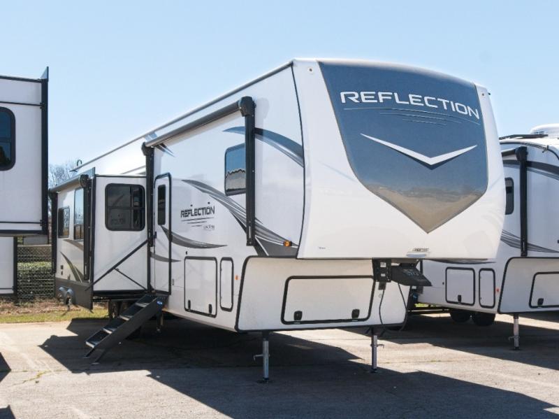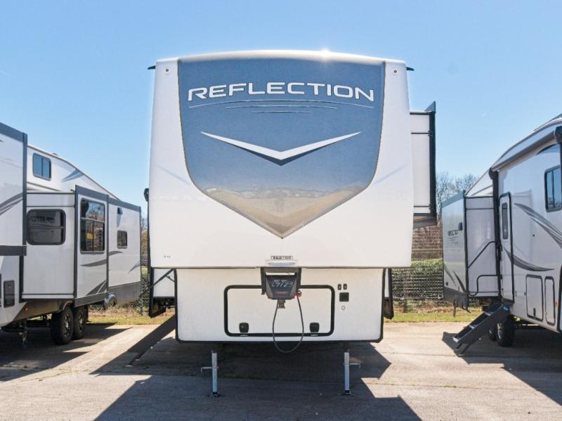 Enhanced Towing and Safety Features: The Reflection 150 Series is designed for a broader range of half-ton trucks, offering more payload capacity and eliminating the need for a slider hitch thanks to its 90-degree turning radius. The Ultimate Power Package includes a "One-Touch" automatic leveling system, a detachable power cord with LED light, motion sensor pass-through lighting, and entry lighting. The Tire Linc TPMS ensures you stay safe on the road.