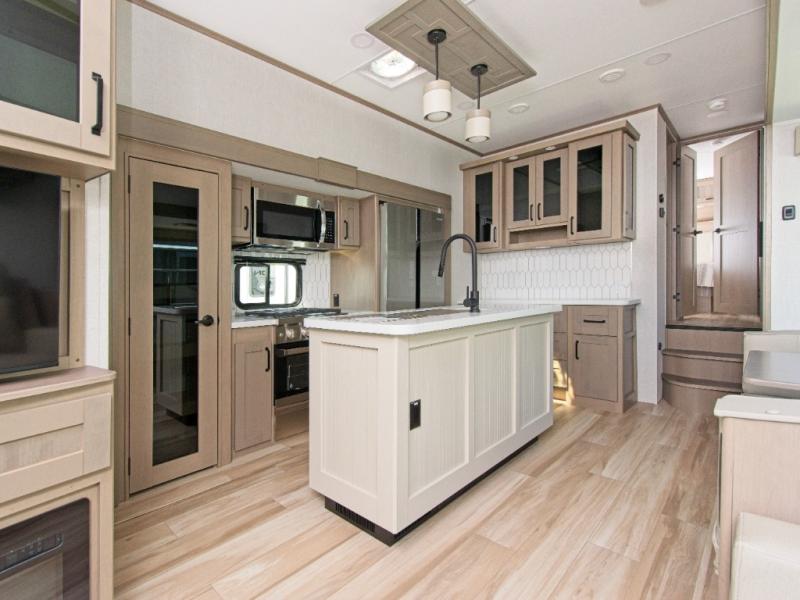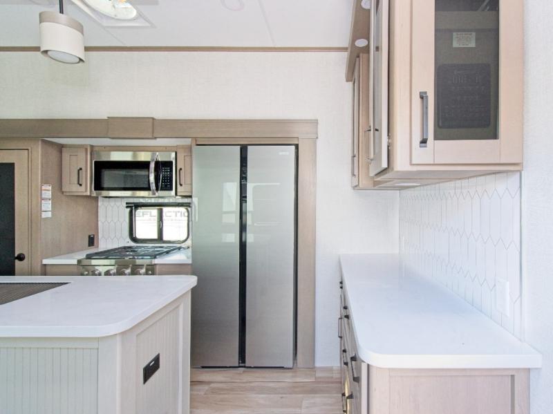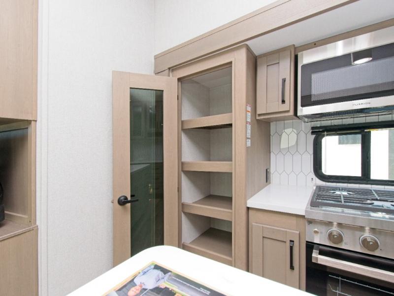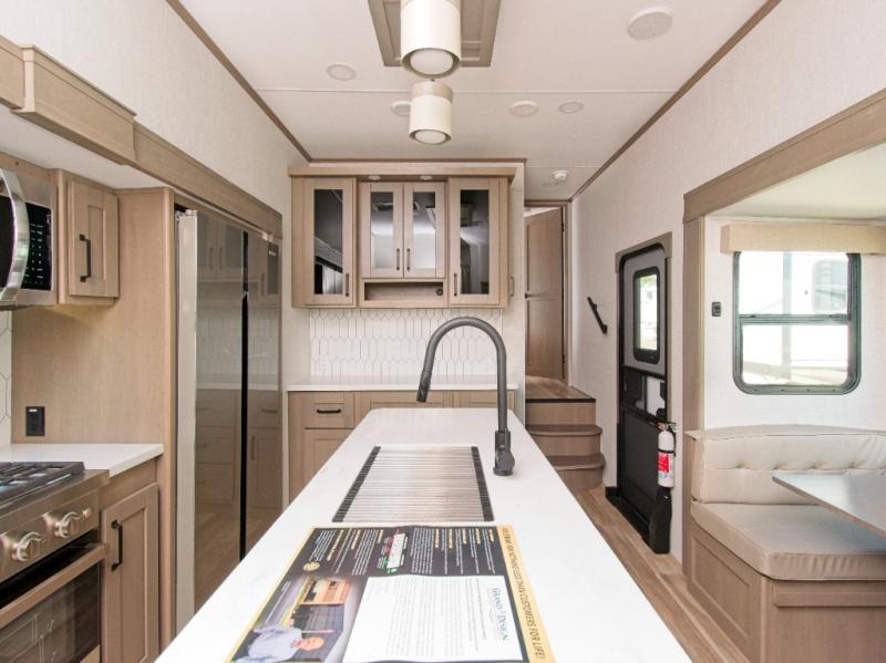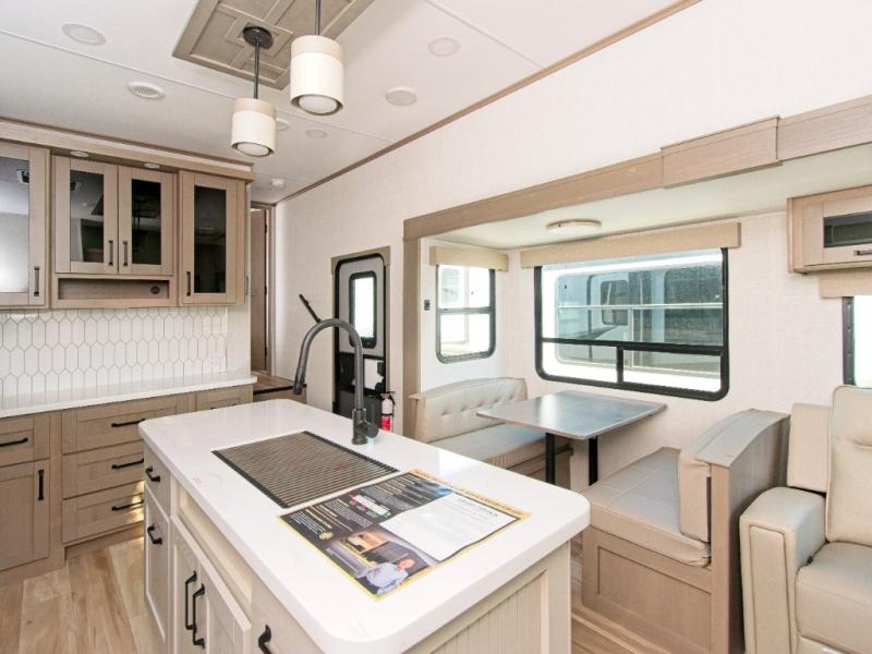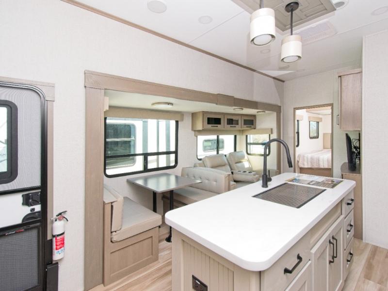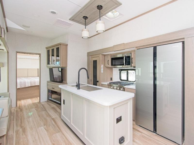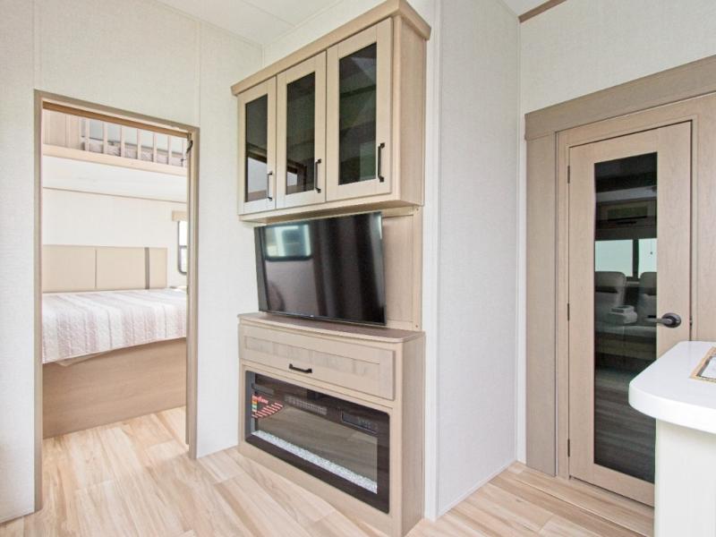 Spacious and Luxurious Interior: Inside, you'll find a roomy living area and kitchen with dual opposing slides for maximum space. Relax on the tri-fold sofa or the booth dinette, with an optional swivel dinette available. The kitchen island and hutch provide ample counter space for meal prep and serving, while the large pantry keeps your goodies organized. Enjoy entertainment on the 40" LED HDTV with a cozy fireplace below, perfect for rainy days or evening relaxation. The front bedroom offers a private retreat with a walk-around queen bed and plenty of storage.