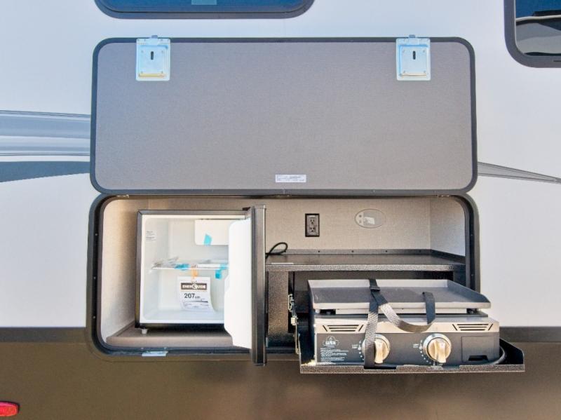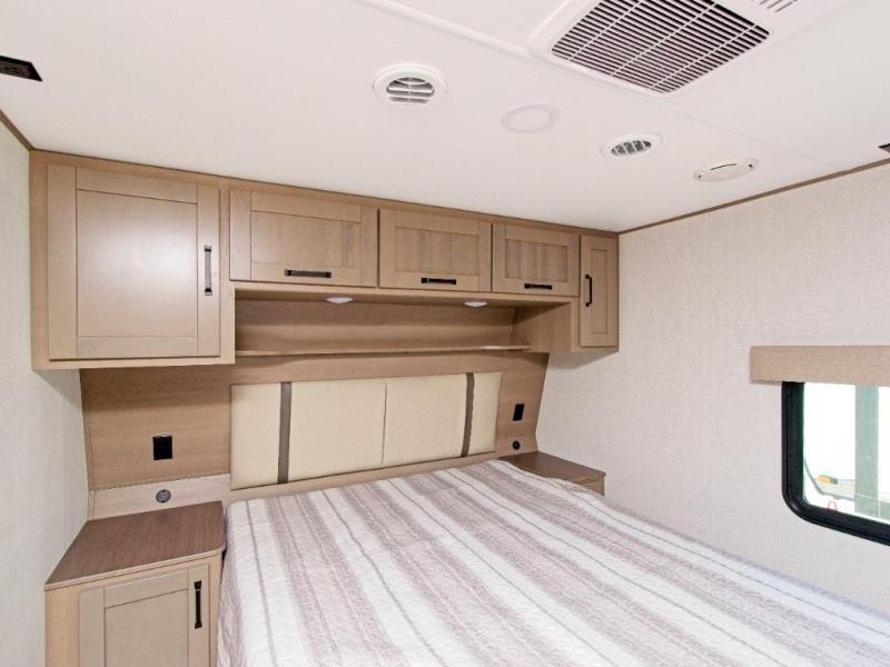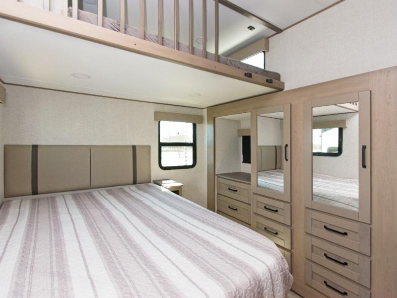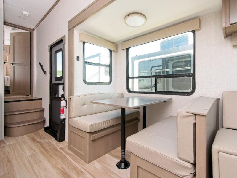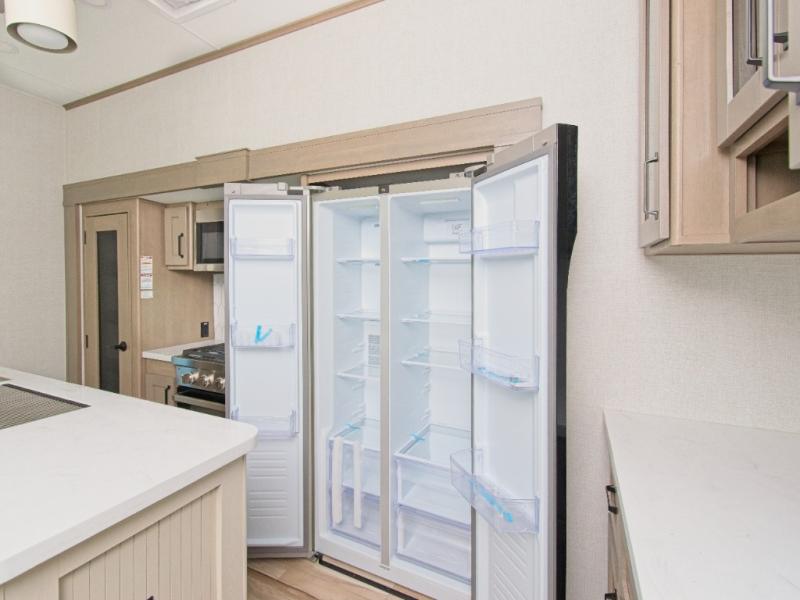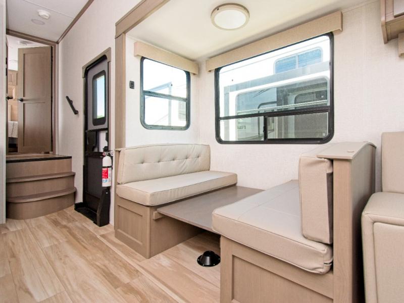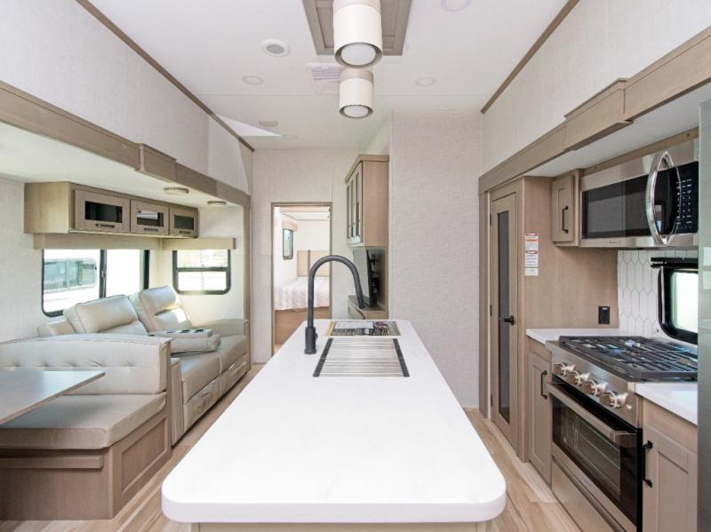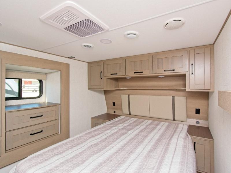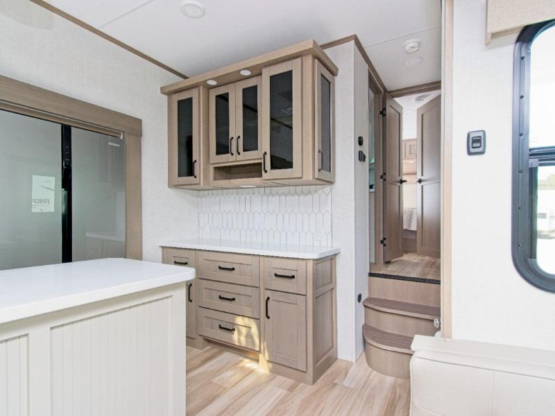 Spacious and Luxurious Interior: Inside, you'll find a roomy living area and kitchen with dual opposing slides for maximum space. Relax on the tri-fold sofa or the booth dinette, with an optional swivel dinette available. The kitchen island and hutch provide ample counter space for meal prep and serving, while the large pantry keeps your goodies organized. Enjoy entertainment on the 40" LED HDTV with a cozy fireplace below, perfect for rainy days or evening relaxation. The front bedroom offers a private retreat with a walk-around queen bed and plenty of storage.