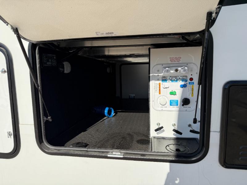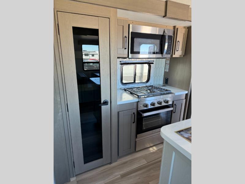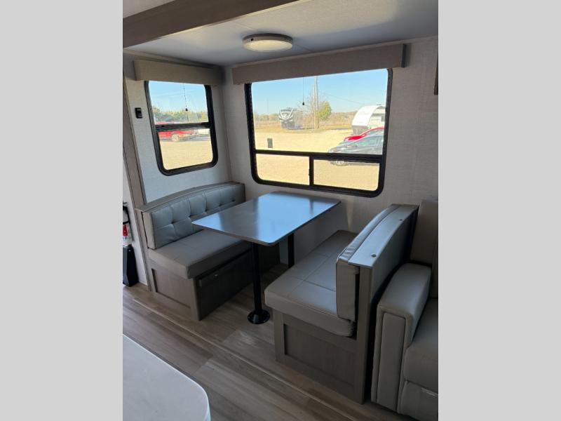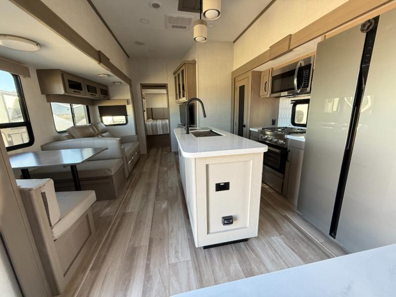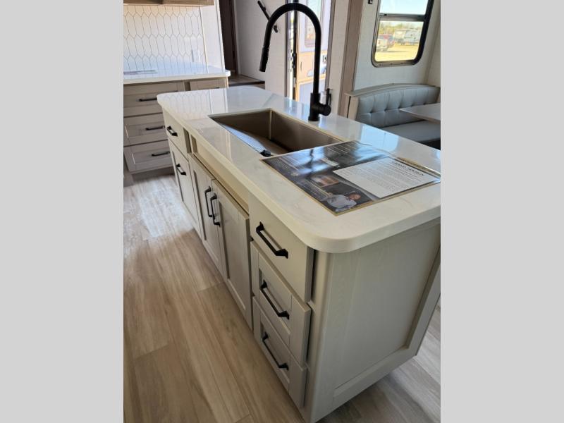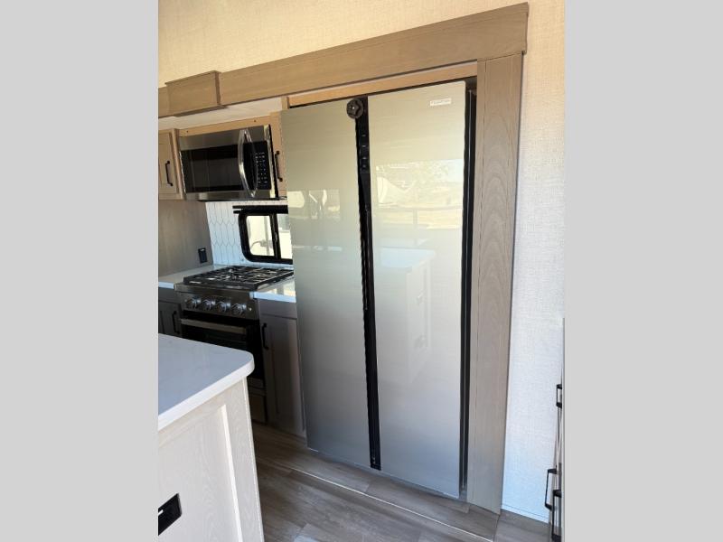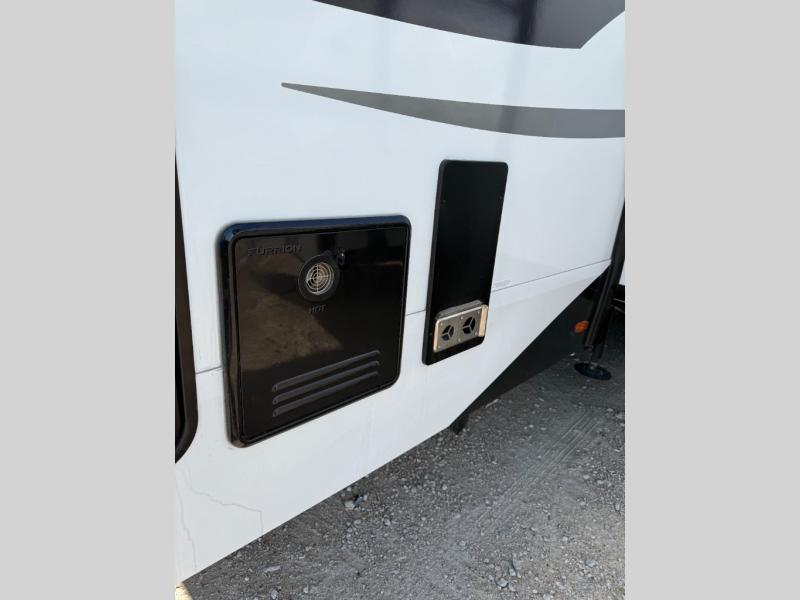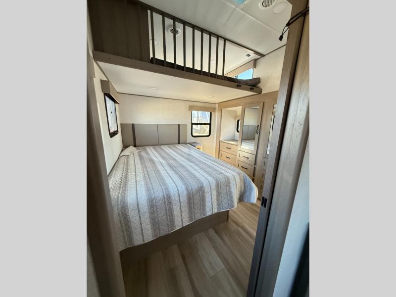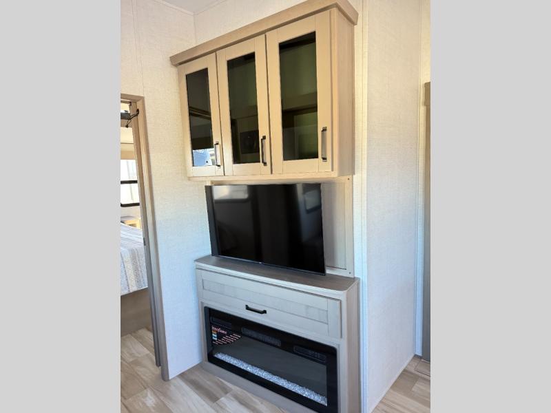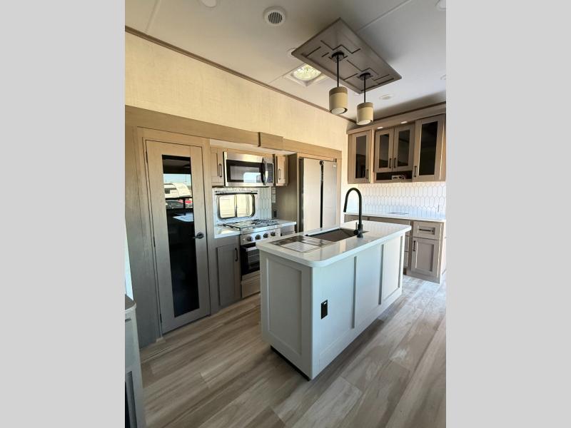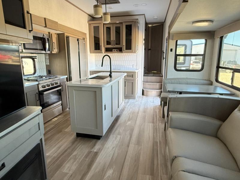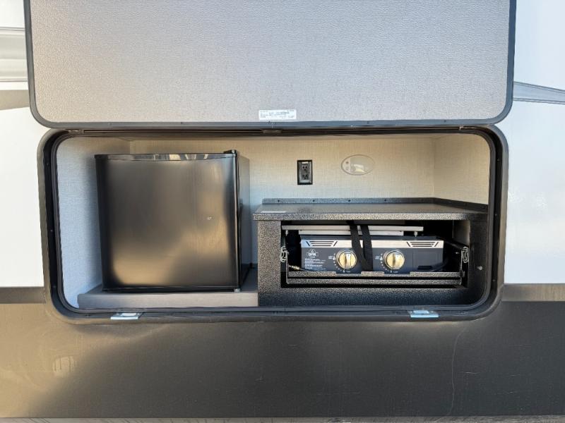 There is a whole lot to love about this fifth wheel! The front private bedroom has a queen bed to lay your head on at night, a slide with drawers and a linen closet, and even an entrance into the dual entry bathroom. The second private bedroom has a 54" x 74" top bed above a queen bed, a slide with a closet and drawers, and its very own half bathroom. The chef will have an easy time preparing delicious home cooked meals with the kitchen island, plus there is an outside kitchen complete with a 4.1 cu. ft. refrigerator to enjoy a cold beverage while you grill on the griddle. Enjoy a relaxing evening indoors either playing games at the booth dinette or on the theater seating across from the entertainment center with a fireplace and 40" TV. You could even switch out the seating for an optional tri-fold sofa or the dinette for an optional swivel dinette!