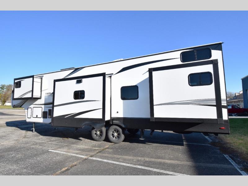 The Reflection fifth wheel is designed for all seasons! With the Arctic 4-Seasons Protection Package, you can camp comfortably in any climate. The MORryde 3000CRE suspension ensures smooth towing, while luxurious interior features like residential cabinetry and solid surface countertops make you feel right at home.