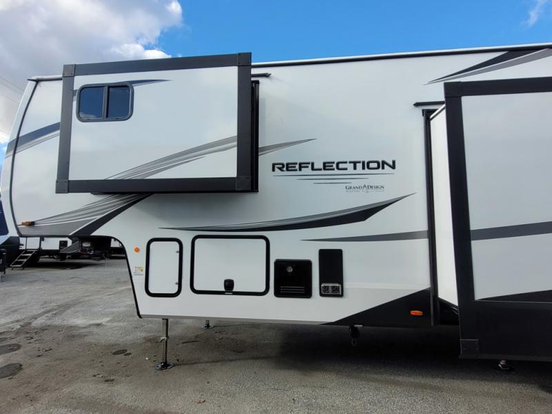 With any Reflection fifth wheel by Grand Design, you will have a solar panel for off-grid camping and a 60 amp charge controller and inverter prep, a Universal All-In-One docking station, unobstructed pass-through storage, and Goodyear Endurance tires. Each is constructed of gel coat exterior sidewalls, residential 5" truss rafters, walk-on roof decking, a fiberglass and radiant foil roof and front cap insulation plus laminated aluminum framed side walls, roof and end walls in slide rooms. Head inside to enjoy residential hardwood cabinet doors, premium Congoleum flooring, a spacious shower with a glass door, and many more comforts!