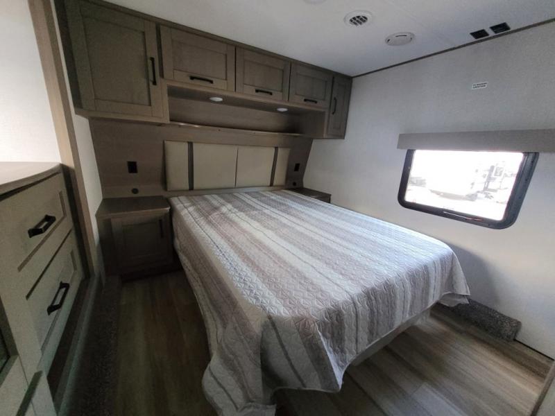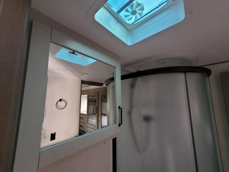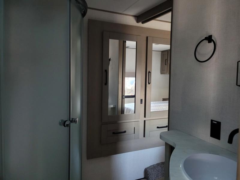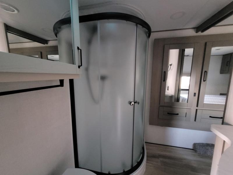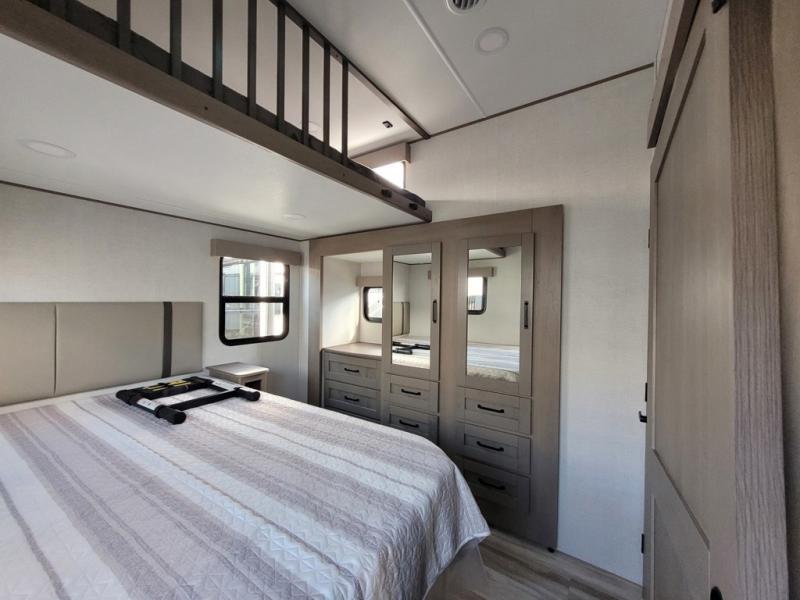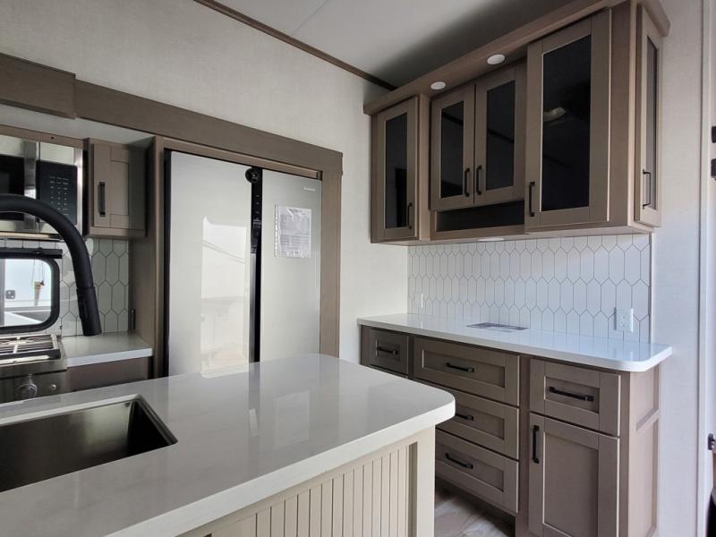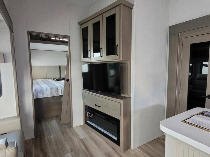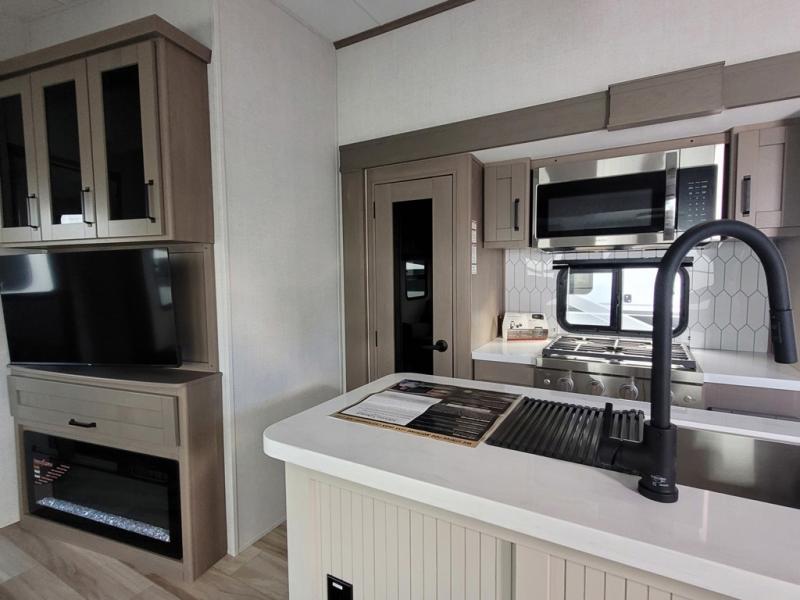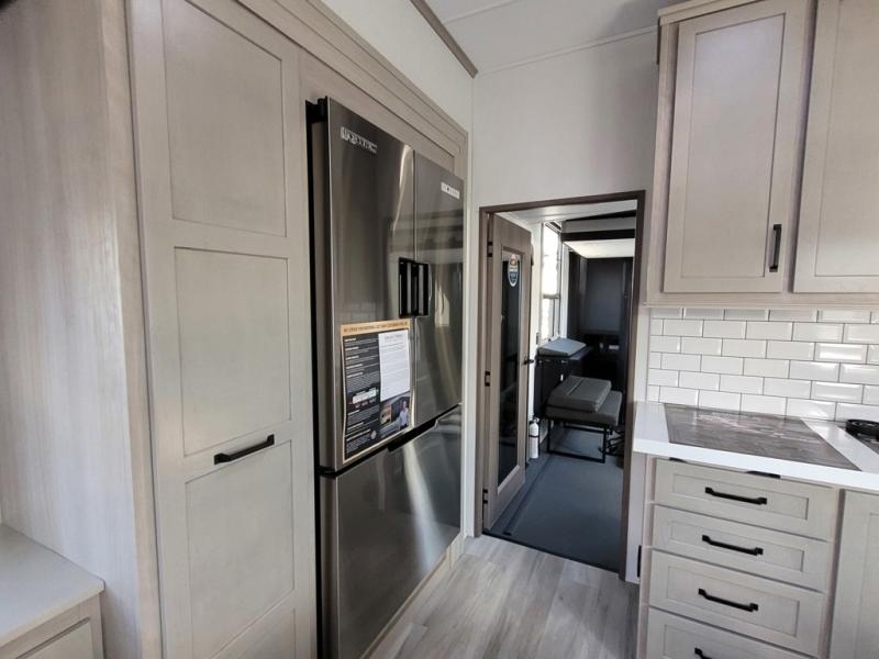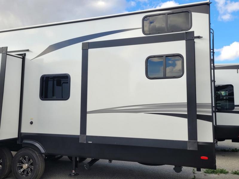 There is a whole lot to love about this fifth wheel! The front private bedroom has a queen bed to lay your head on at night, a slide with drawers and a linen closet, and even an entrance into the dual entry bathroom. The second private bedroom has a 54" x 74" top bed above a queen bed, a slide with a closet and drawers, and its very own half bathroom. The chef will have an easy time preparing delicious home cooked meals with the kitchen island, plus there is an outside kitchen complete with a 4.1 cu. ft. refrigerator to enjoy a cold beverage while you grill on the griddle. Enjoy a relaxing evening indoors either playing games at the booth dinette or on the theater seating across from the entertainment center with a fireplace and 40" TV. You could even switch out the seating for an optional tri-fold sofa or the dinette for an optional swivel dinette!