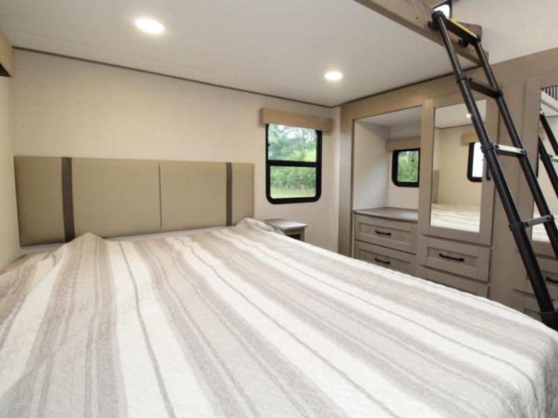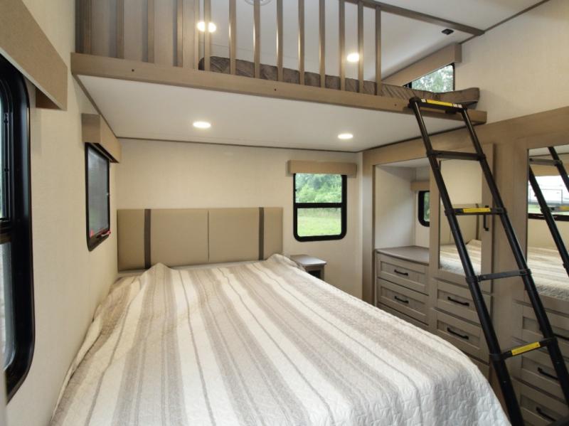 Two Private Bedrooms – Includes a front queen bedroom and a second private bedroom with a queen bed and overhead bunk.