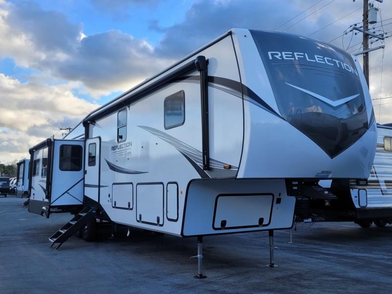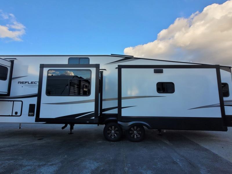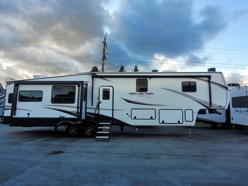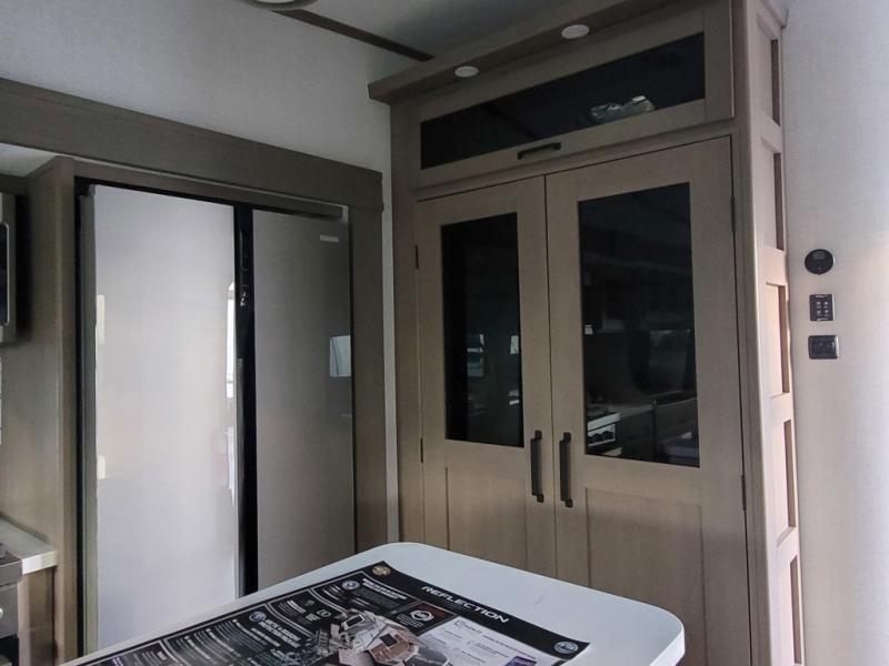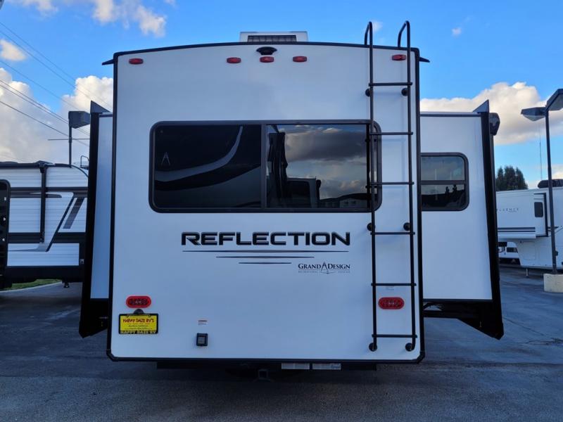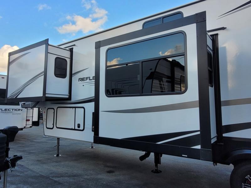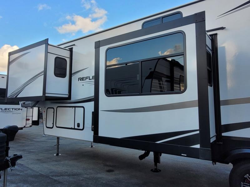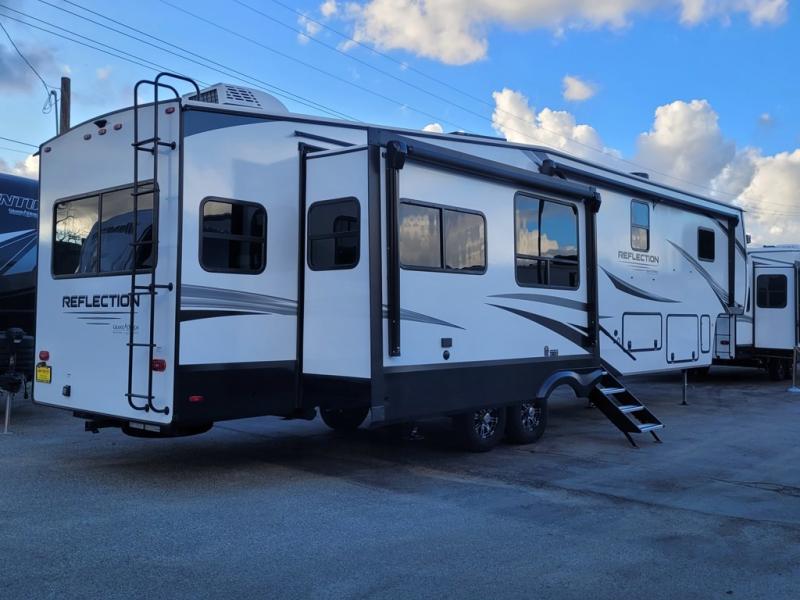 With any Reflection fifth wheel by Grand Design, you will have a solar panel for off-grid camping and a 60 amp charge controller and inverter prep, a Universal All-In-One docking station, unobstructed pass-through storage, and Goodyear Endurance tires. Each is constructed of gel coat exterior sidewalls, residential 5" truss rafters, walk-on roof decking, a fiberglass and radiant foil roof and front cap insulation plus laminated aluminum framed side walls, roof and end walls in slide rooms. Head inside to enjoy residential hardwood cabinet doors, premium Congoleum flooring, a spacious shower with a glass door, and many more comforts!