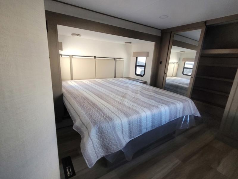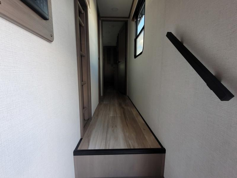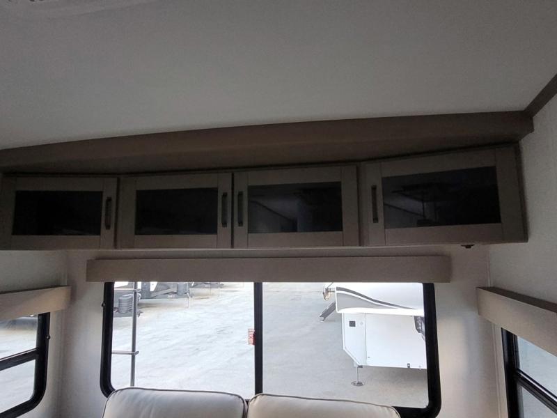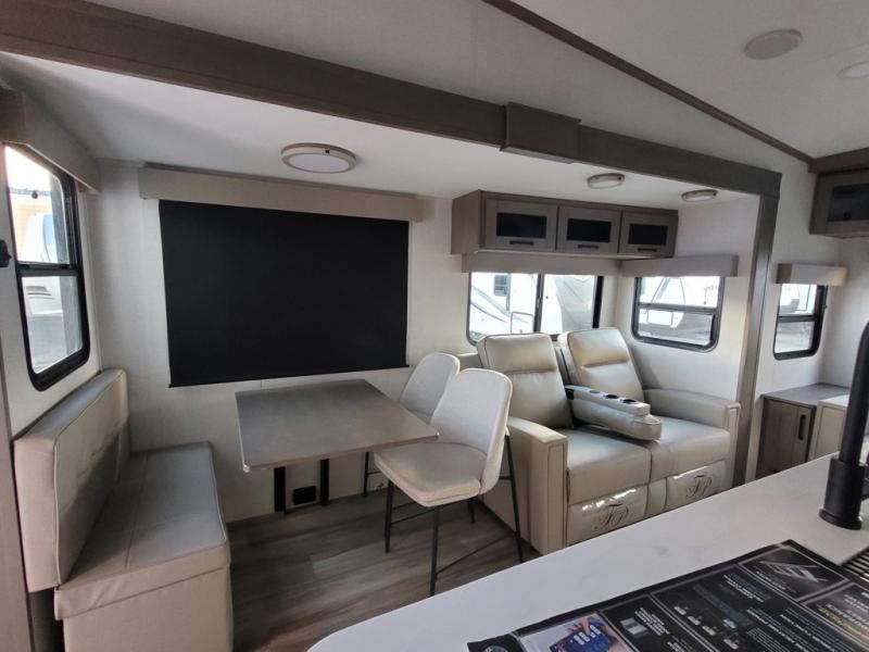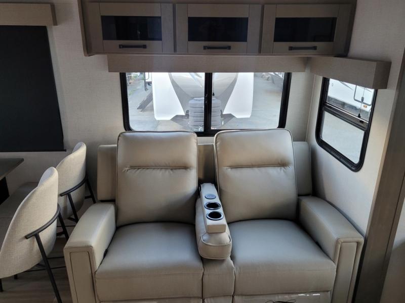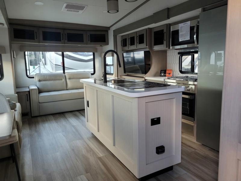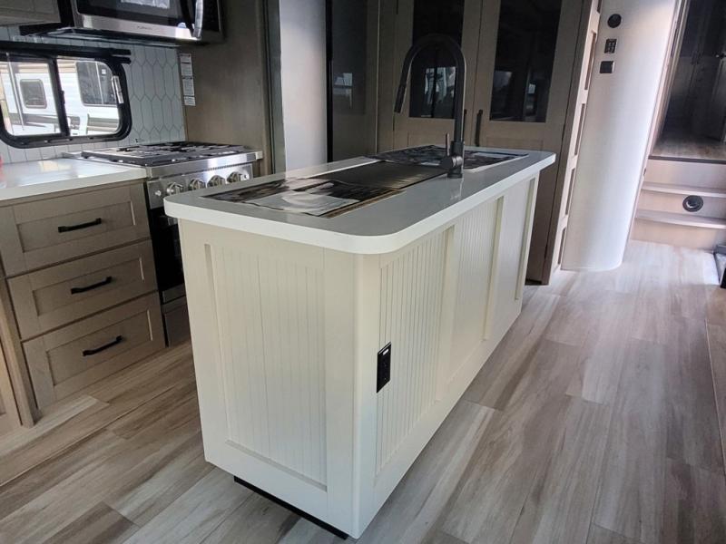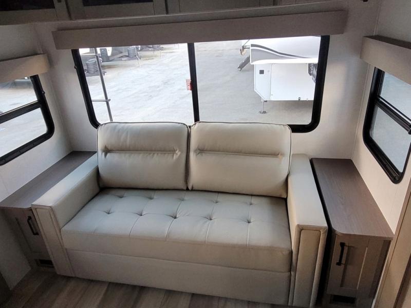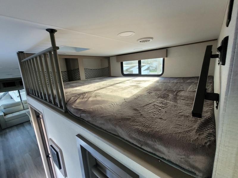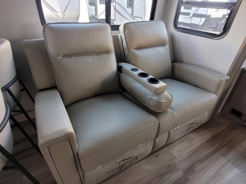 Travel to see new state parks, RV resorts or your family in other states as you tow this fifth wheel to each destination! You will enjoy comfort and convenience, plus a place to work, and be able to offer extra sleeping space for friends and family when they visit. The middle extra room provides a tri-fold sofa slide, a desk, a wardrobe, plus a 64" x 88" upper bed loft area with access from the hallway. The full bathroom will keep everyone refreshed, and the front bedroom allows you to sleep on a queen bed slide or choose the king option. And you will love the front wardrobe, the dresser, and the option to add a washer/dryer. The main living and kitchen area provides plenty of seating from the rear tri-fold sofa, the booth dinette or swivel dinette option, and the theater seats with cupholders. And the kitchen island, appliances, and large pantry allow you to take everything you need with you.