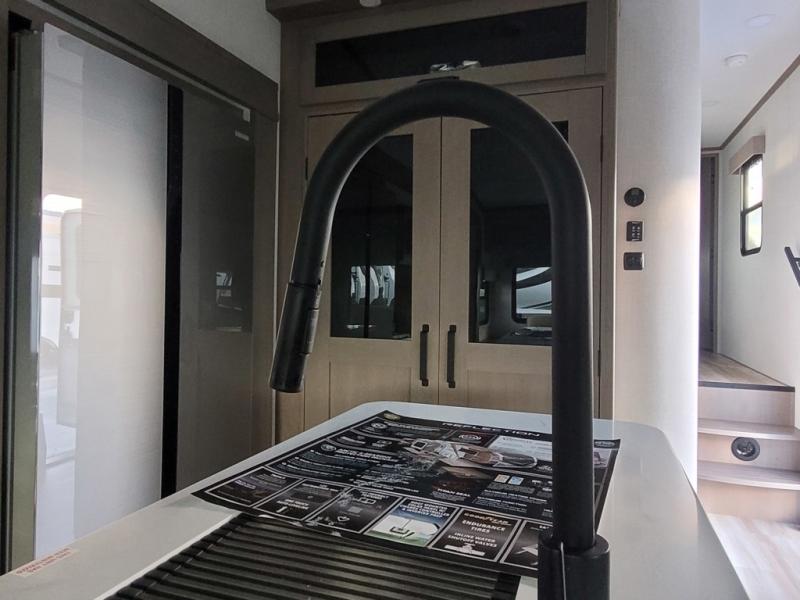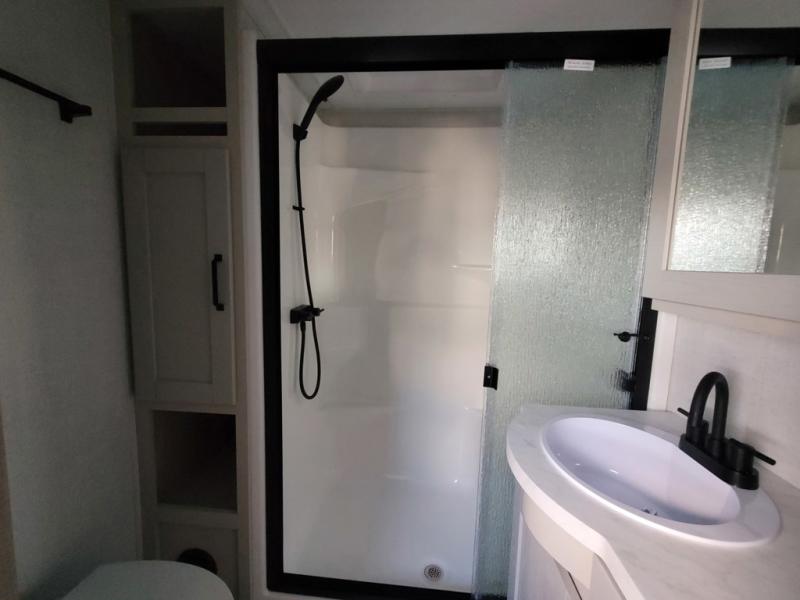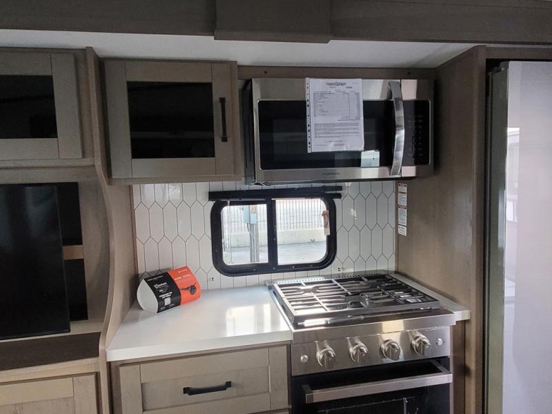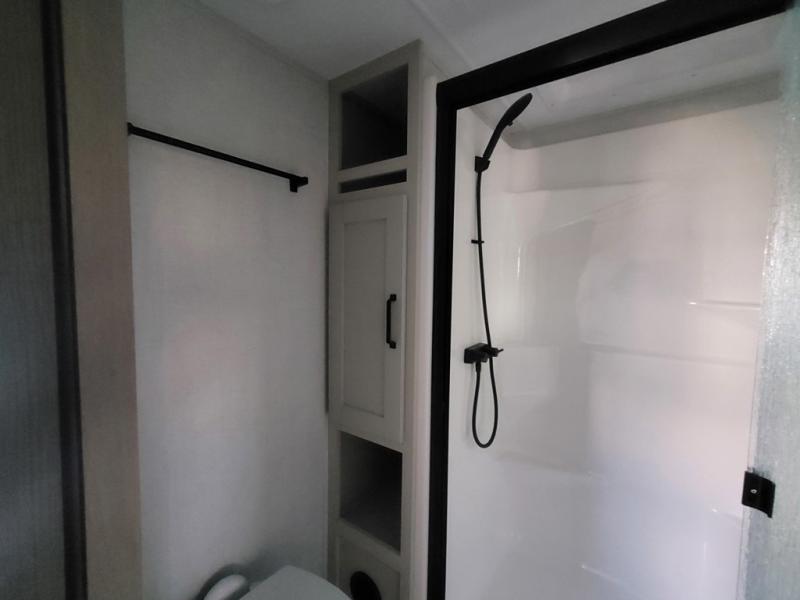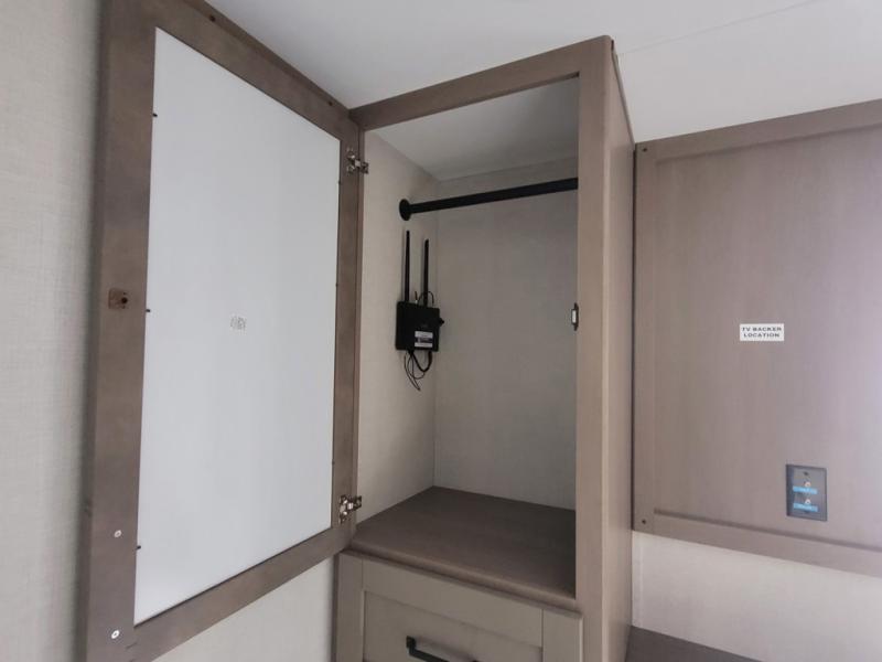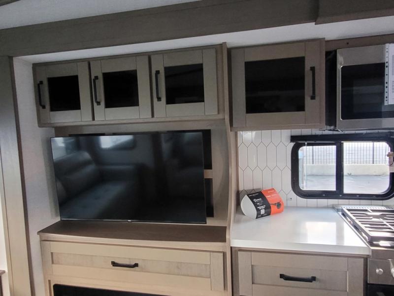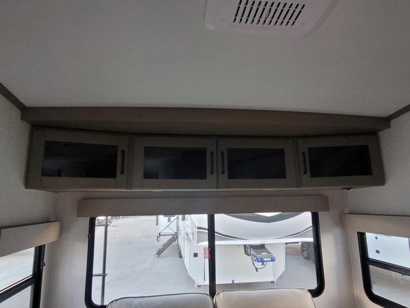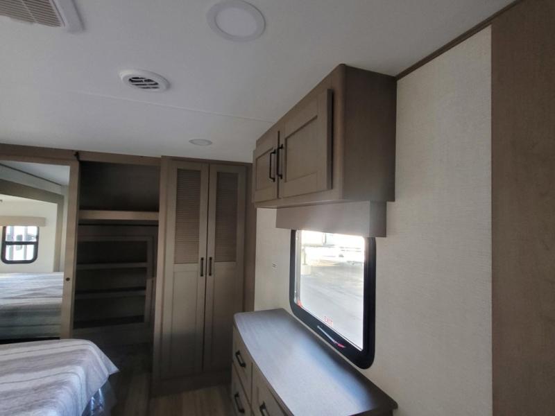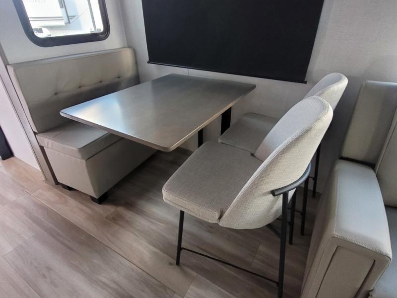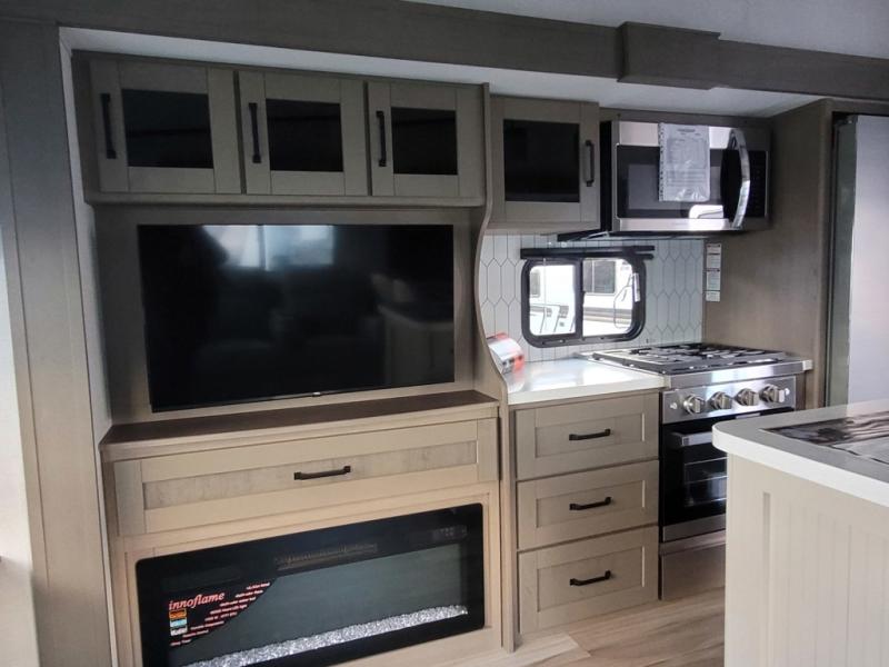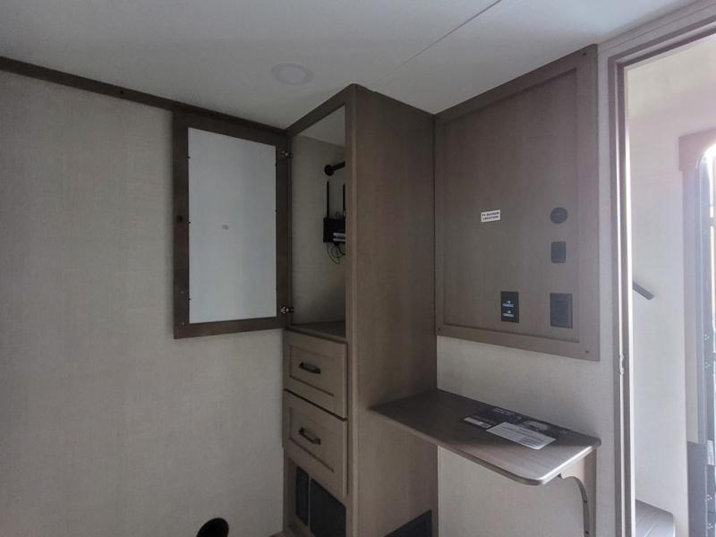 Travel to see new state parks, RV resorts or your family in other states as you tow this fifth wheel to each destination! You will enjoy comfort and convenience, plus a place to work, and be able to offer extra sleeping space for friends and family when they visit. The middle extra room provides a tri-fold sofa slide, a desk, a wardrobe, plus a 64" x 88" upper bed loft area with access from the hallway. The full bathroom will keep everyone refreshed, and the front bedroom allows you to sleep on a queen bed slide or choose the king option. And you will love the front wardrobe, the dresser, and the option to add a washer/dryer. The main living and kitchen area provides plenty of seating from the rear tri-fold sofa, the booth dinette or swivel dinette option, and the theater seats with cupholders. And the kitchen island, appliances, and large pantry allow you to take everything you need with you.