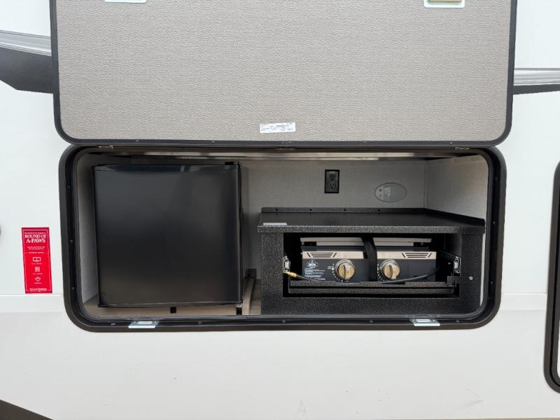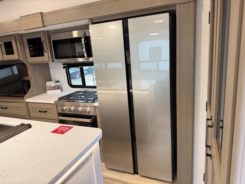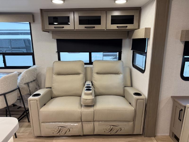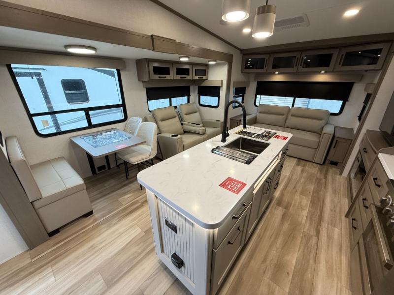 Travel to see new state parks, RV resorts or your family in other states as you tow this fifth wheel to each destination! You will enjoy comfort and convenience, plus a place to work, and be able to offer extra sleeping space for friends and family when they visit. The middle extra room provides a tri-fold sofa slide, a desk, a wardrobe, plus a 64" x 88" upper bed loft area with access from the hallway. The full bathroom will keep everyone refreshed, and the front bedroom allows you to sleep on a queen bed slide or choose the king option. And you will love the front wardrobe, the dresser, and the option to add a washer/dryer. The main living and kitchen area provides plenty of seating from the rear tri-fold sofa, the booth dinette or swivel dinette option, and the theater seats with cupholders. And the kitchen island, appliances, and large pantry allow you to take everything you need with you.