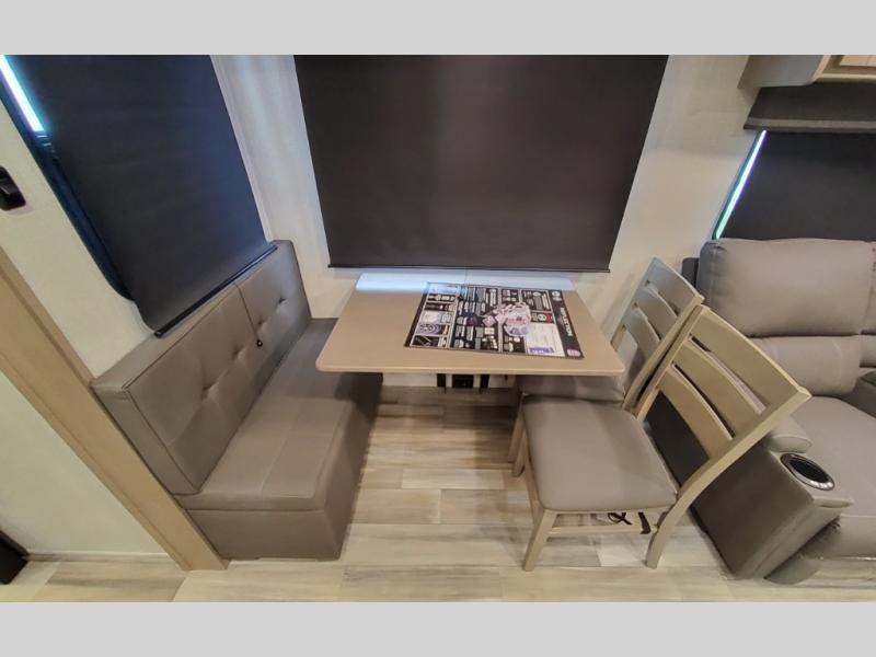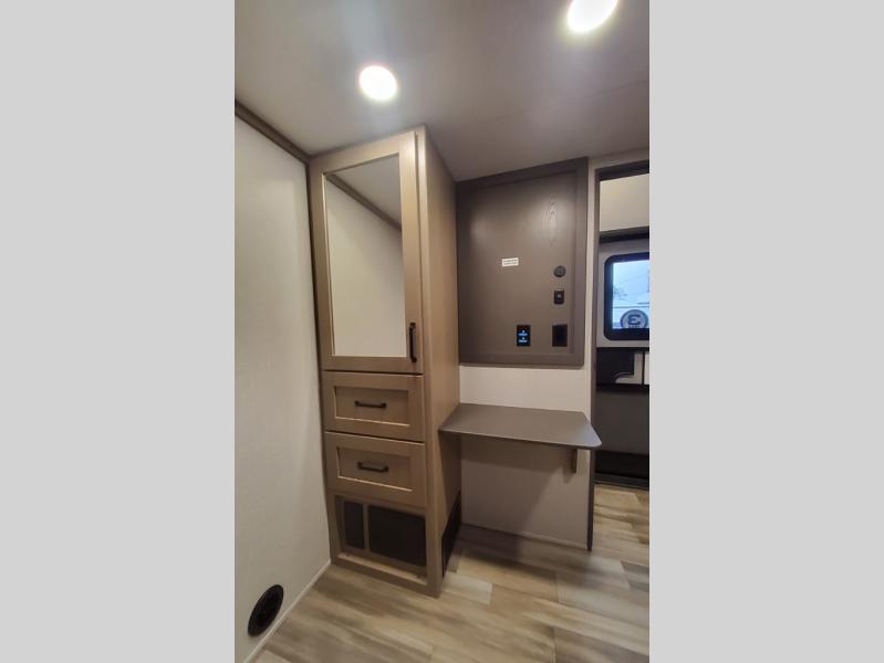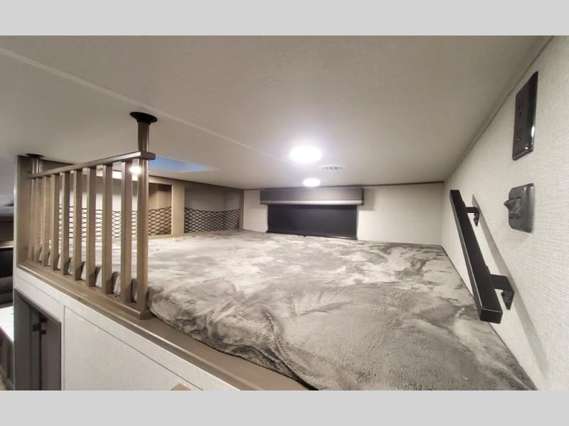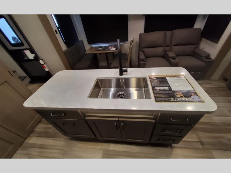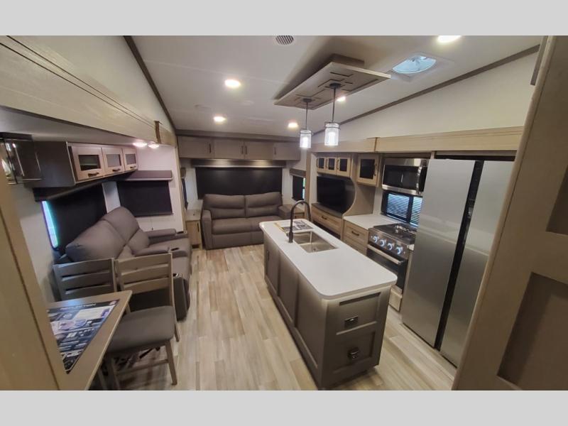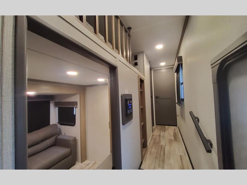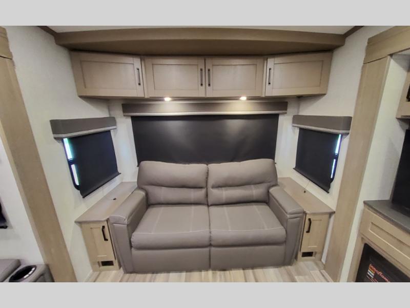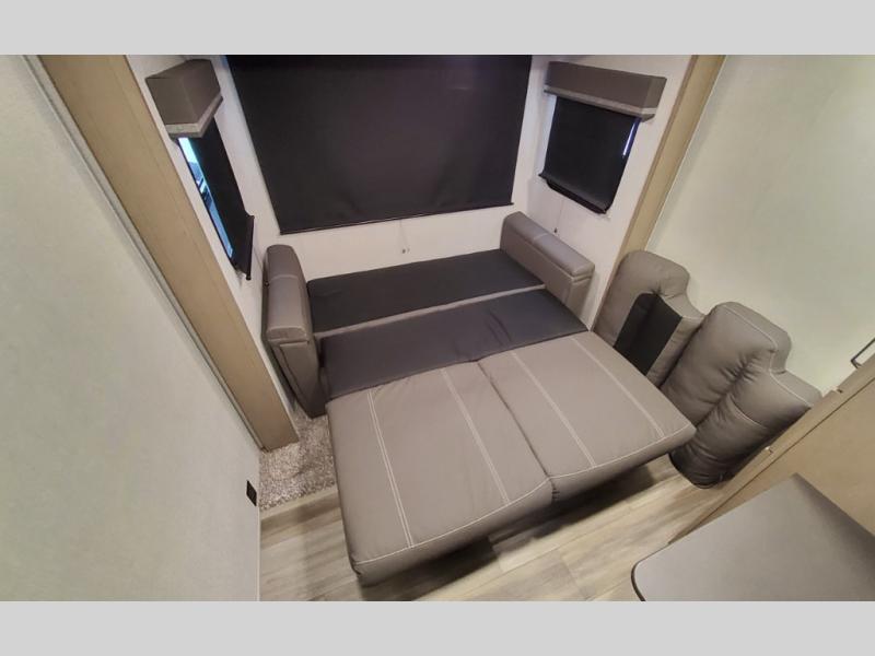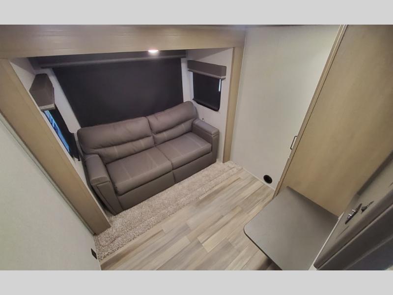 Travel to see new state parks, RV resorts or your family in other states as you tow this fifth wheel to each destination! You will enjoy comfort and convenience, plus a place to work, and be able to offer extra sleeping space for friends and family when they visit. The middle extra room provides a tri-fold sofa slide, a desk, a wardrobe, plus a 64" x 88" upper bed loft area with access from the hallway. The full bathroom will keep everyone refreshed, and the front bedroom allows you to sleep on a queen bed slide or choose the king option. And you will love the front wardrobe, the dresser, and the option to add a washer/dryer. The main living and kitchen area provides plenty of seating from the rear tri-fold sofa, the booth dinette or swivel dinette option, and the theater seats with cupholders. And the kitchen island, appliances, and large pantry allow you to take everything you need with you.