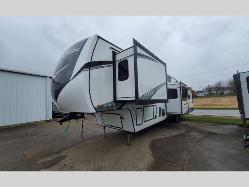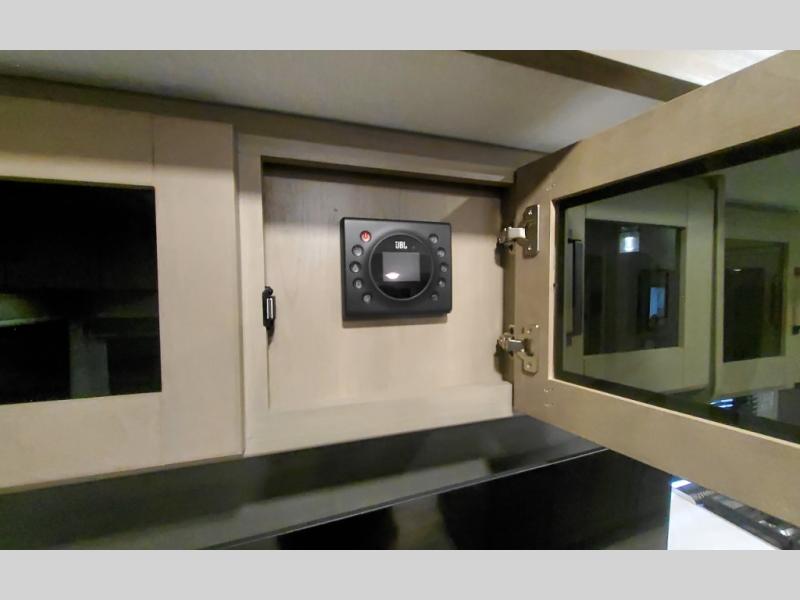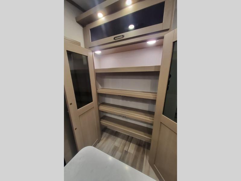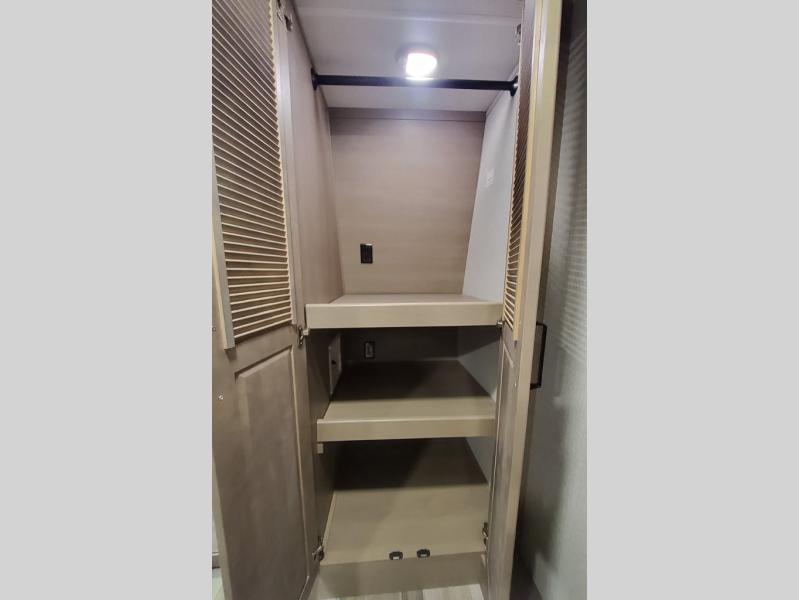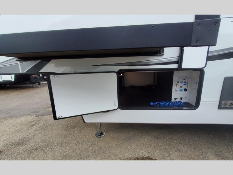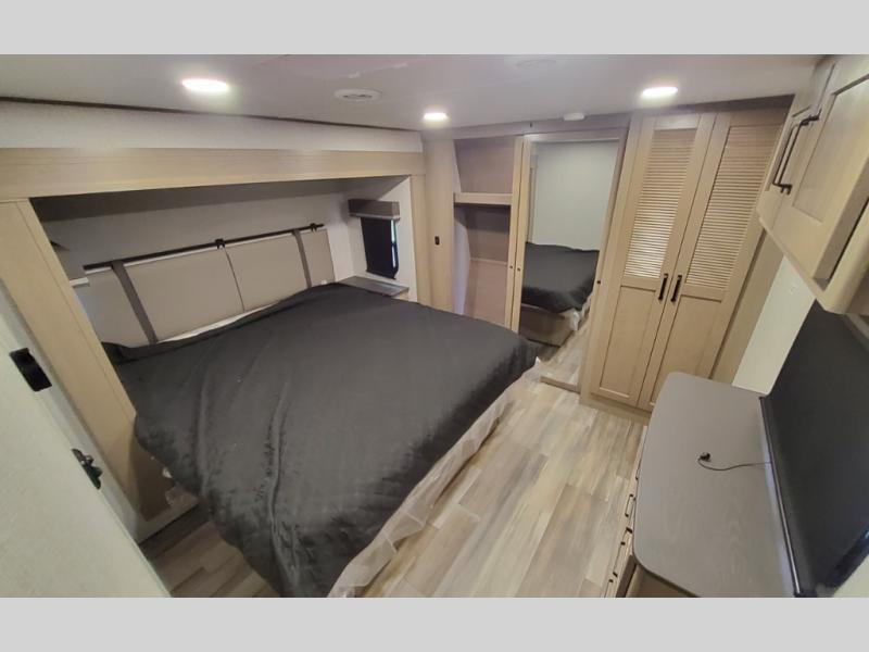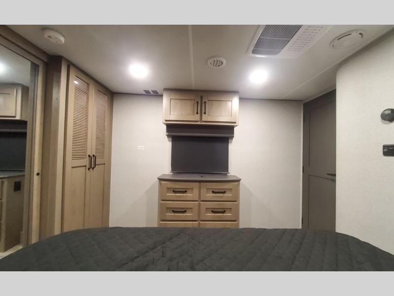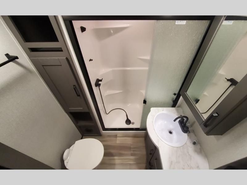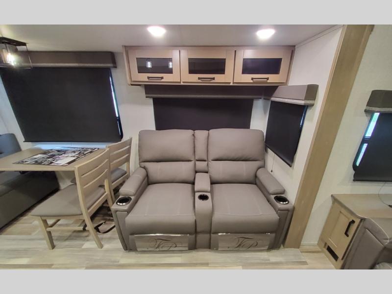 Travel to see new state parks, RV resorts or your family in other states as you tow this fifth wheel to each destination! You will enjoy comfort and convenience, plus a place to work, and be able to offer extra sleeping space for friends and family when they visit. The middle extra room provides a tri-fold sofa slide, a desk, a wardrobe, plus a 64" x 88" upper bed loft area with access from the hallway. The full bathroom will keep everyone refreshed, and the front bedroom allows you to sleep on a queen bed slide or choose the king option. And you will love the front wardrobe, the dresser, and the option to add a washer/dryer. The main living and kitchen area provides plenty of seating from the rear tri-fold sofa, the booth dinette or swivel dinette option, and the theater seats with cupholders. And the kitchen island, appliances, and large pantry allow you to take everything you need with you.