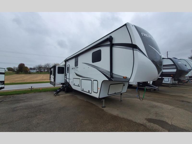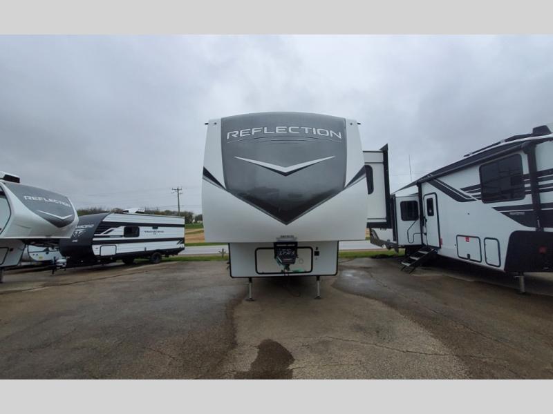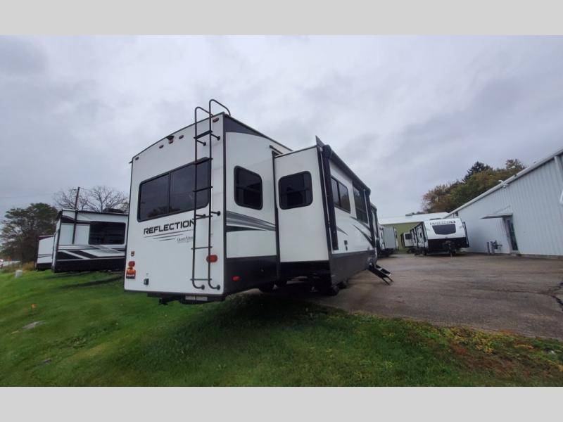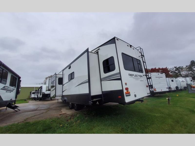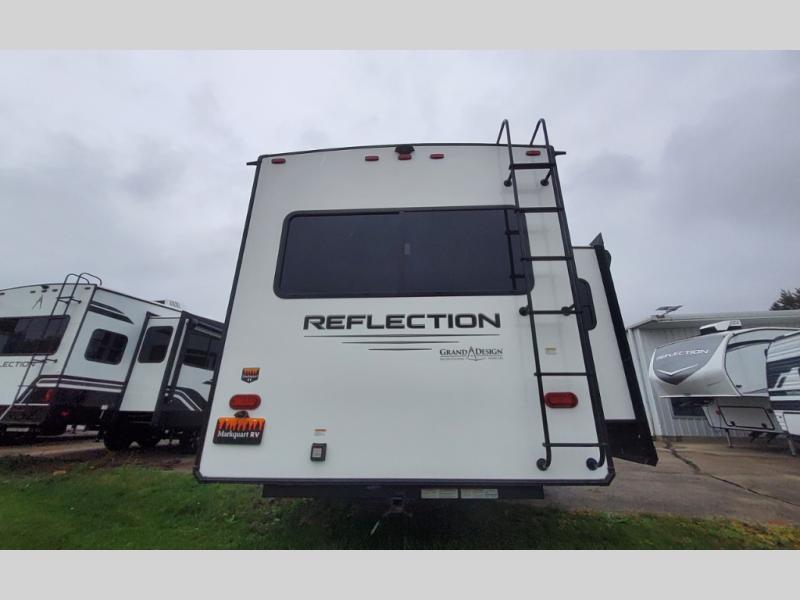 With any Reflection fifth wheel by Grand Design, you will have a solar panel for off-grid camping and a 60 amp charge controller and inverter prep, a Universal All-In-One docking station, unobstructed pass-through storage, and Goodyear Endurance tires. Each is constructed of gel coat exterior sidewalls, residential 5" truss rafters, walk-on roof decking, a fiberglass and radiant foil roof and front cap insulation plus laminated aluminum framed side walls, roof and end walls in slide rooms. Head inside to enjoy residential hardwood cabinet doors, premium Congoleum flooring, a spacious shower with a glass door, and many more comforts!