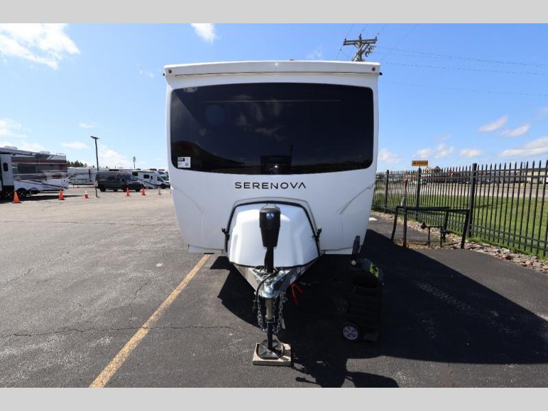 With any Serenova travel trailer by Grand Design, you will enjoy a smooth tow and at-home comforts wherever you decide to roam. There is a MORryde independent suspension plus MORryde shock, Goodyear Endurance tires, and Dexter tow assist with an anti-lock braking system and sway control for optimal handling. To help extend your camping season, there is an enclosed underbelly, a dedicated heat source with Thermafoil, heated dump valves plus thermostatically controlled 12V heating pads. Inside, you'll love the look of the imported Italian cabinetry, and there is a Klipsch whole home Bluetooth speaker so you can listen to your favorite tunes at the campground!