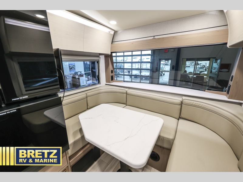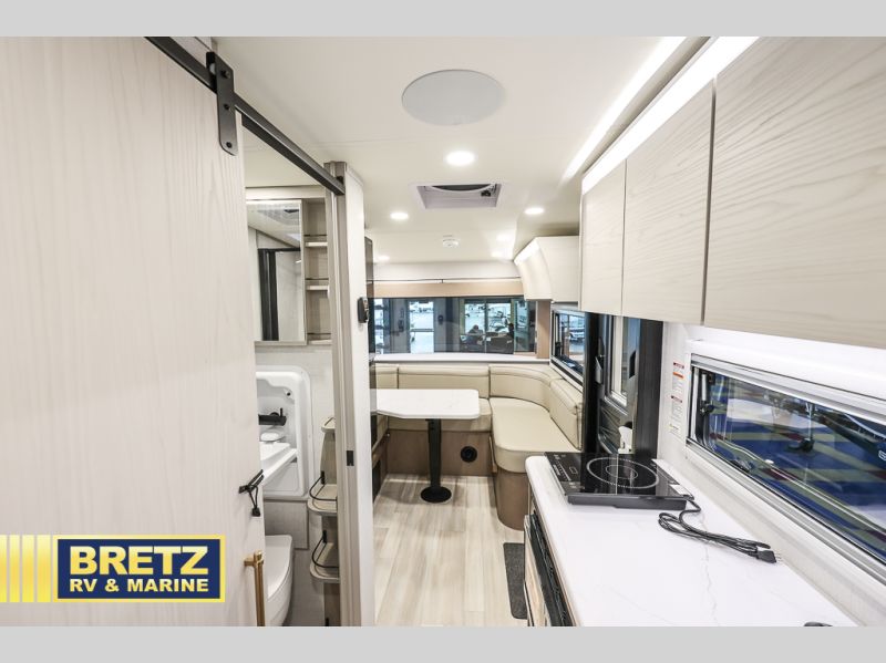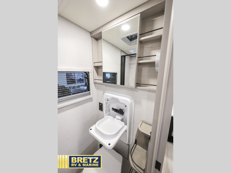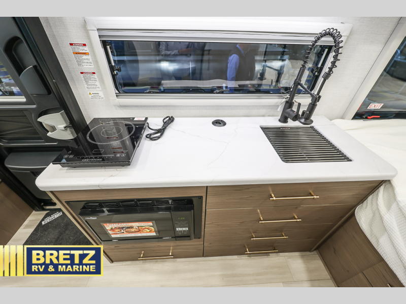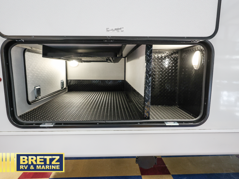 Trips to the lake are made complete in this cozy travel trailer for four. Once you arrive at the campground, you can unload the exterior storage, then start lunch on the induction cooktop and convection microwave. There is a front U-shaped sleeper dinette that will provide dining space and additional sleeping space for guests. This unit includes a private full bath with a shower, toilet, and flip-up bath sink plus some convenient storage for your necessities. You're sure to enjoy sleeping on the rear queen bed that includes wraparound overhead storage for your things!