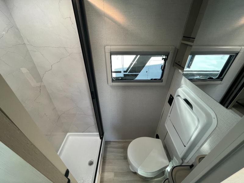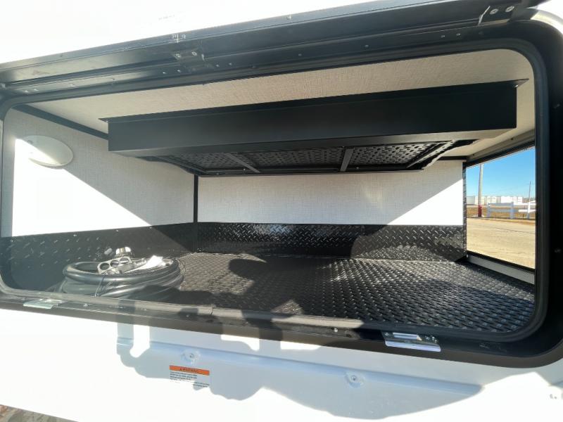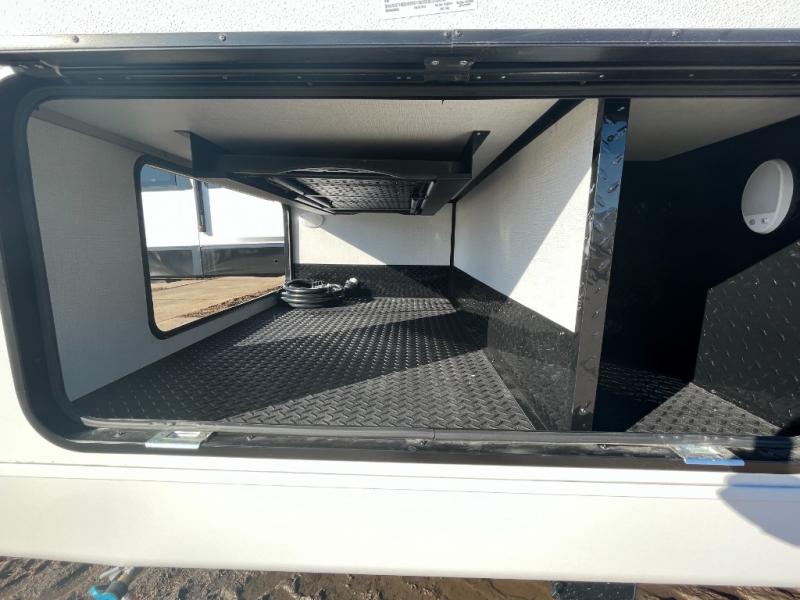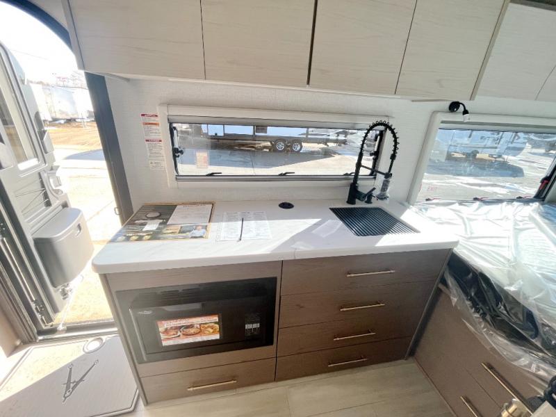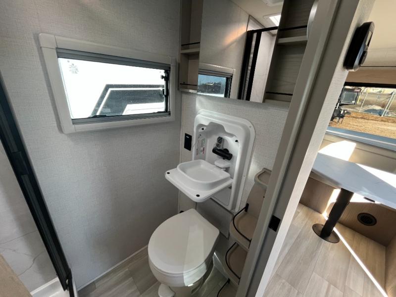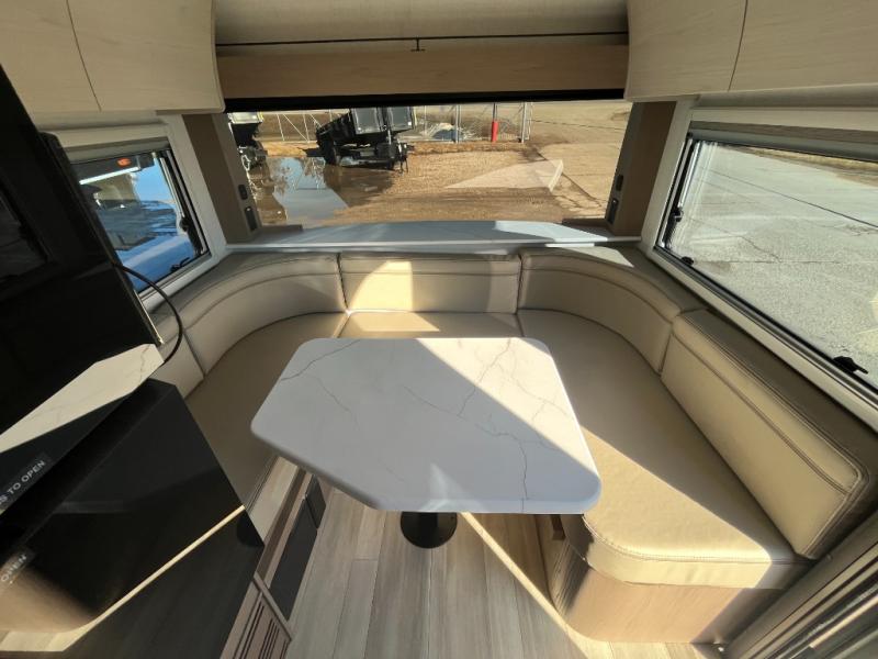 Trips to the lake are made complete in this cozy travel trailer for four. Once you arrive at the campground, you can unload the exterior storage, then start lunch on the induction cooktop and convection microwave. There is a front U-shaped sleeper dinette that will provide dining space and additional sleeping space for guests. This unit includes a private full bath with a shower, toilet, and flip-up bath sink plus some convenient storage for your necessities. You're sure to enjoy sleeping on the rear queen bed that includes wraparound overhead storage for your things!