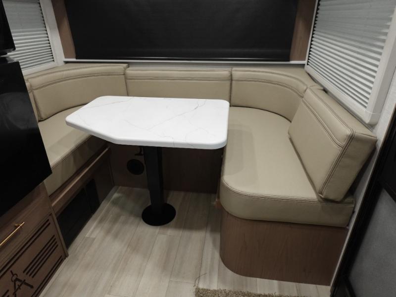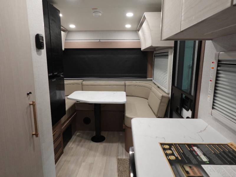 Trips to the lake are made complete in this cozy travel trailer for four. Once you arrive at the campground, you can unload the exterior storage, then start lunch on the induction cooktop and convection microwave. There is a front U-shaped sleeper dinette that will provide dining space and additional sleeping space for guests. This unit includes a private full bath with a shower, toilet, and flip-up bath sink plus some convenient storage for your necessities. You're sure to enjoy sleeping on the rear queen bed that includes wraparound overhead storage for your things!