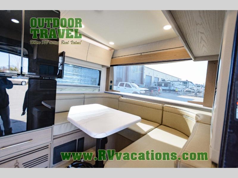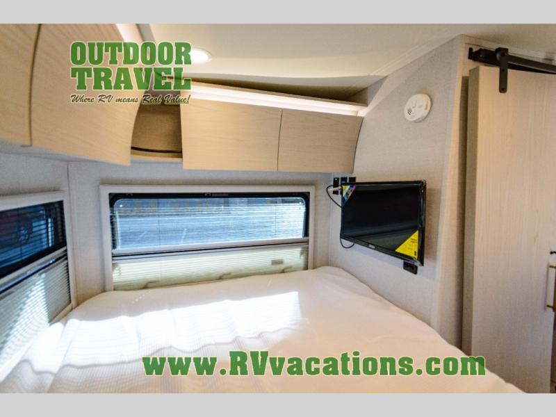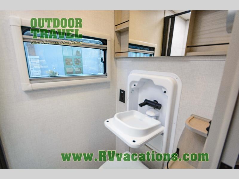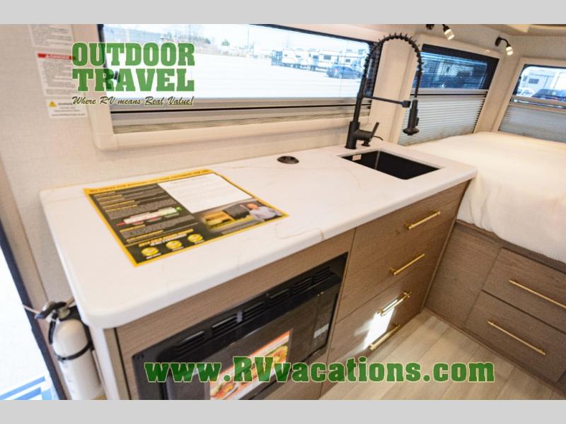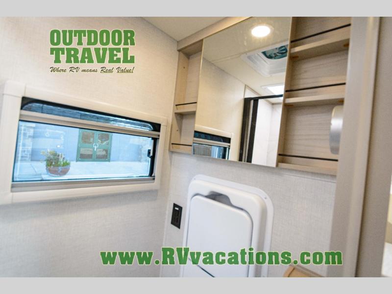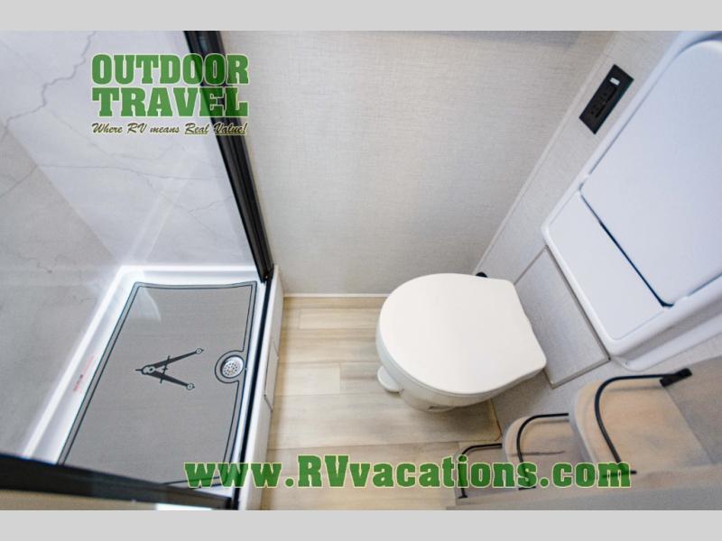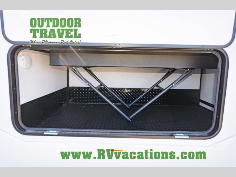 Trips to the lake are made complete in this cozy travel trailer for four. Once you arrive at the campground, you can unload the exterior storage, then start lunch on the induction cooktop and convection microwave. There is a front U-shaped sleeper dinette that will provide dining space and additional sleeping space for guests. This unit includes a private full bath with a shower, toilet, and flip-up bath sink plus some convenient storage for your necessities. You're sure to enjoy sleeping on the rear queen bed that includes wraparound overhead storage for your things!