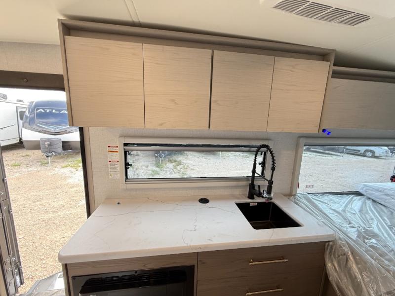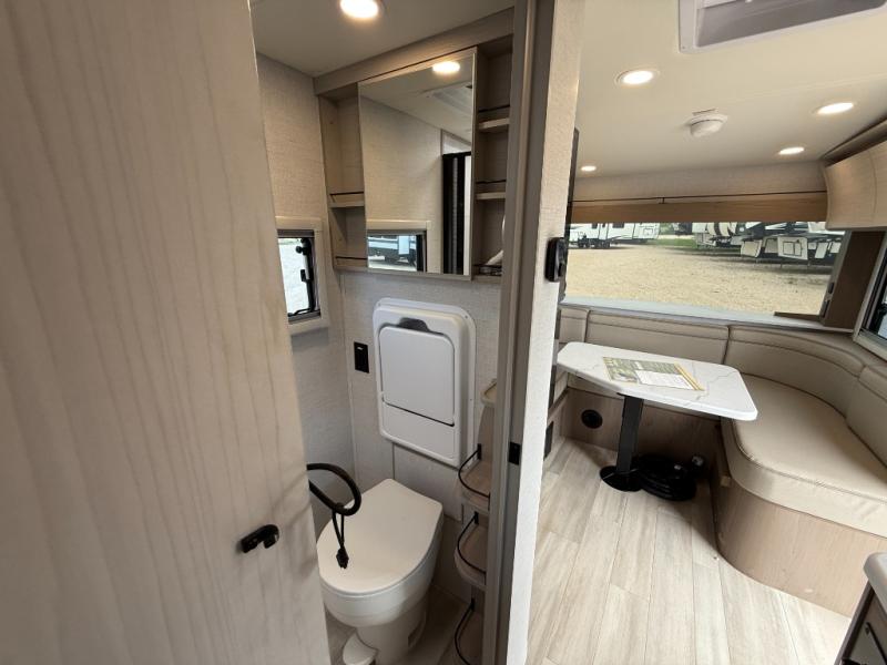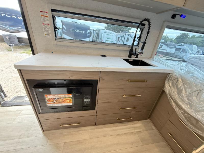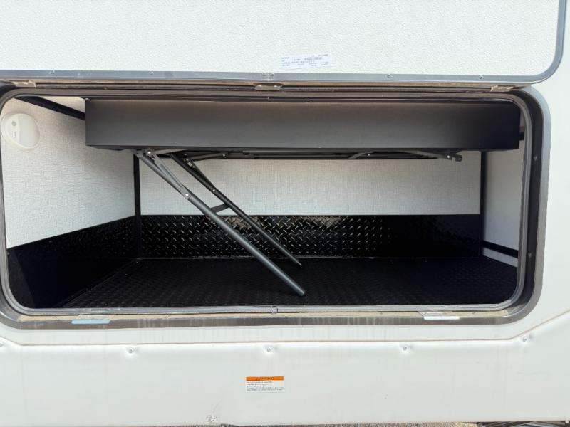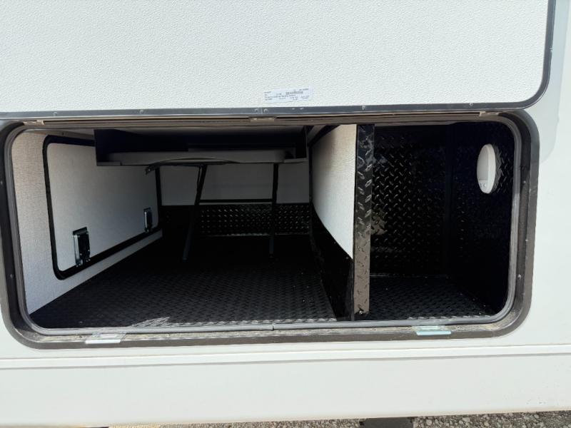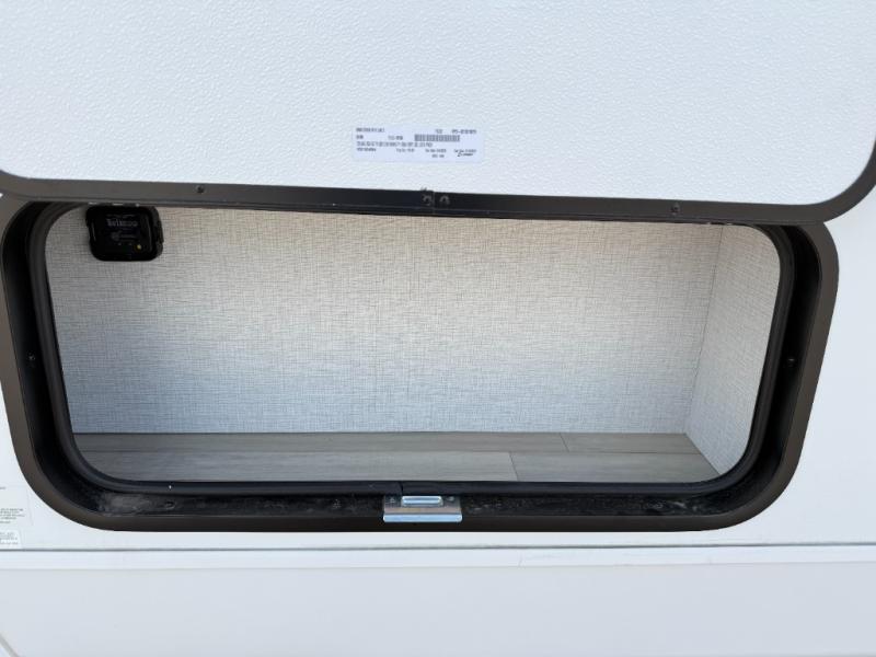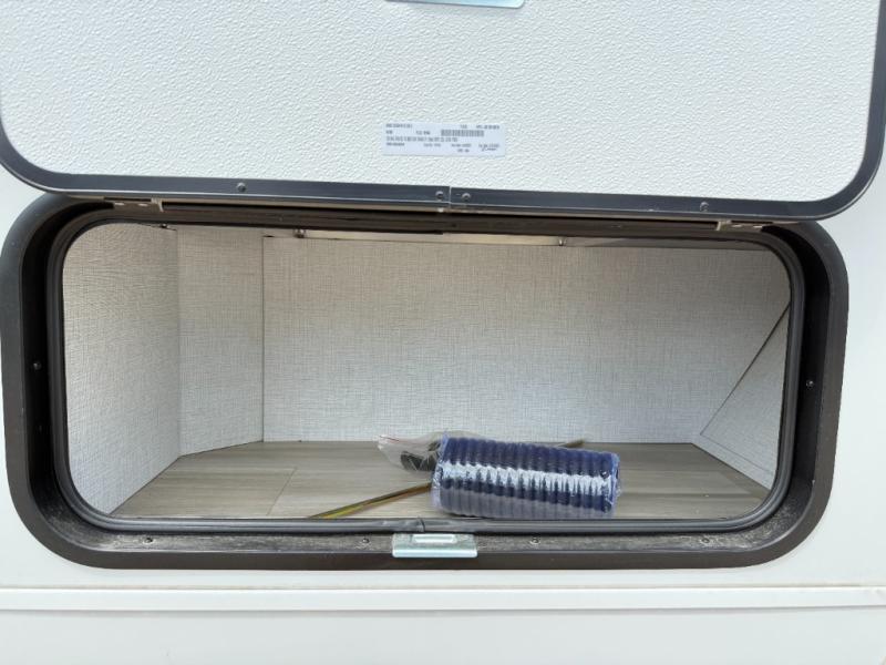 Trips to the lake are made complete in this cozy travel trailer for four. Once you arrive at the campground, you can unload the exterior storage, then start lunch on the induction cooktop and convection microwave. There is a front U-shaped sleeper dinette that will provide dining space and additional sleeping space for guests. This unit includes a private full bath with a shower, toilet, and flip-up bath sink plus some convenient storage for your necessities. You're sure to enjoy sleeping on the rear queen bed that includes wraparound overhead storage for your things!