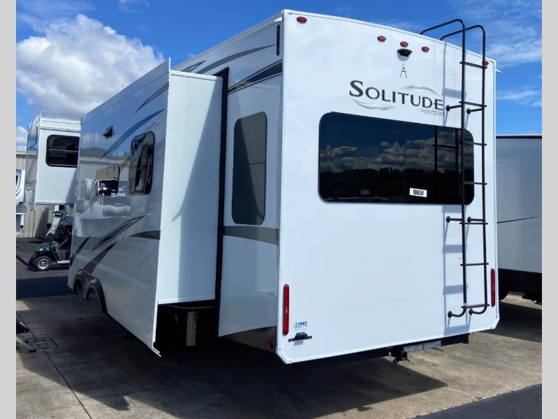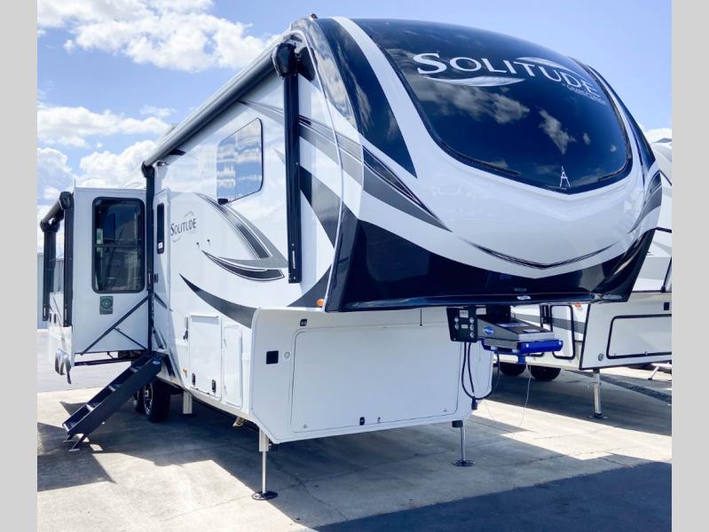 Each Solitude fifth wheel by Grand Design features a 101" wide-body construction, heavy duty 8,000 lb. axles, frameless tinted windows, and high-gloss gel coat sidewalls. You can camp year around thanks to the Weather-Tek Package that includes a 35K BTU high-capacity furnace, an all-in-one enclosed and heated utility center, and a fully enclosed underbelly with heated tanks and storage. Inside, you'll love the premium roller shades, hardwood cabinet doors, solid surface countertops, plus residential finishes throughout to make you truly feel at home. Each model also includes a MORryde CRE3000 suspension system, self adjusting brakes, and a MORryde pin box that will provide smooth towing from home to campground. Affordable luxury is possible with the Solitude fifth wheels; choose yours today!