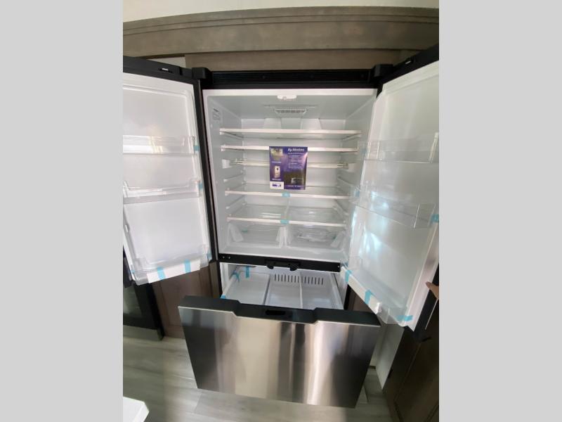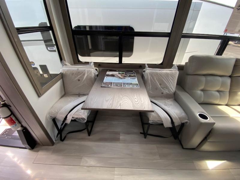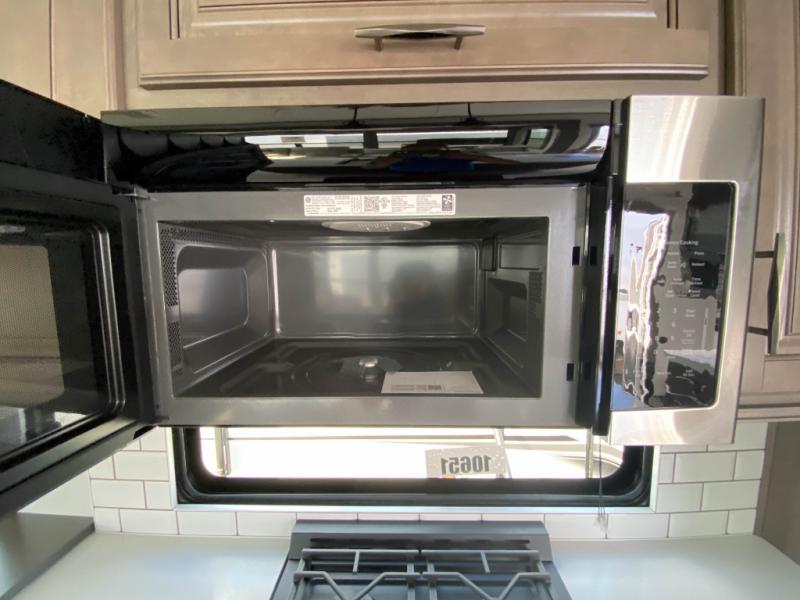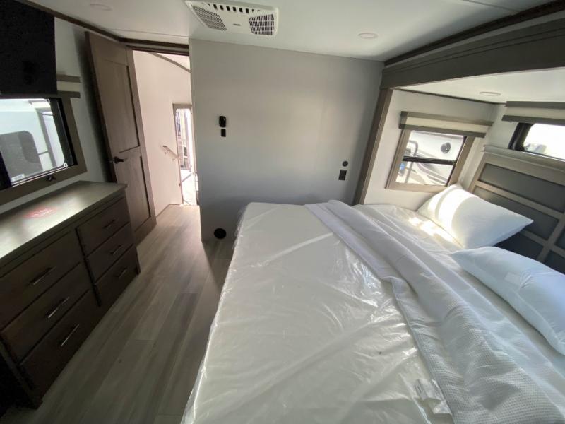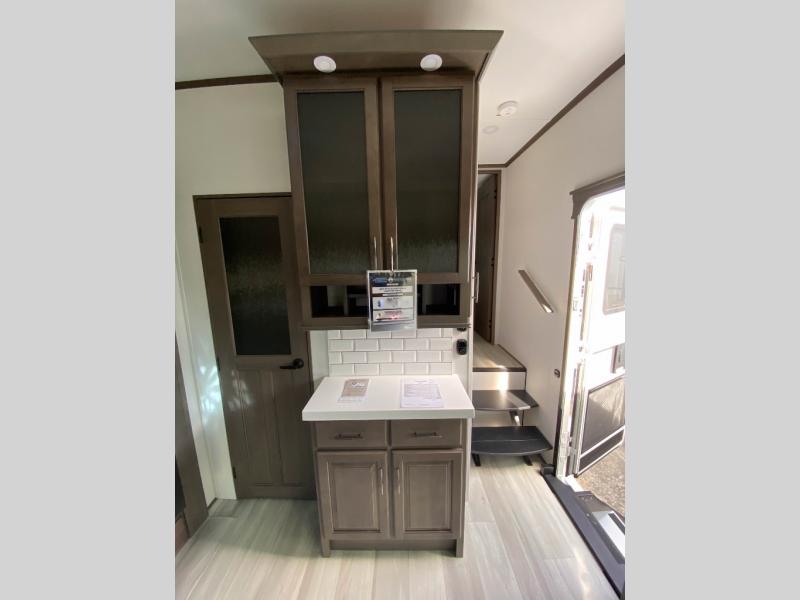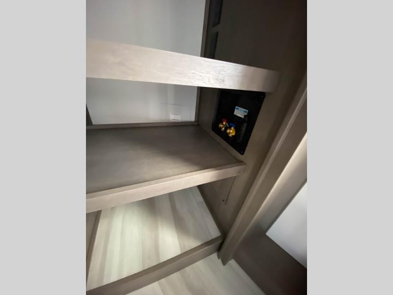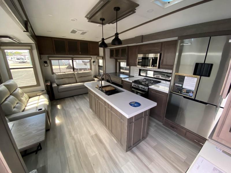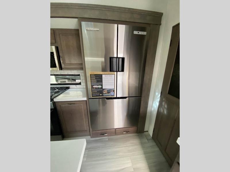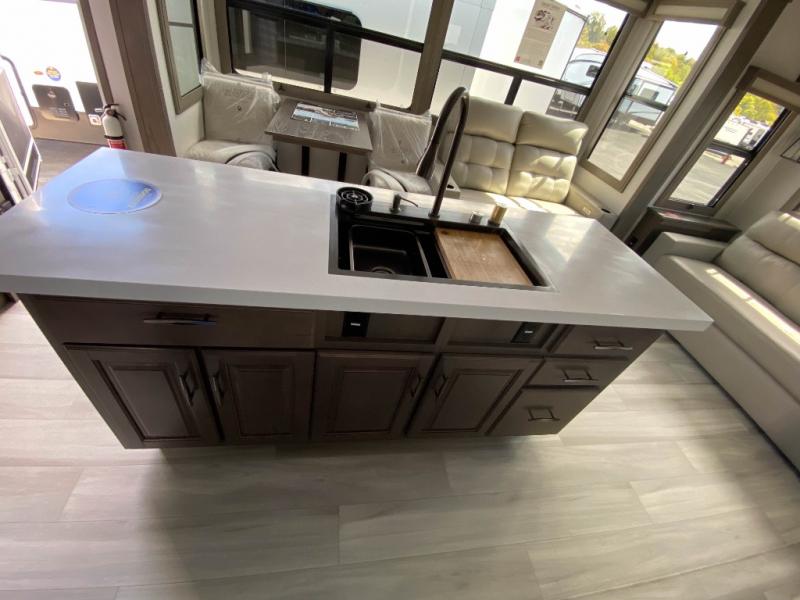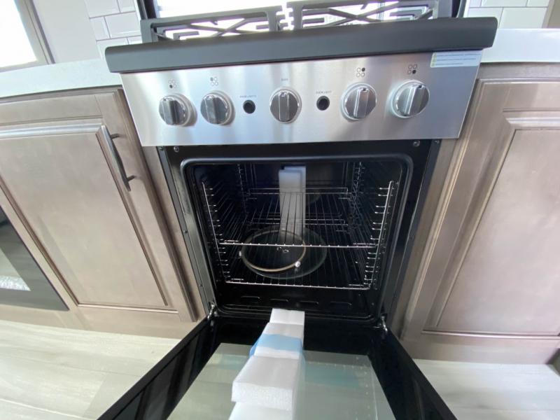 Traveling for long periods at a time is made easy with this gourmet kitchen that can feed your entire group a holiday meal! The professional-grade stainless steel cooktop with a built-in oven, microwave, 12V 20 cu. ft. refrigerator, and a kitchen island offers everything you will need to enjoy cooking for your family and guests. There is abundant storage throughout multiple overhead cabinets, a kitchen pantry and hutch, a bath linen cabinet for your towels, and in the front master bedroom which features a large closet. In the bedroom there is also a queen bed slide for added space to sleep comfortable at night, or you may choose an optional king bed if you enjoy more space. You will also find a closet with washer/dryer prep, large wardrobe, plus a slide top dresser. Two nice awnings will provide outdoor living space keeping you protected from the sun and rain, and you can add an optional pull-out kitchen to enjoy convenient cooking outdoors as well.