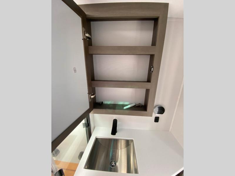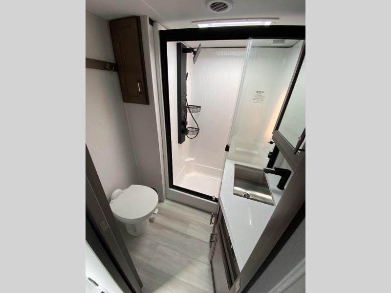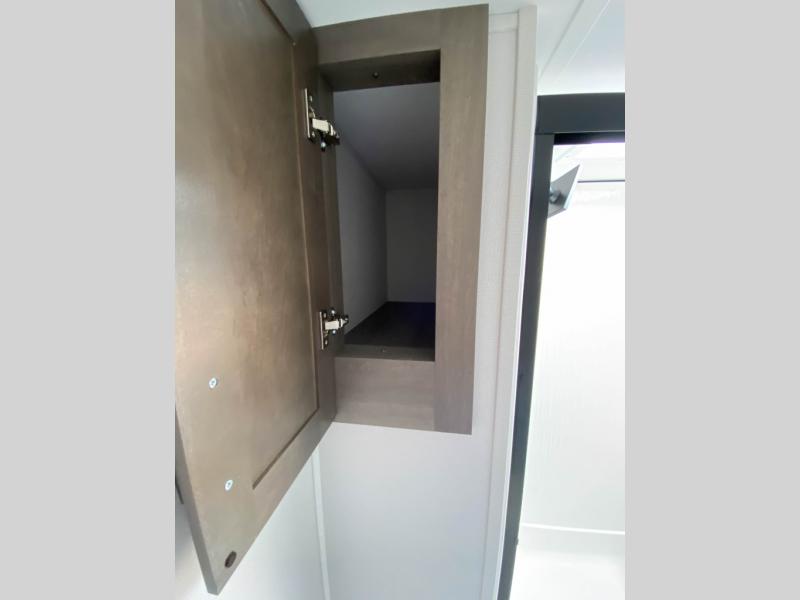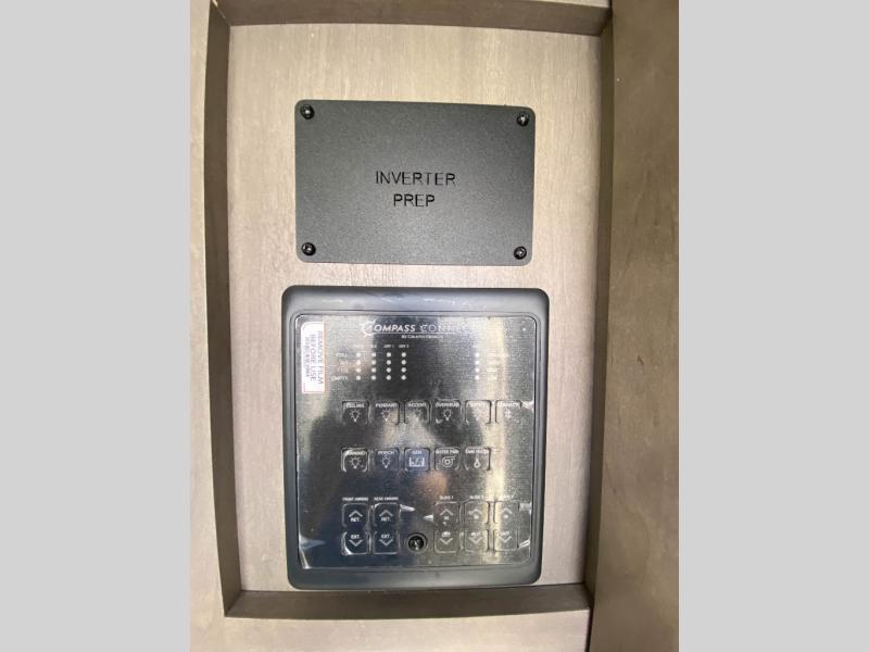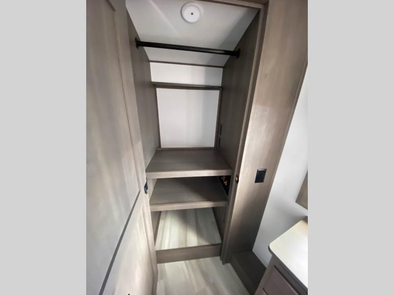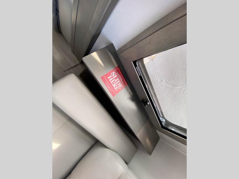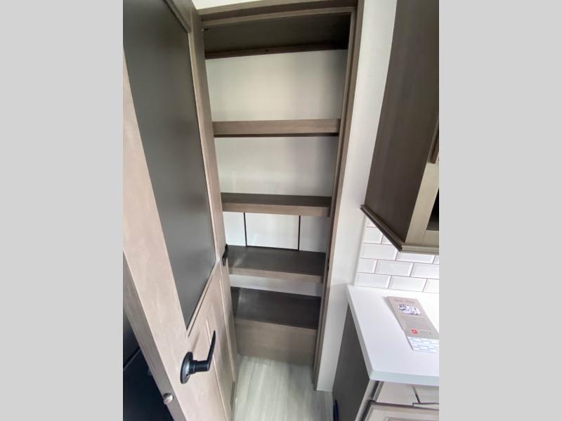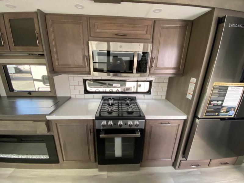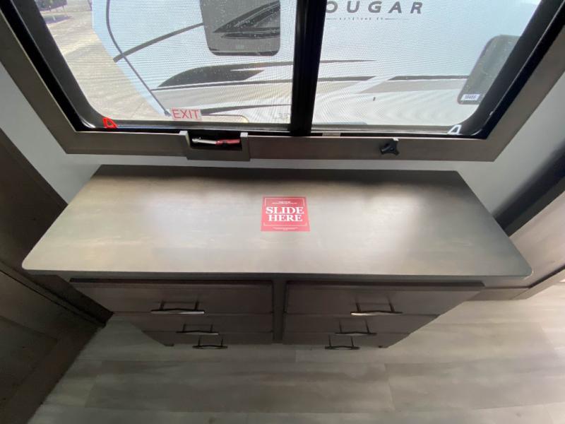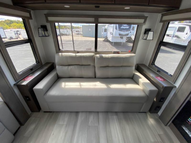 Traveling for long periods at a time is made easy with this gourmet kitchen that can feed your entire group a holiday meal! The professional-grade stainless steel cooktop with a built-in oven, microwave, 12V 20 cu. ft. refrigerator, and a kitchen island offers everything you will need to enjoy cooking for your family and guests. There is abundant storage throughout multiple overhead cabinets, a kitchen pantry and hutch, a bath linen cabinet for your towels, and in the front master bedroom which features a large closet. In the bedroom there is also a queen bed slide for added space to sleep comfortable at night, or you may choose an optional king bed if you enjoy more space. You will also find a closet with washer/dryer prep, large wardrobe, plus a slide top dresser. Two nice awnings will provide outdoor living space keeping you protected from the sun and rain, and you can add an optional pull-out kitchen to enjoy convenient cooking outdoors as well.