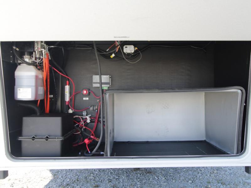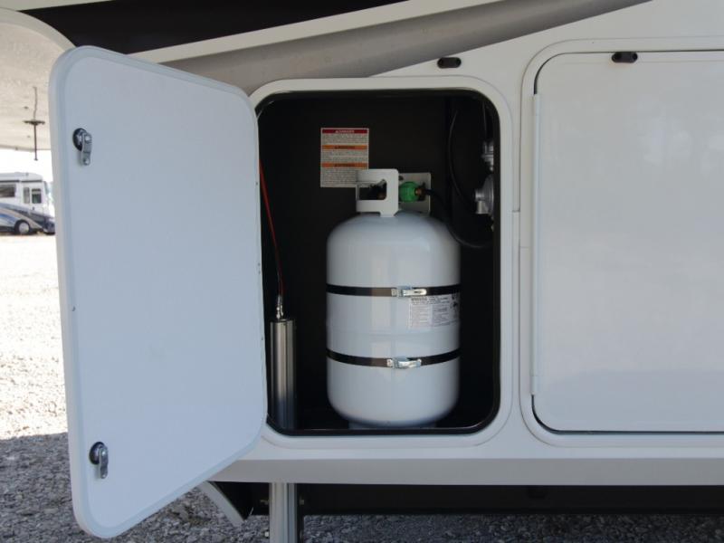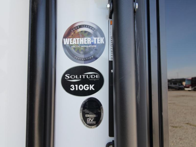 The Solitude 310GK is designed for year-round adventures with Weather-Tek insulation, a 35K BTU high-capacity furnace, enclosed and heated tanks, and a heated utility center. Its 101" wide-body construction, 8,000 lb. heavy-duty axles, and high-gloss gel coat sidewalls ensure durability and a smooth ride.