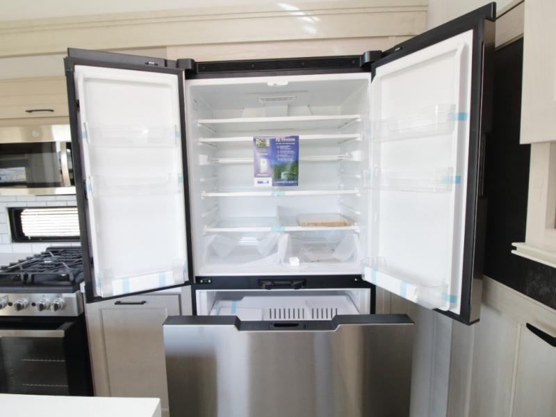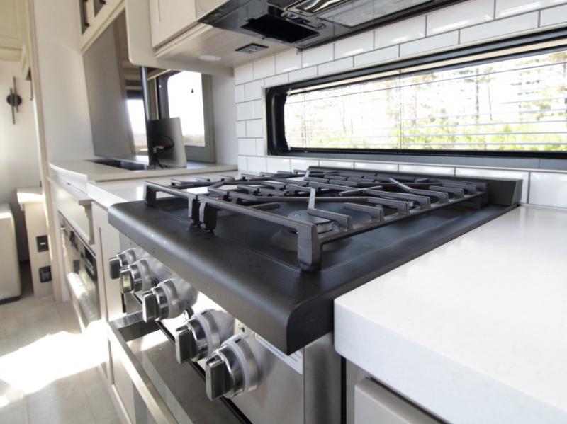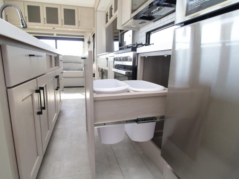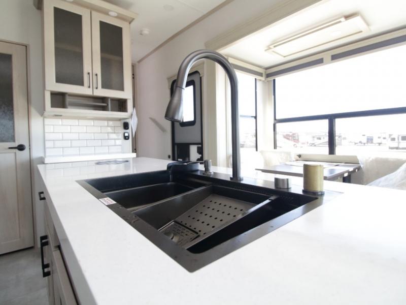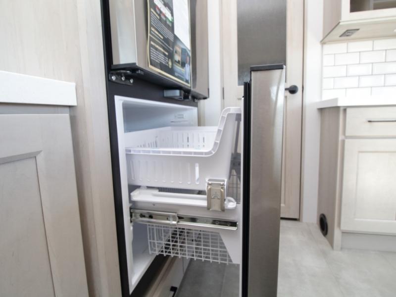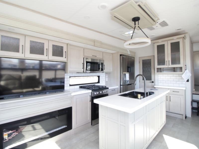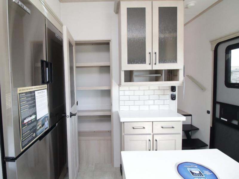 The Grand Design Solitude 310GK makes long-term RV living a breeze with a fully equipped gourmet kitchen perfect for home-cooked meals on the road. The professional-grade stainless steel cooktop, built-in oven, microwave, and a 12V 20 cu. ft. refrigerator provide everything needed for effortless cooking. A spacious kitchen island and oversized pantry ensure plenty of prep and storage space.