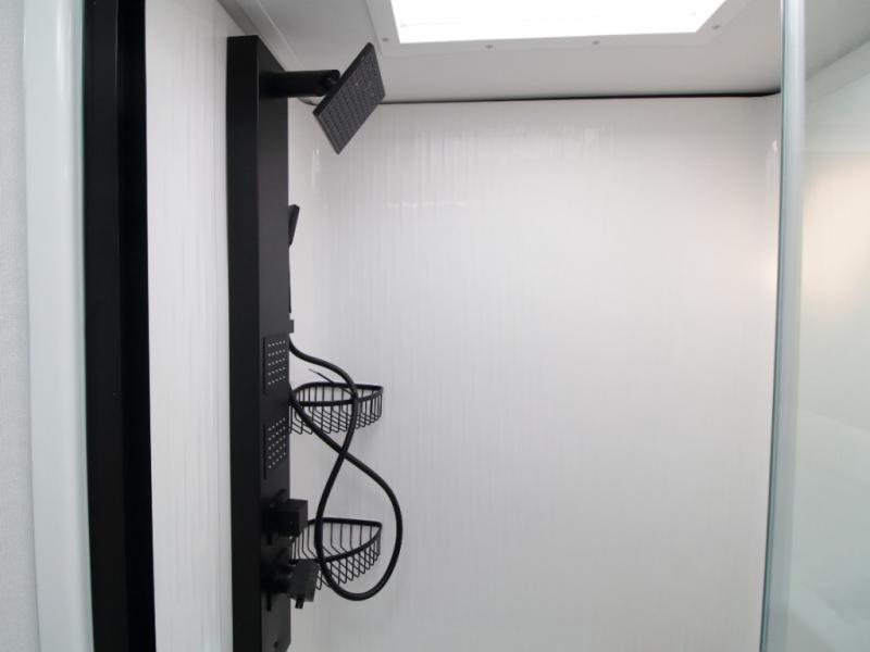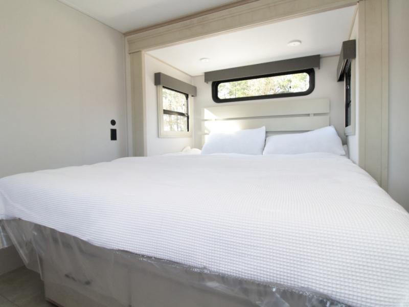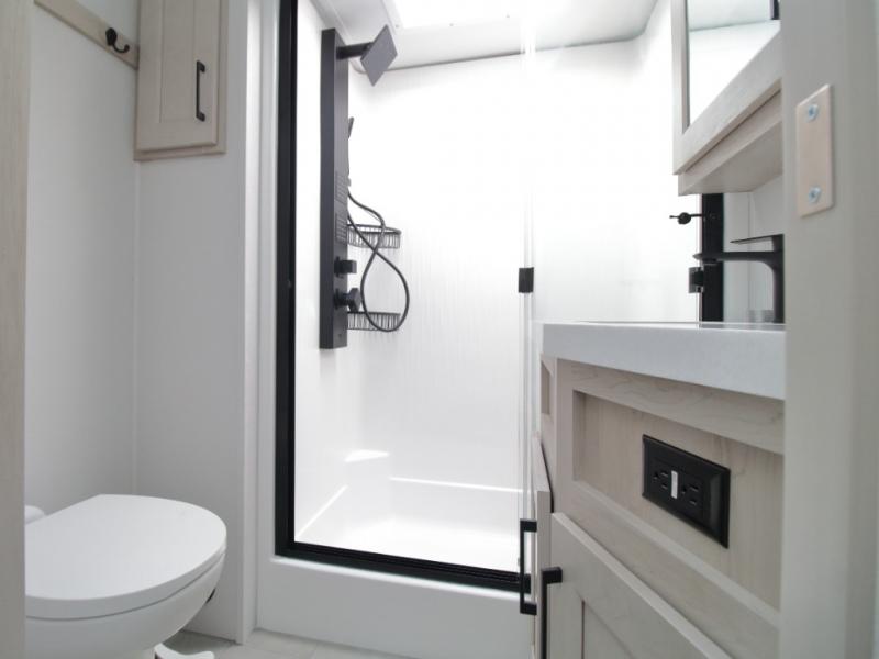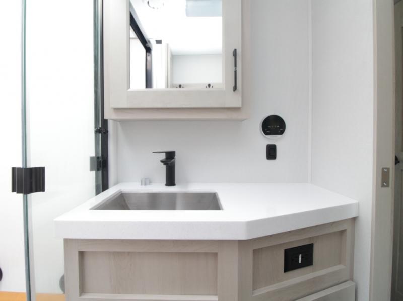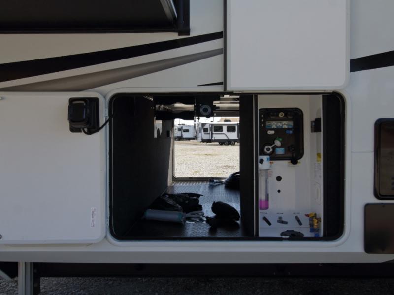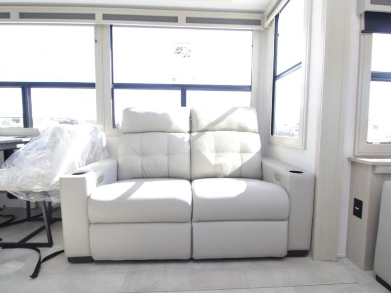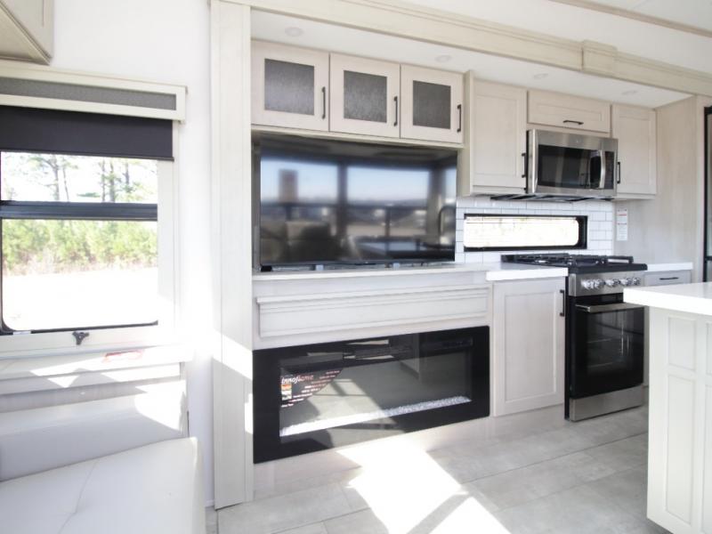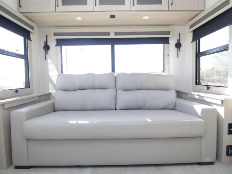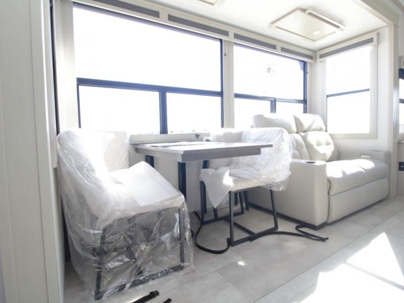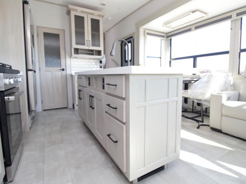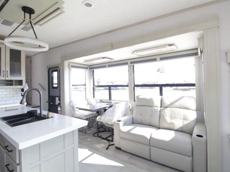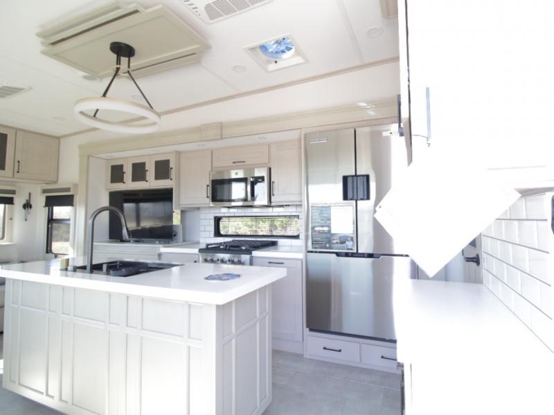 Inside, the luxury continues with solid surface countertops, hardwood cabinetry, premium roller shades, and high-end residential finishes. A MORryde CRE3000 suspension system, self-adjusting brakes, and a MORryde pin box enhance towing stability for a seamless travel experience.