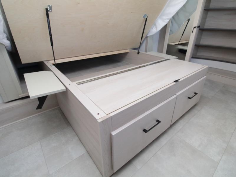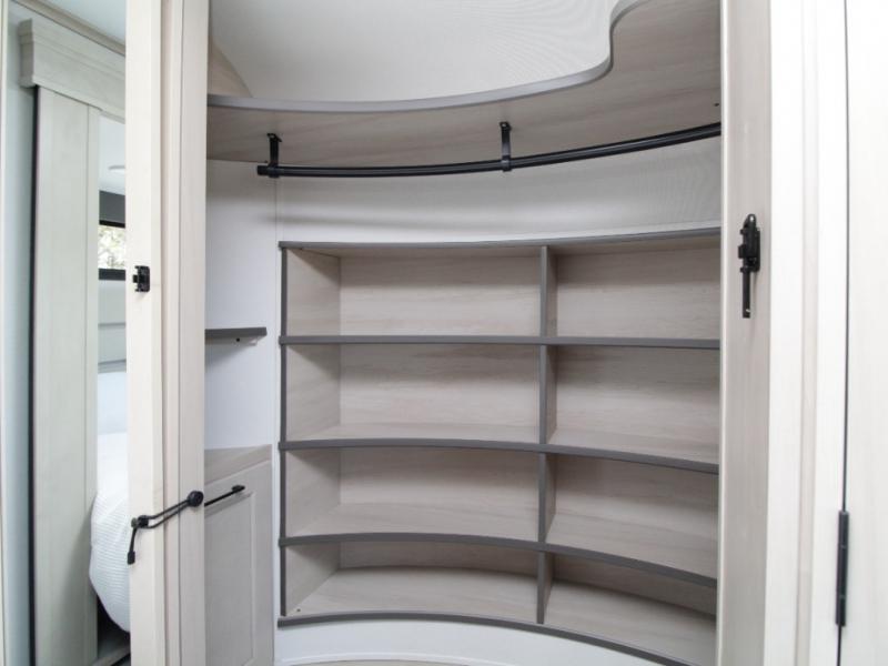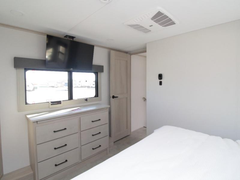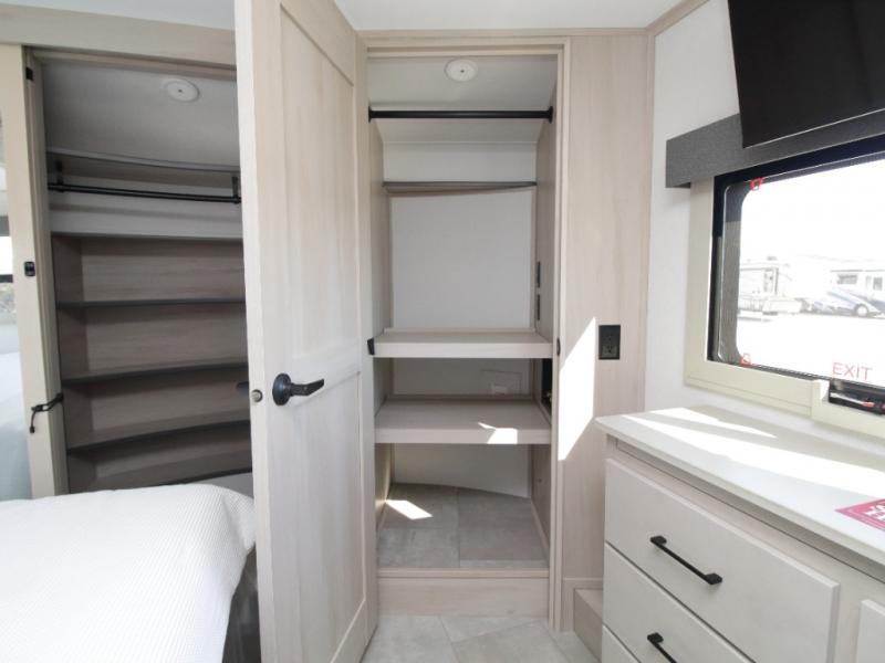 Storage is never an issue with multiple overhead cabinets, a pantry with hutch, and a linen cabinet in the bathroom. The front master bedroom offers a queen bed slide for added space, with the option to upgrade to a king bed. A large wardrobe, washer/dryer prep closet, and slide-top dresser add to the convenience.