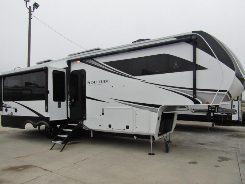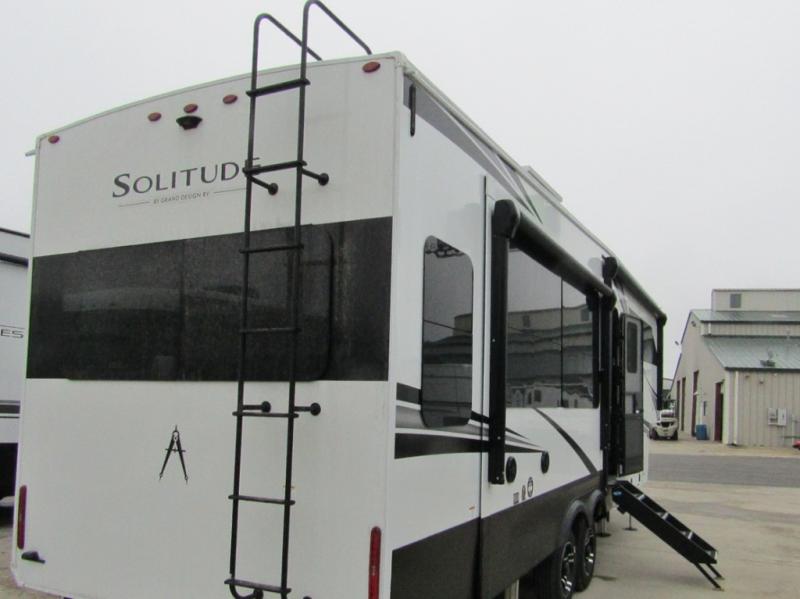 Each Solitude fifth wheel by Grand Design features a 101" wide-body construction, heavy duty 8,000 lb. axles, frameless tinted windows, and high-gloss gel coat sidewalls. You can camp year around thanks to the Weather-Tek Package that includes a 35K BTU high-capacity furnace, an all-in-one enclosed and heated utility center, and a fully enclosed underbelly with heated tanks and storage. Inside, you'll love the premium roller shades, hardwood cabinet doors, solid surface countertops, plus residential finishes throughout to make you truly feel at home. Each model also includes a MORryde CRE3000 suspension system, self adjusting brakes, and a MORryde pin box that will provide smooth towing from home to campground. Affordable luxury is possible with the Solitude fifth wheels; choose yours today!