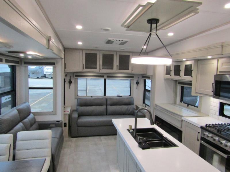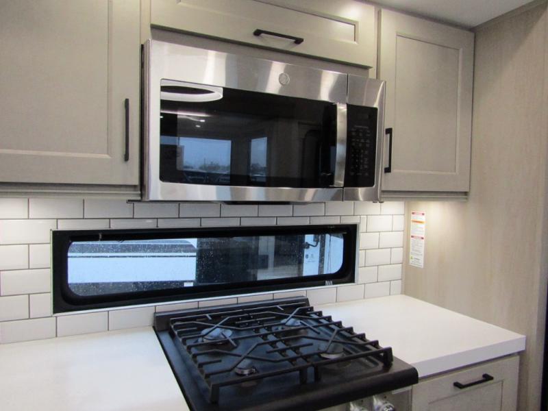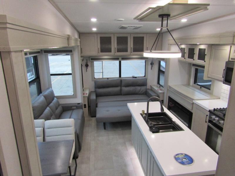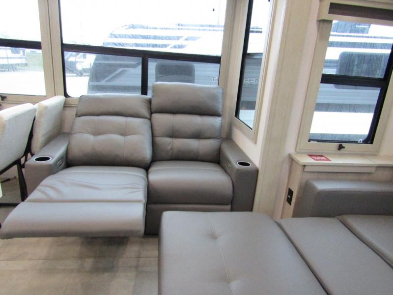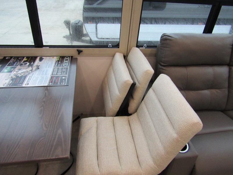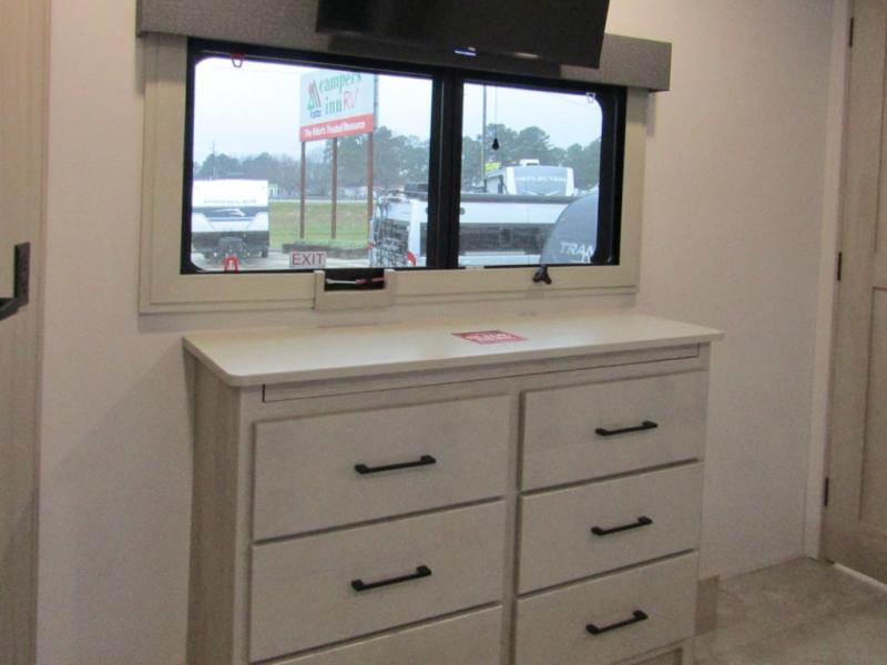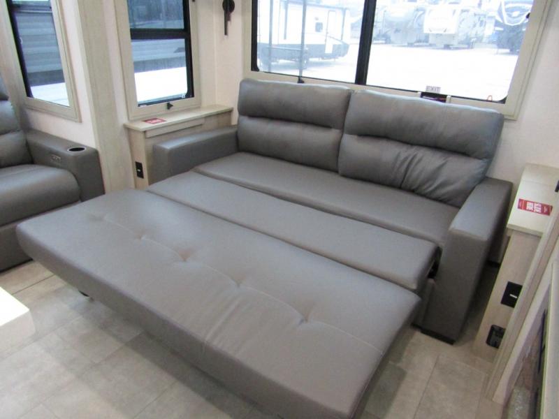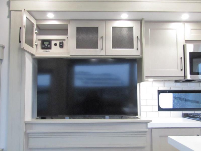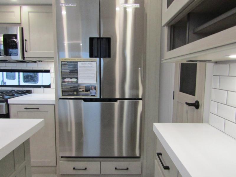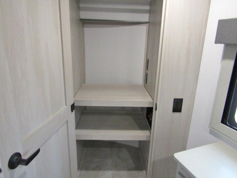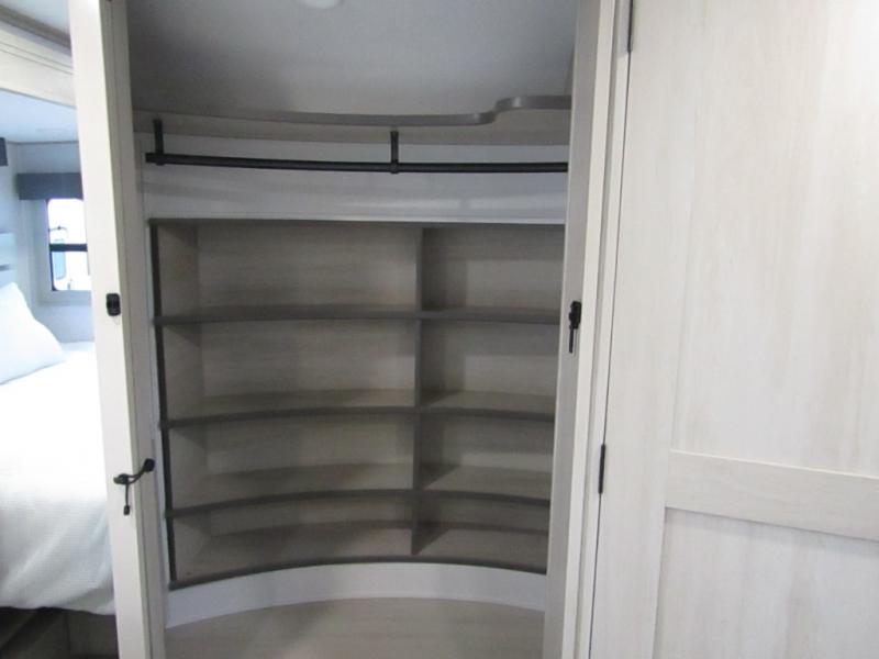 Traveling for long periods at a time is made easy with this gourmet kitchen that can feed your entire group a holiday meal! The professional-grade stainless steel cooktop with a built-in oven, microwave, 12V 20 cu. ft. refrigerator, and a kitchen island offers everything you will need to enjoy cooking for your family and guests. There is abundant storage throughout multiple overhead cabinets, a kitchen pantry and hutch, a bath linen cabinet for your towels, and in the front master bedroom which features a large closet. In the bedroom there is also a queen bed slide for added space to sleep comfortable at night, or you may choose an optional king bed if you enjoy more space. You will also find a closet with washer/dryer prep, large wardrobe, plus a slide top dresser. Two nice awnings will provide outdoor living space keeping you protected from the sun and rain, and you can add an optional pull-out kitchen to enjoy convenient cooking outdoors as well.