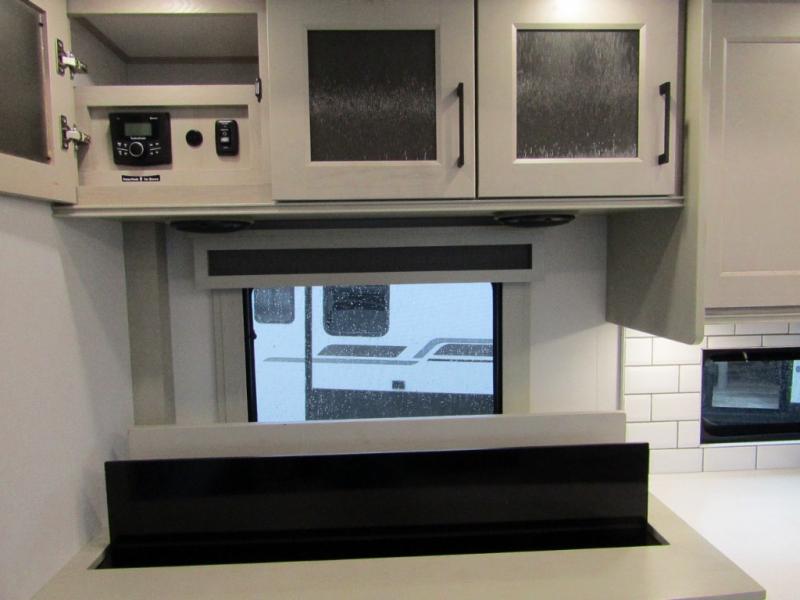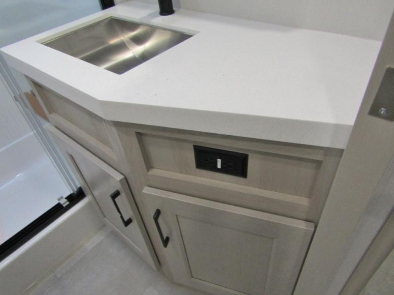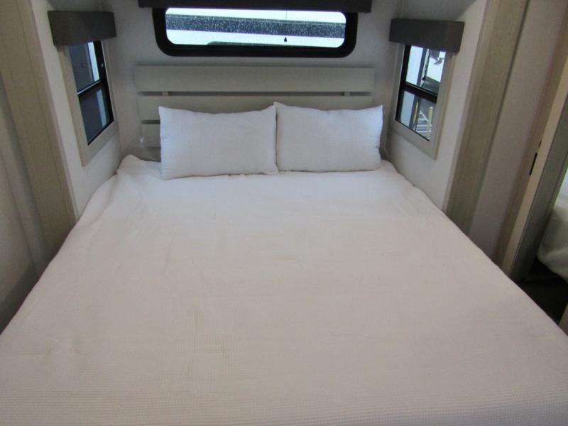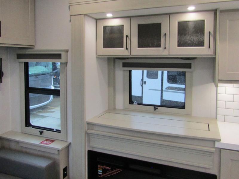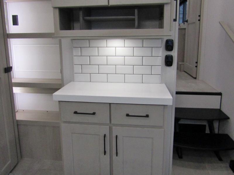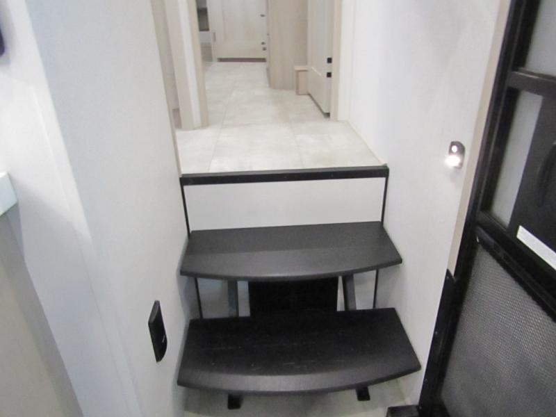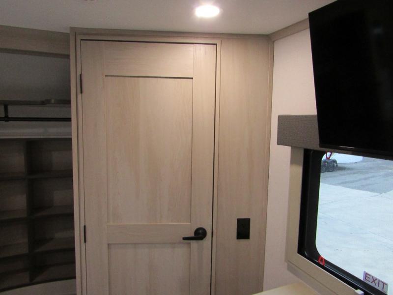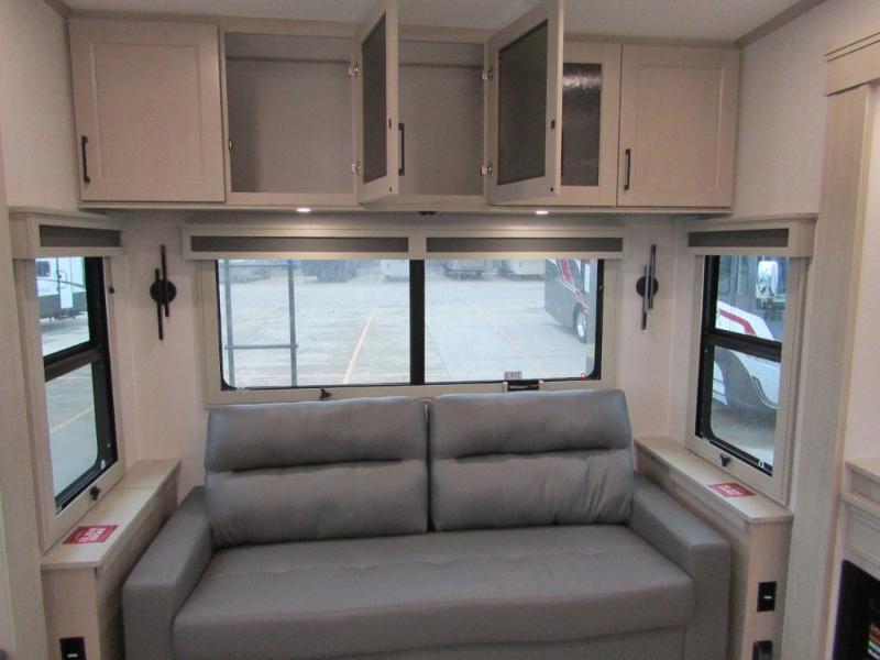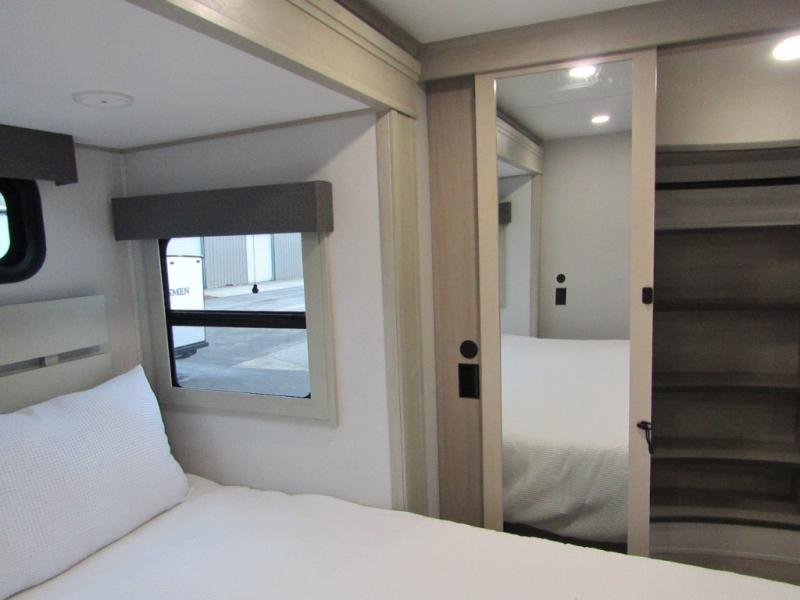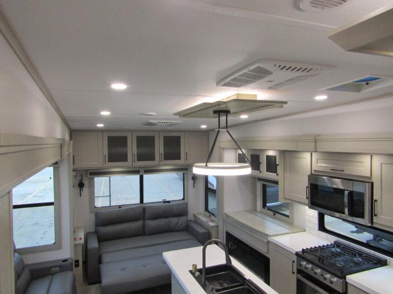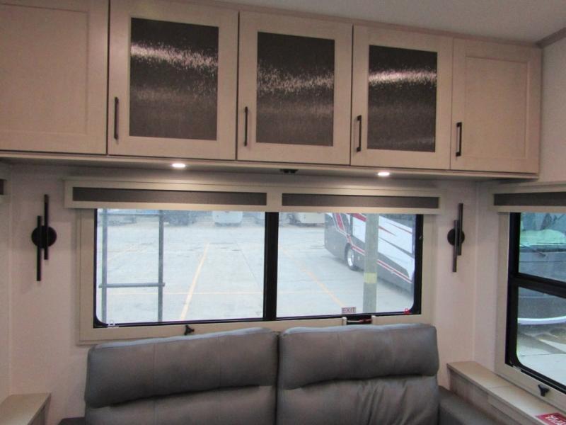 Traveling for long periods at a time is made easy with this gourmet kitchen that can feed your entire group a holiday meal! The professional-grade stainless steel cooktop with a built-in oven, microwave, 12V 20 cu. ft. refrigerator, and a kitchen island offers everything you will need to enjoy cooking for your family and guests. There is abundant storage throughout multiple overhead cabinets, a kitchen pantry and hutch, a bath linen cabinet for your towels, and in the front master bedroom which features a large closet. In the bedroom there is also a queen bed slide for added space to sleep comfortable at night, or you may choose an optional king bed if you enjoy more space. You will also find a closet with washer/dryer prep, large wardrobe, plus a slide top dresser. Two nice awnings will provide outdoor living space keeping you protected from the sun and rain, and you can add an optional pull-out kitchen to enjoy convenient cooking outdoors as well.