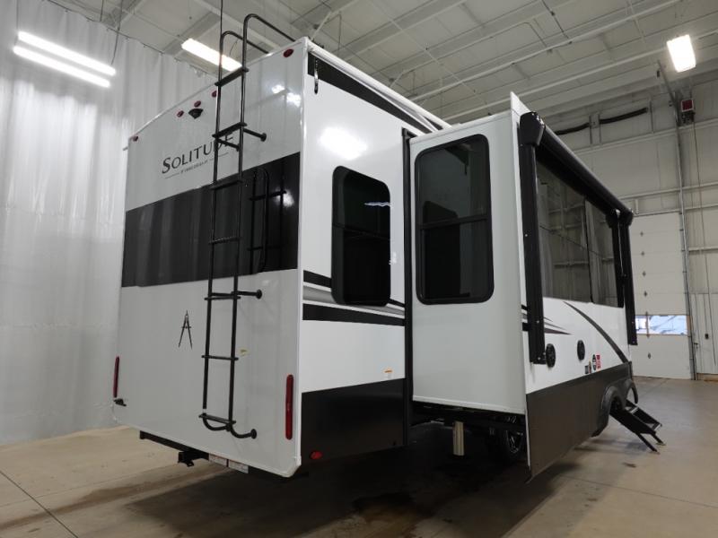 Each Solitude fifth wheel by Grand Design features a 101" wide-body construction, heavy duty 8,000 lb. axles, frameless tinted windows, and high-gloss gel coat sidewalls. You can camp year around thanks to the Weather-Tek Package that includes a 35K BTU high-capacity furnace, an all-in-one enclosed and heated utility center, and a fully enclosed underbelly with heated tanks and storage. Inside, you'll love the premium roller shades, hardwood cabinet doors, solid surface countertops, plus residential finishes throughout to make you truly feel at home. Each model also includes a MORryde CRE3000 suspension system, self adjusting brakes, and a MORryde pin box that will provide smooth towing from home to campground. Affordable luxury is possible with the Solitude fifth wheels; choose yours today!