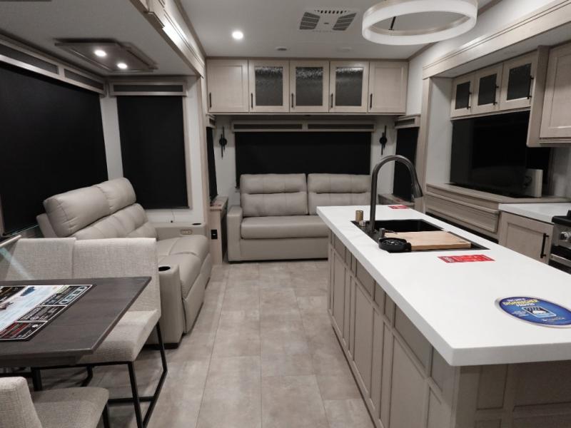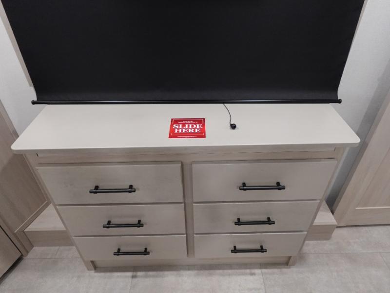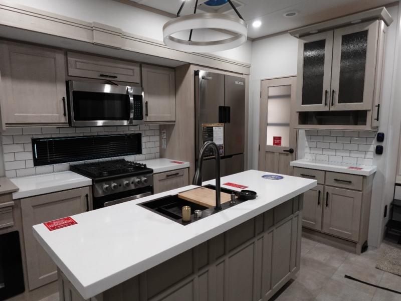 Traveling for long periods at a time is made easy with this gourmet kitchen that can feed your entire group a holiday meal! The professional-grade stainless steel cooktop with a built-in oven, microwave, 12V 20 cu. ft. refrigerator, and a kitchen island offers everything you will need to enjoy cooking for your family and guests. There is abundant storage throughout multiple overhead cabinets, a kitchen pantry and hutch, a bath linen cabinet for your towels, and in the front master bedroom which features a large closet. In the bedroom there is also a King bed slide for added space to sleep comfortable at night. You will also find a closet with washer/dryer prep, large wardrobe, a clothes hamper plus a slide top dresser. Two nice awnings will provide outdoor living space keeping you protected from the sun and rain.
