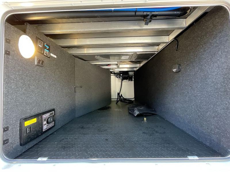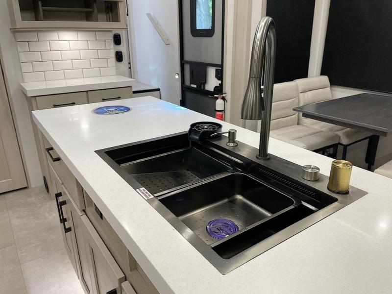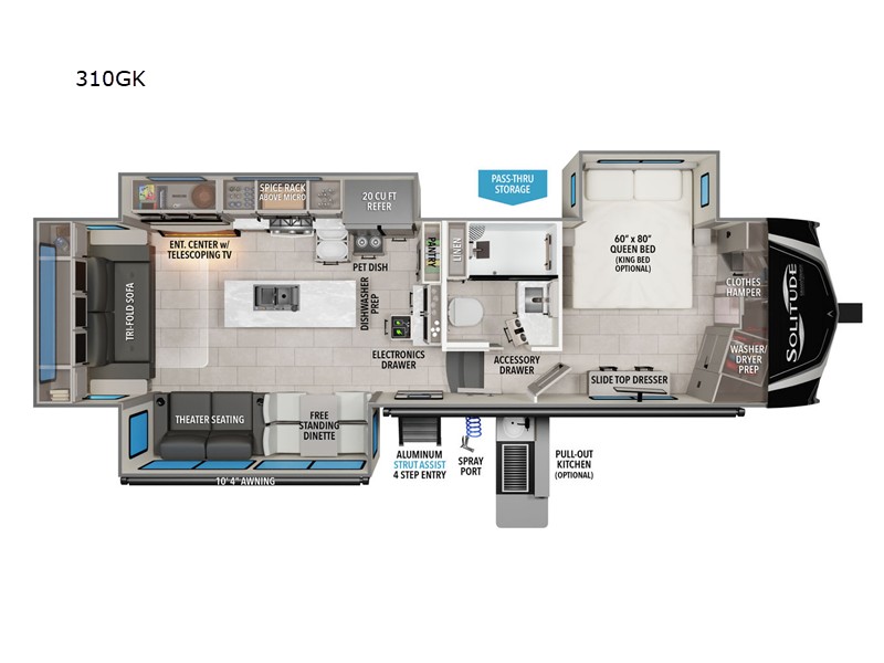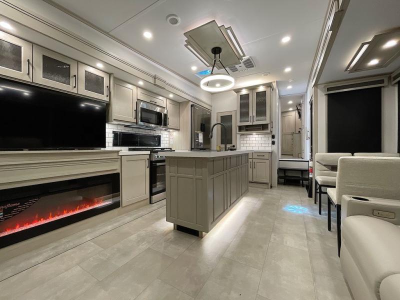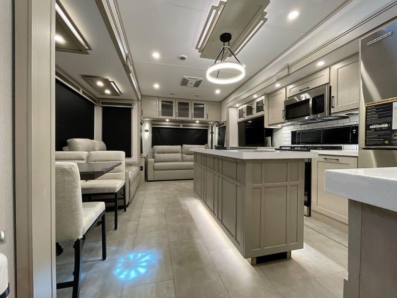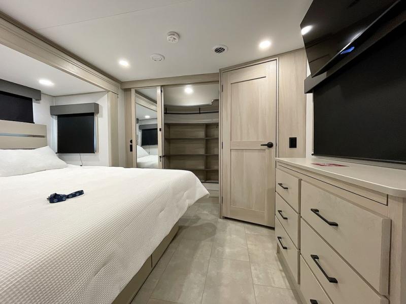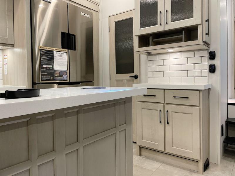 Traveling for long periods at a time is made easy with this gourmet kitchen that can feed your entire group a holiday meal! The professional-grade stainless steel cooktop with a built-in oven, microwave, 12V 20 cu. ft. refrigerator, and a kitchen island offers everything you will need to enjoy cooking for your family and guests. There is abundant storage throughout multiple overhead cabinets, a kitchen pantry and hutch, a bath linen cabinet for your towels, and in the front master bedroom which features a large closet. In the bedroom there is also a queen bed slide for added space to sleep comfortable at night, or you may choose an optional king bed if you enjoy more space. You will also find a closet with washer/dryer prep, large wardrobe, a clothes hamper plus a slide top dresser. Two nice awnings will provide outdoor living space keeping you protected from the sun and rain, and you can add an optional pull-out kitchen to enjoy convenient cooking outdoors as well.