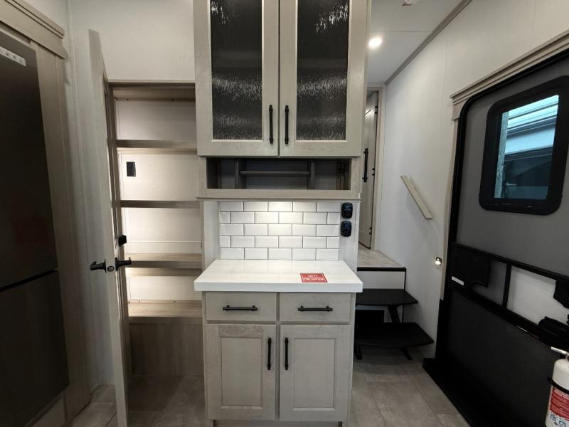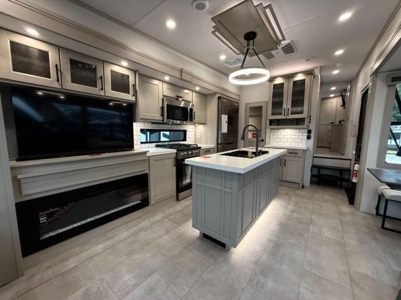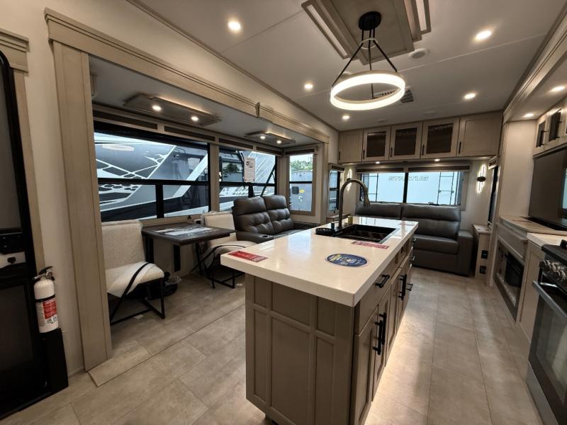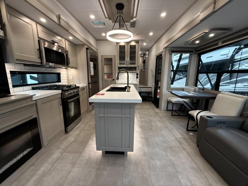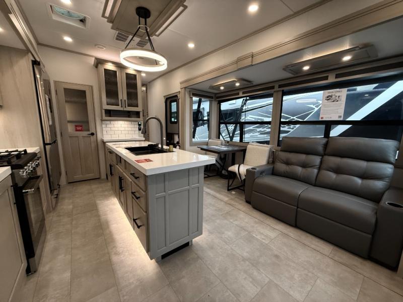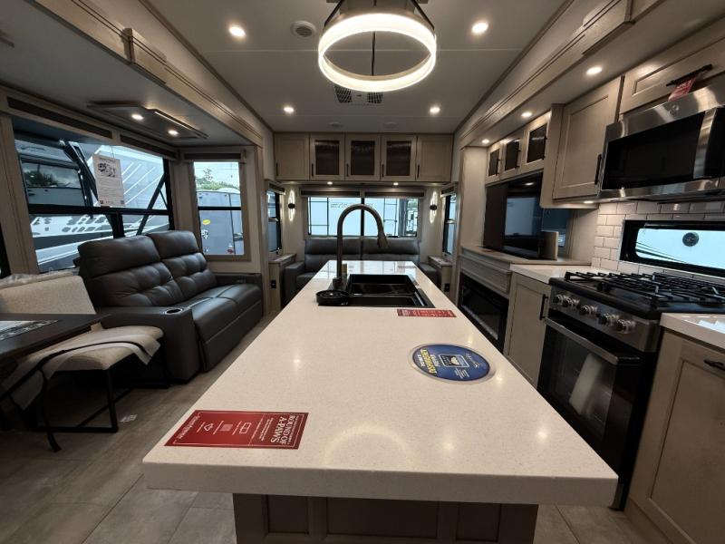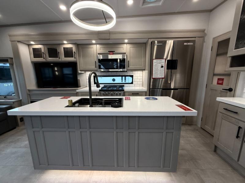 The Solitude 310GK combines residential luxury and long-haul durability for extended adventures. This fifth wheel features the upgraded Solar+ Package, three A/C units, and heavy-duty 8K axles with ABS drum brakes—giving you unmatched performance and comfort. The spacious interior includes a kitchen island, oversized pantry, and professional-grade appliances to make meal prep a pleasure, even on the road.