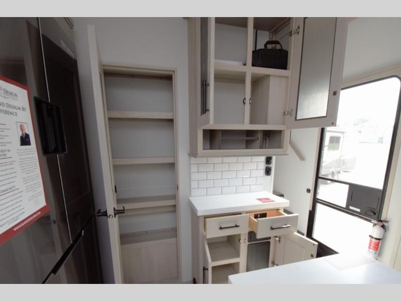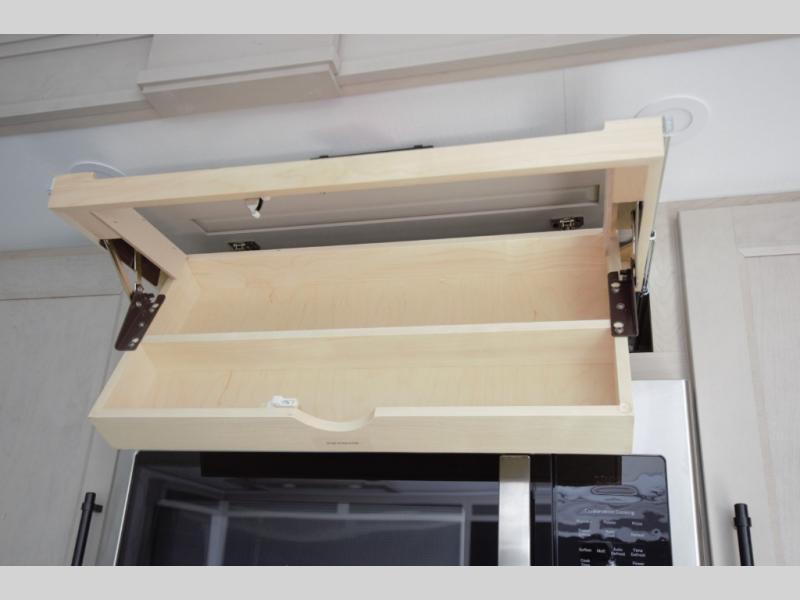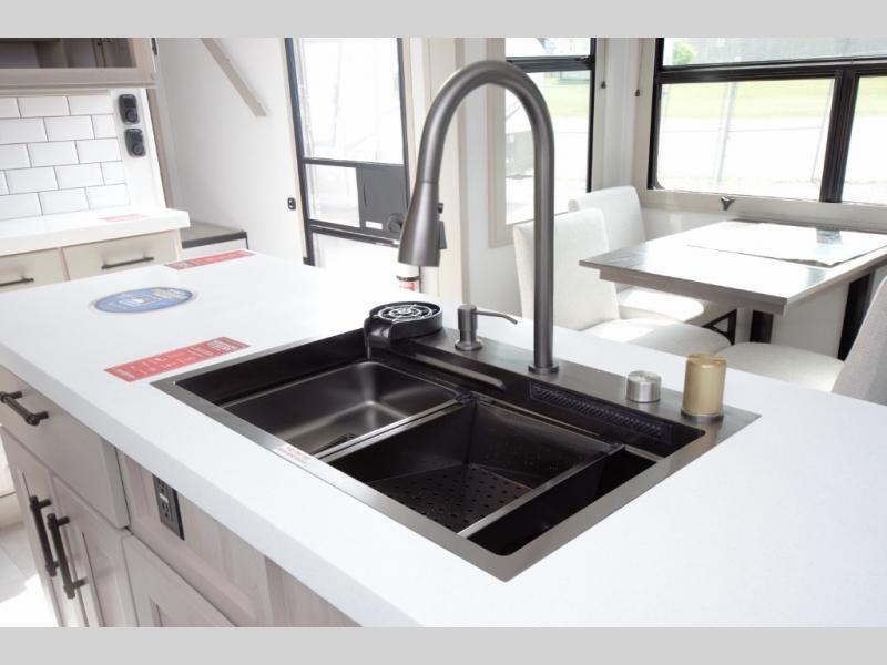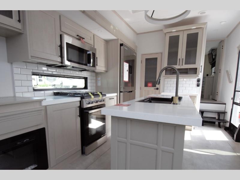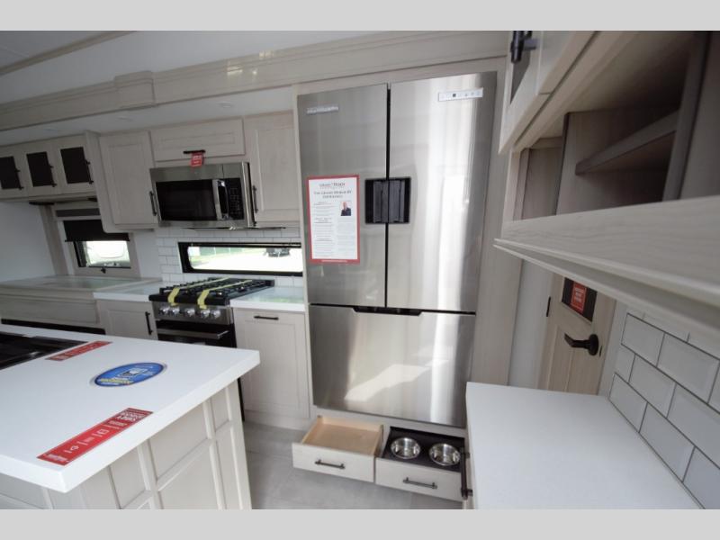 Enjoy the comforts of home with a full residential kitchen including a stainless steel cooktop, oven, microwave, and large twenty cubic foot 12V refrigerator. The oversized pantry and hutch provide plenty of storage for extended trips. A large center island offers additional prep space and storage.