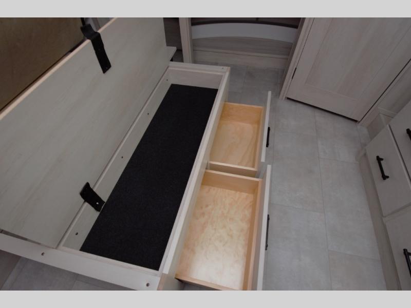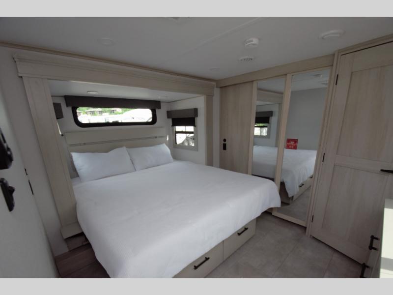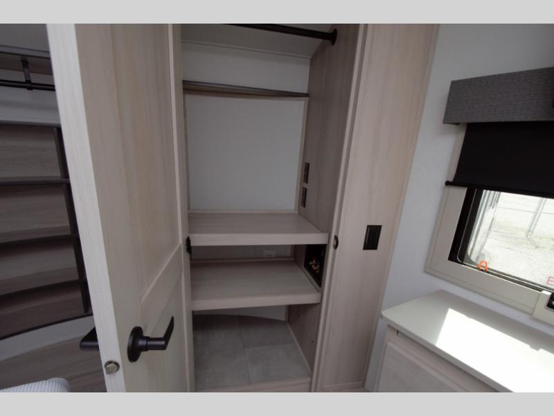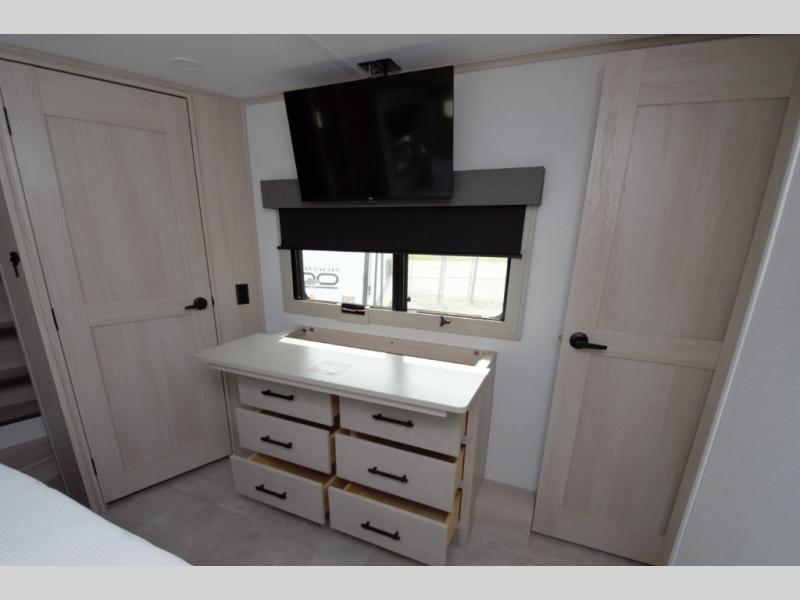 The front bedroom features a spacious slide with a queen bed and optional king bed upgrade. Enjoy a slide top dresser, large front wardrobe, washer dryer prep, and a built in hamper. This private bedroom offers the space and storage you need for long term stays.