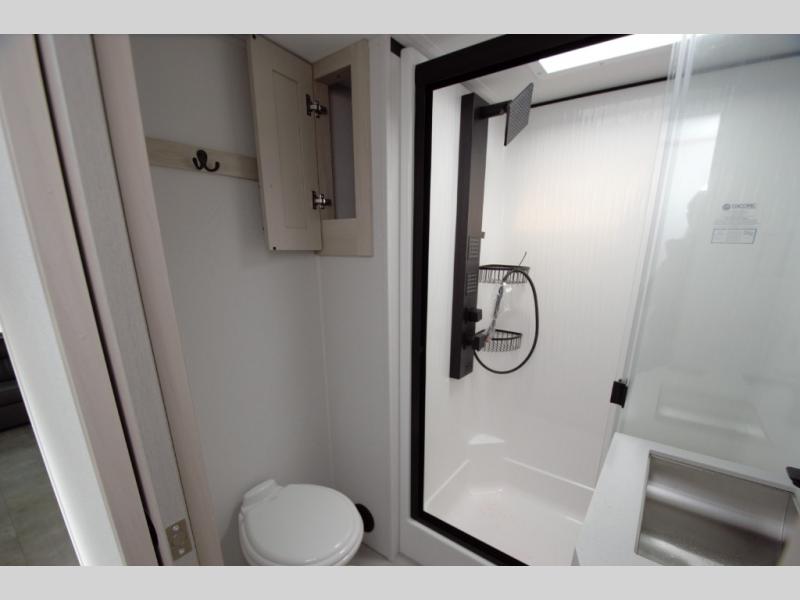 Built on a one hundred one inch wide body frame with eight thousand pound axles, frameless tinted windows, and high gloss gel coat sidewalls. Towing is smoother thanks to the MORryde CRE3000 suspension system and upgraded pin box.
