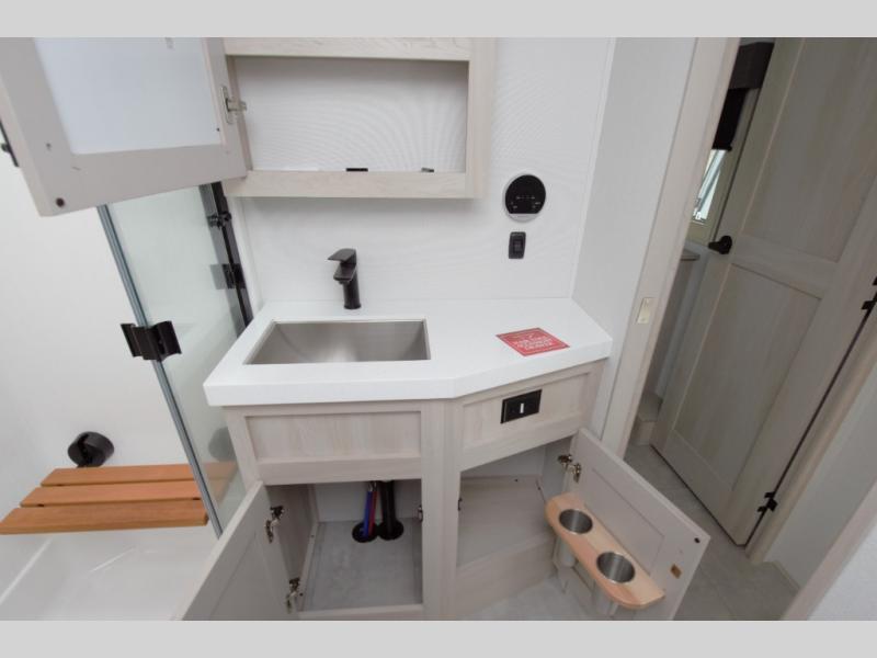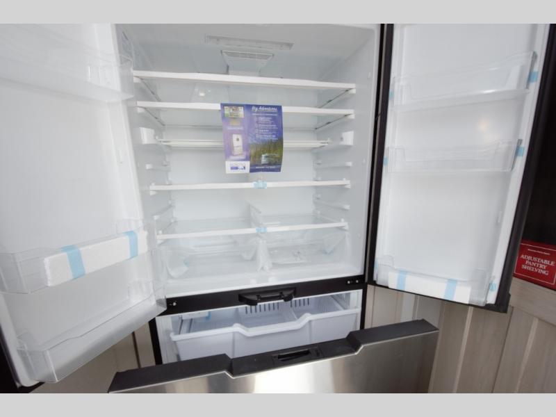 Enjoy the comforts of home with a full residential kitchen including a stainless steel cooktop, oven, microwave, and large twenty cubic foot 12V refrigerator. The oversized pantry and hutch provide plenty of storage for extended trips. A large center island offers additional prep space and storage.