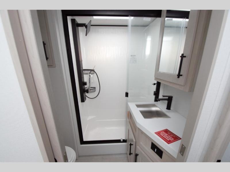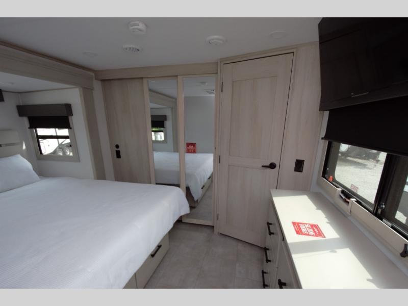 The front bedroom features a spacious slide with a queen bed and optional king bed upgrade. Enjoy a slide top dresser, large front wardrobe, washer dryer prep, and a built in hamper. This private bedroom offers the space and storage you need for long term stays.